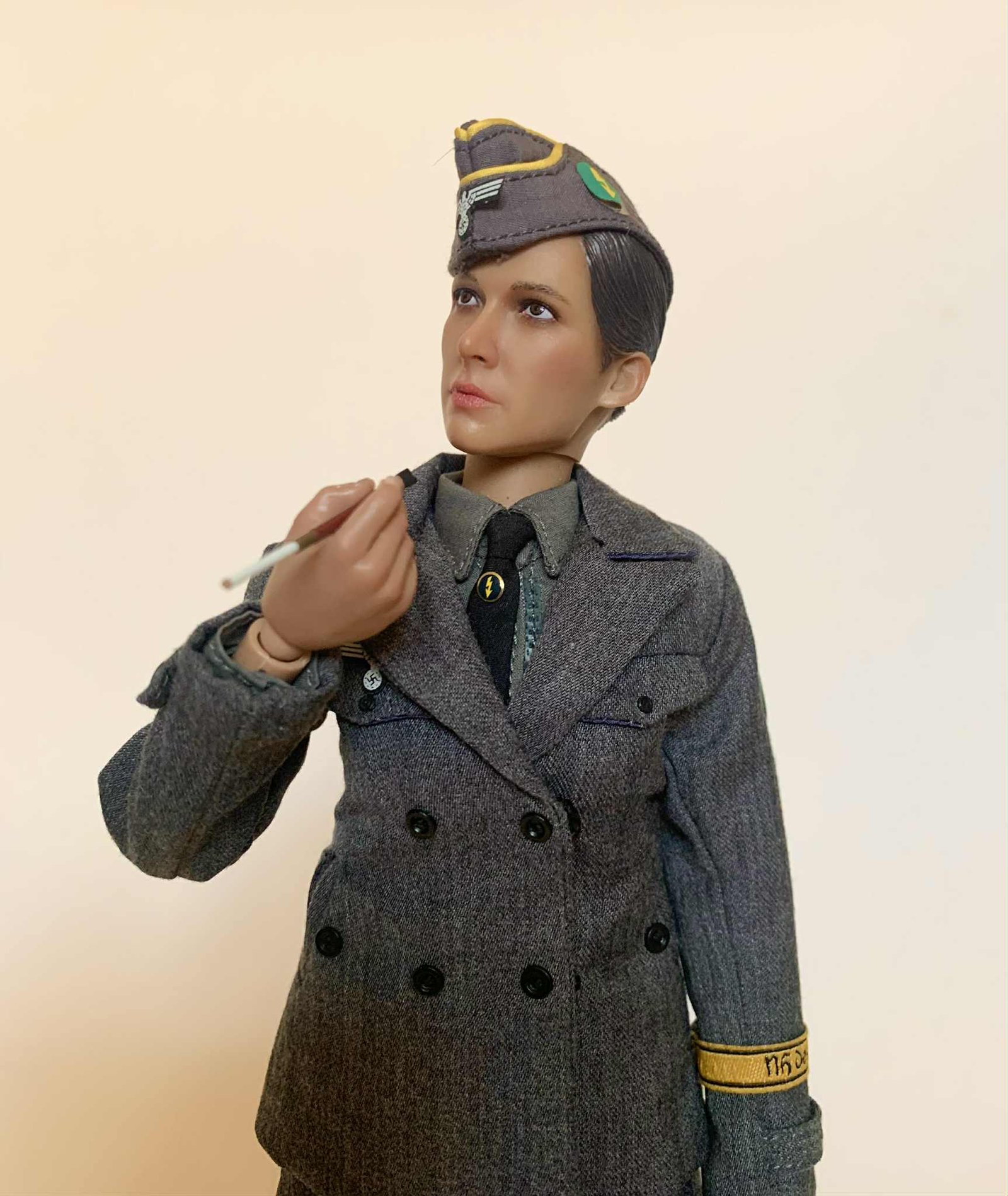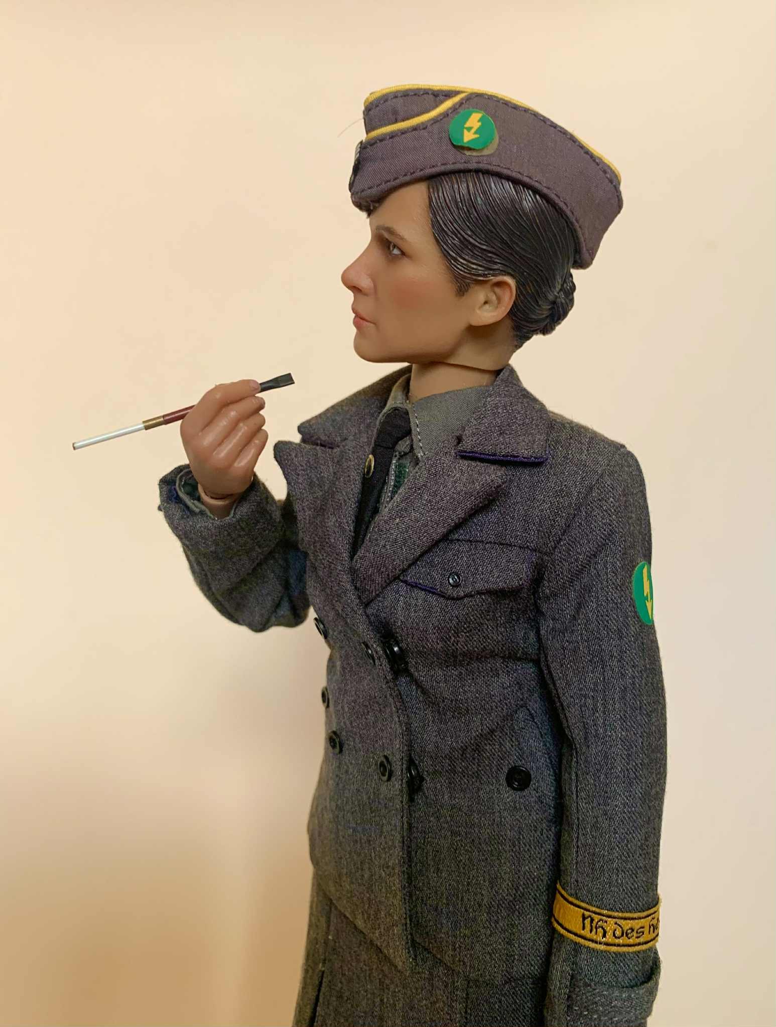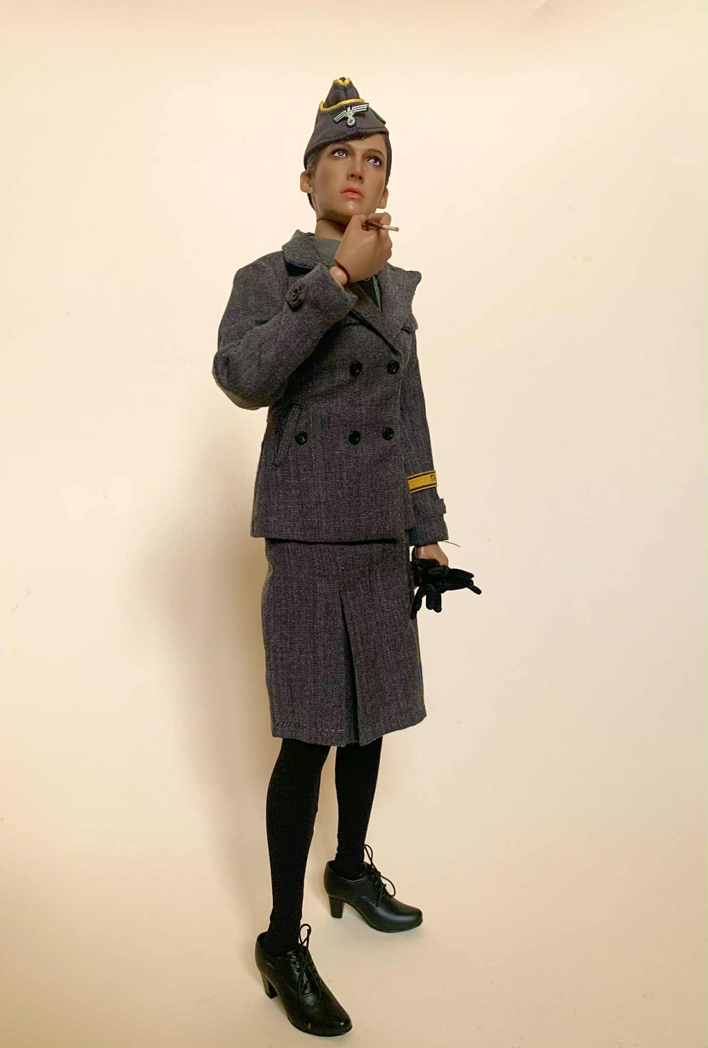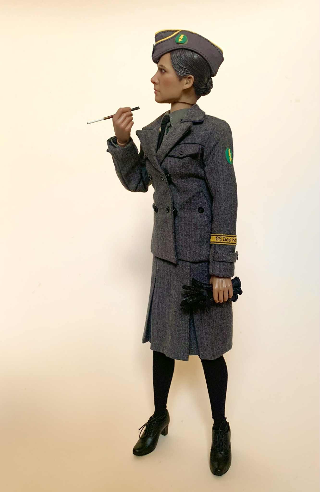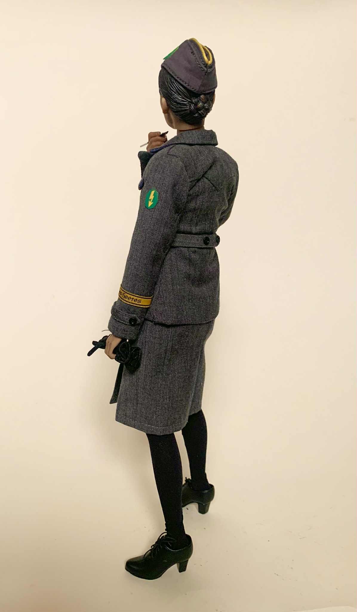 Funkcjonariuszka pomocniczej służby kobiecej wojsk lądowych - służba łączności ubrana w mundur służbowy składający się z loszuli, żakietu i spódnicy koloru stalowoszarego, czarnych pończoch, czarnych półbutów na wysokim obcasie oraz furażerki na głowie. Po lewej stronie furażerki i na lewym ramieniu naszywki służby łączności. Oznaczenie służby także w postaci wpinki na krawacie. Nad lewym mankietem rękawa opaska służby pomocniczej wojsk lądowych.
