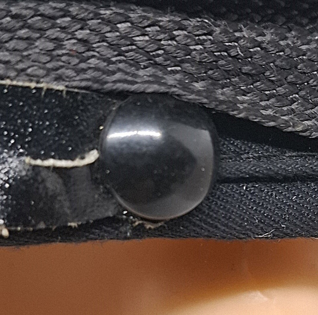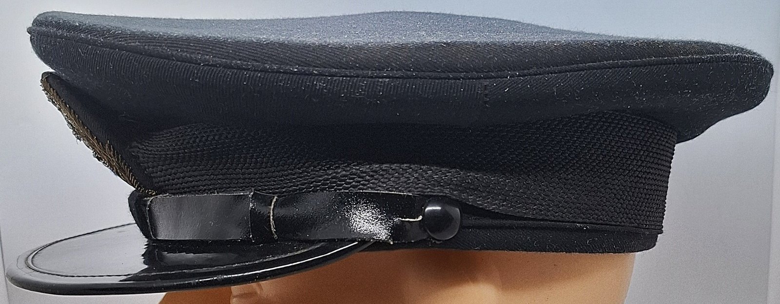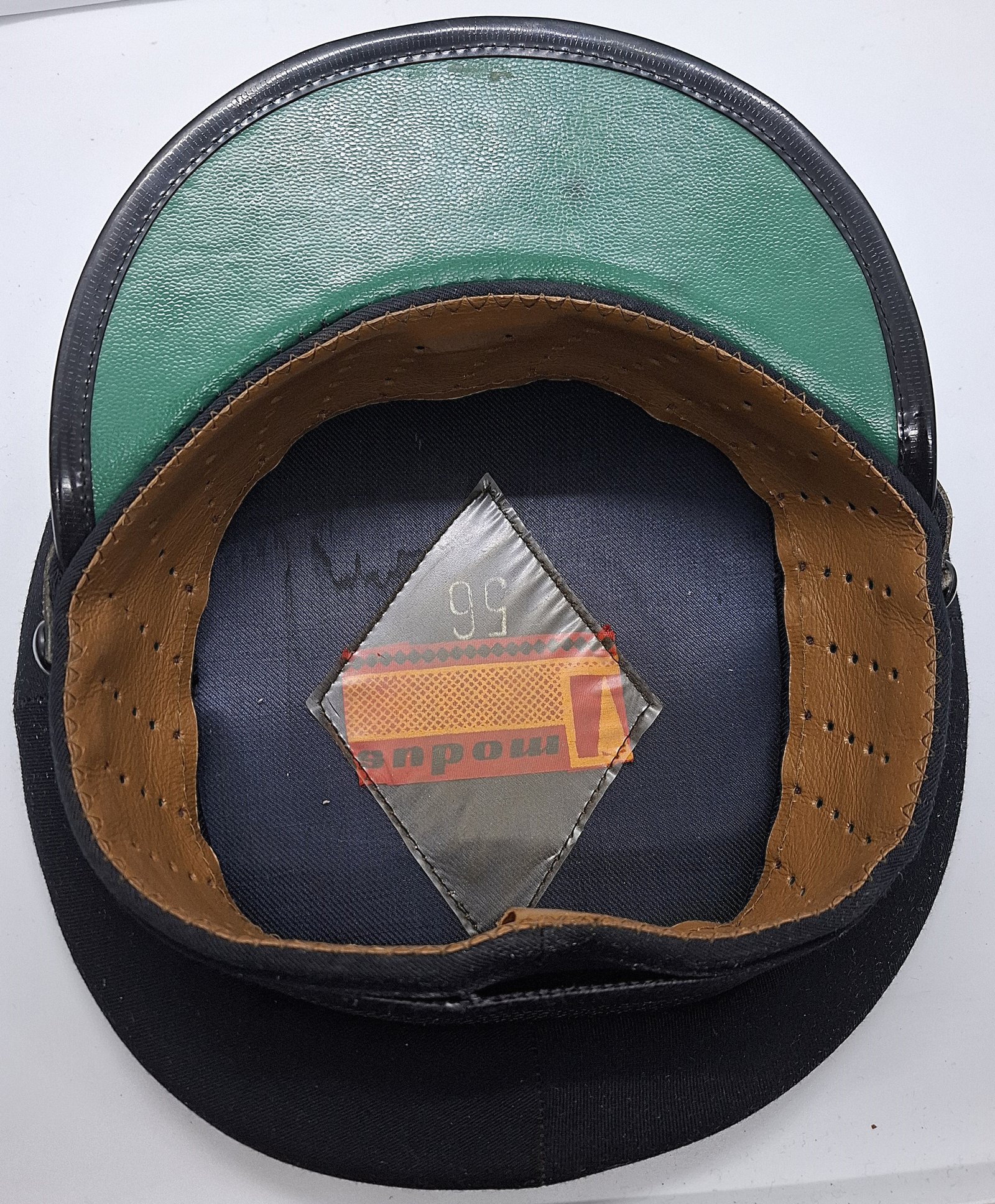 Czapka garnizonowa jest koloru czarnego (granatowego). Daszek z tworzywa sztucznego z usztywnieniem i ceratowy pasek są koloru czarnego. Pasek dwuczęściowy regulowany na szlufki. Pasek przypięty guzikami z wąsami, wykonane z tworzywa sztucznego, gładkie, czarne o średnicy 14 mm. Wewnątrz potnik skórzany, brązowy, perforowany. Wnętrze wyłożone atłasowym materiałem w granatowym odcieniu. W denku transparentny romb z tworzywa stanowiący osłonę przed potem. Pod nim metka producenta i rozmiaru. Rondo czapki napięte jest igielitowym(?) prętem zapewniającym regularny owal. Otok czapki materiałowy w kolorze czarnym. Na nim taśma otokowa z grubszego splotu w kolorze czarnym, do którego przyszyty jest orzeł. Stopień haftowany bajorkiem, umieszczony na pasku. Otok wsparty jest na czapce ślepą wypustką (dzierga) zabezpieczającą przed zsuwaniem. Daszek z góry obszyty gładkim, czarnym tworzywem. Od spodu, zielonym, porowatym. Rant daszka obszyty gładkim, czarną, tworzywową lamówką.