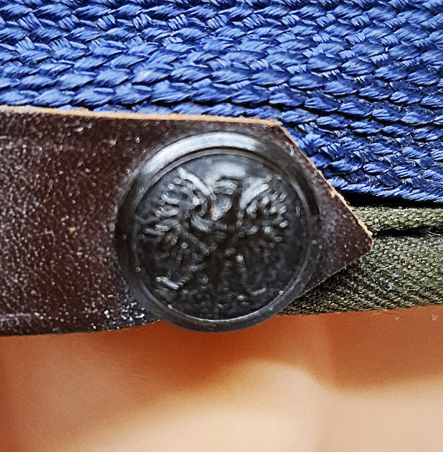 7 - pasek skórzany w kolorze daszka o szerokości 16 mm, dwuczęściowy, ze sprzączką;