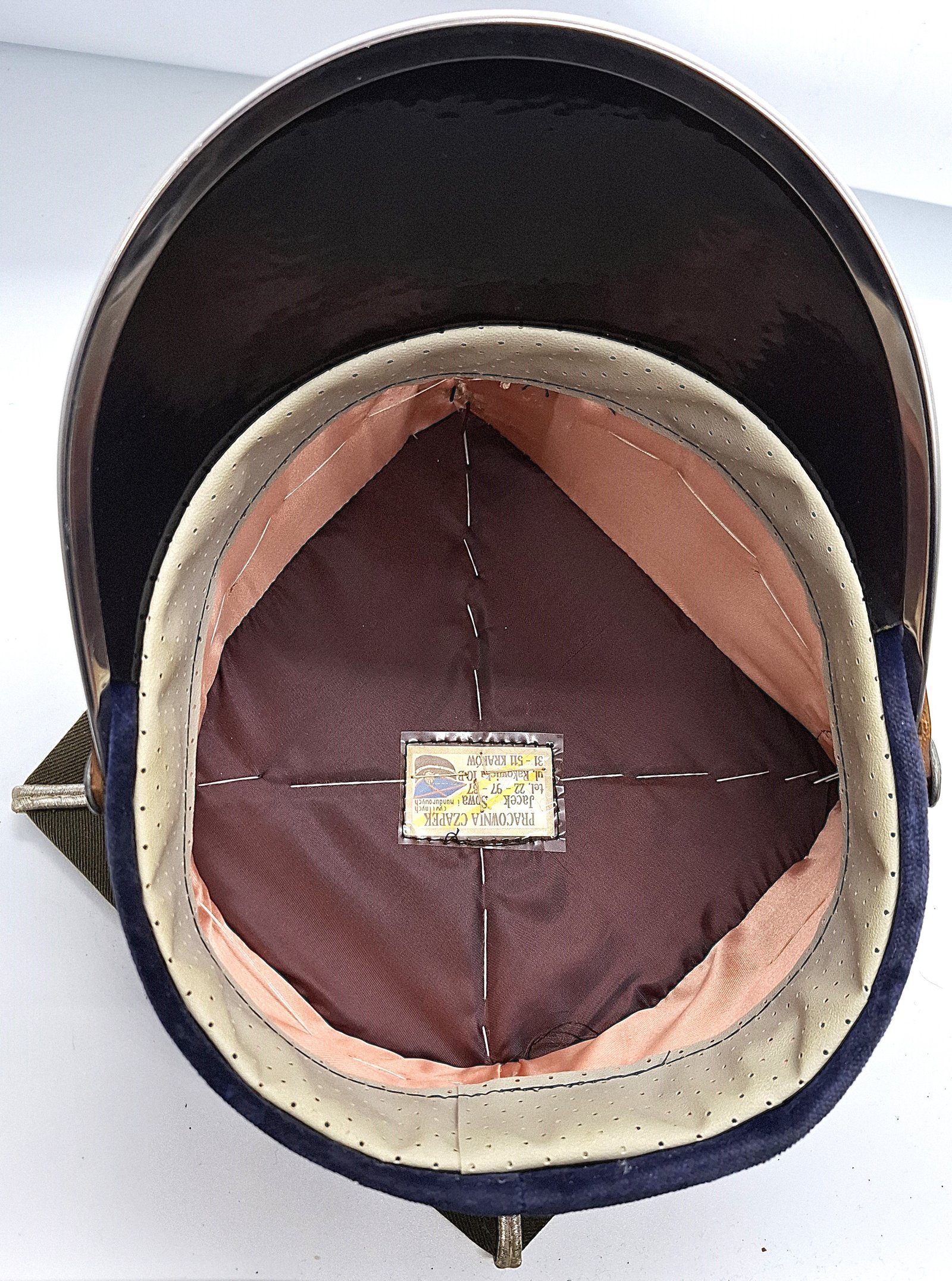 Rogatywka wykonana z gabardyny w kolorze khaki. Denko czapki ma kształt czworokąta foremnego. Przedni i lewy róg uniesione, pozostałe obniżone na wysokość górnej krawędzi otoku. Brak usztywnienia przednich kwater. Srebrny galon na górnej krawędzi otoku oraz na zszyciu kwater i denka. Wnętrze czapki wyłożone atłasowym materiałem w kolorze różowym (otok) i bordowym (denko). W denku, na jedwabnej podszewce, wszyta metka producenta osłonięta folią. Dno czapki napięte jest prętem zapewniającym kształt kwadratu. Daszek tworzywowy koloru czarnego. Z góry gładki, od spodu także gładki. Taśma otokowa w kolorze granatowym, wykonana z zamszu (otok obszyty taśmą otokową). Na dolnej krawędzi taśmy otokowej nad daszkiem znajduje się pasek skórzany koloru czarnego, zapinany na metalową sprzączkę. Pasek przypięty guzikami z wąsami, wykonane z metalu z wizerunkiem orła z koroną wzoru państwowego o średnicy 16 mm. Wewnątrz potnik ze sztucznej skóry, perforowany. Na rancie daszka charakterystyczne metalowe okucie.