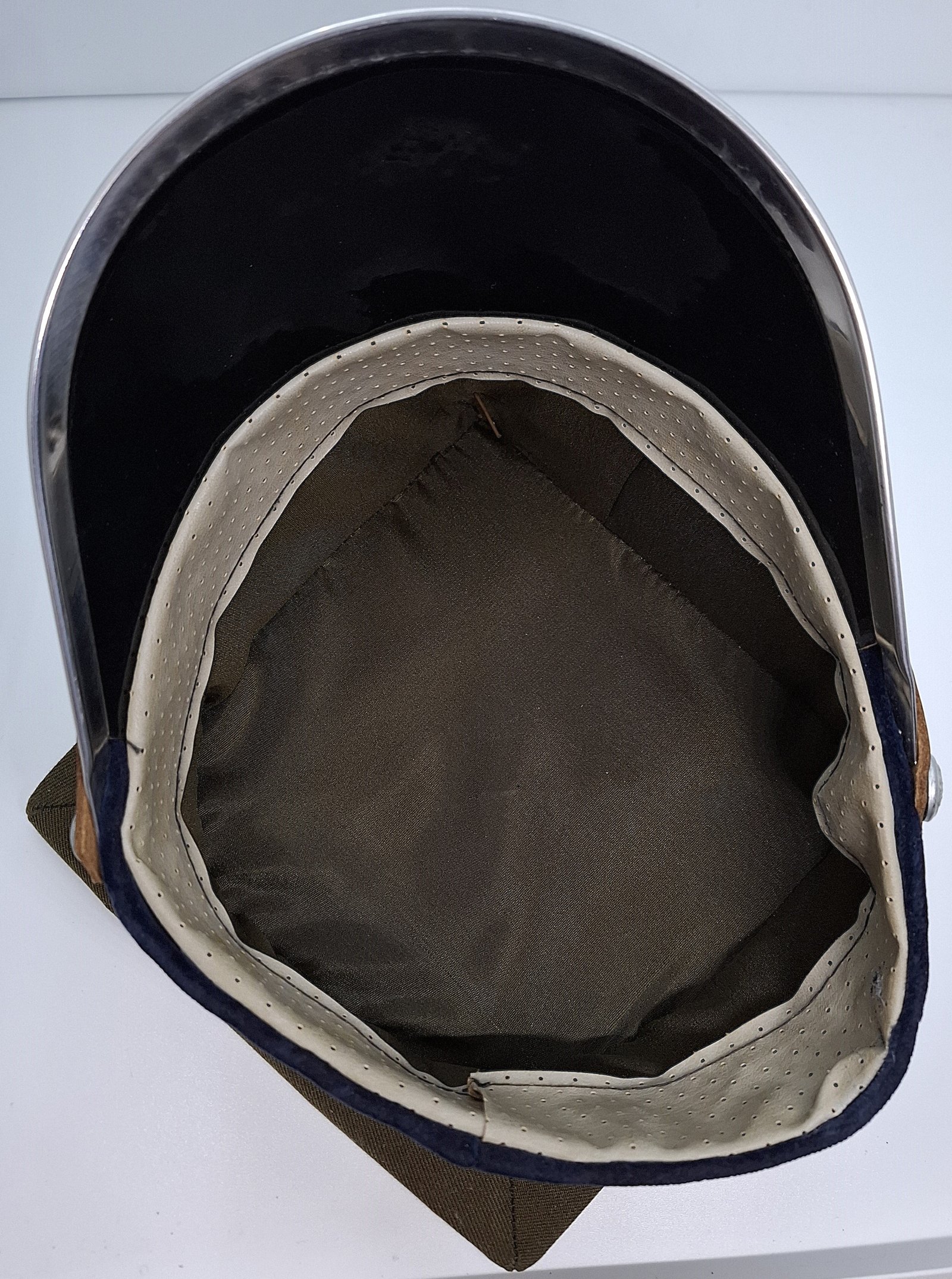 Rogatywka wykonana z gabardyny w kolorze khaki. Denko czapki ma kształt czworokąta foremnego. Przedni i lewy róg uniesione, pozostałe obniżone na wysokość górnej krawędzi otoku. Brak usztywnienia przednich kwater. Srebrny galon na górnej krawędzi otoku oraz na zszyciu kwater i denka. Wnętrze czapki wyłożone atłasowym materiałem w odcieniu brązowym. Dno czapki napięte jest prętem zapewniającym kształt kwadratu. Daszek tworzywowy koloru czarnego. Z góry gładki, od spodu także gładki. Taśma otokowa w kolorze granatowym, wykonana z zamszu (otok obszyty taśmą otokową). Na dolnej krawędzi taśmy otokowej nad daszkiem znajduje się pasek skórzany koloru czarnego, zapinany na metalową sprzączkę. Pasek przypięty guzikami z wąsami, wykonane z tworzywa z wizerunkiem orła bez korony wzoru państwowego o średnicy 16 mm - malowane na srebrno. Wewnątrz potnik ze sztucznej skóry, perforowany. Na rancie daszka charakterystyczne metalowe okucie.