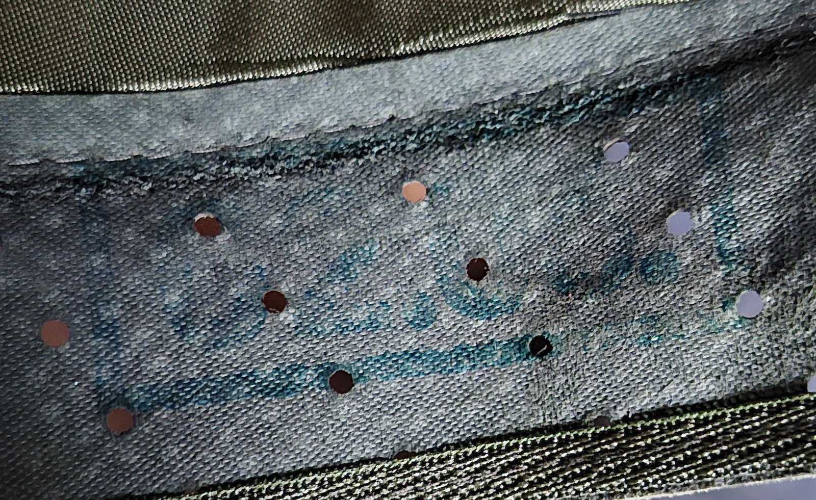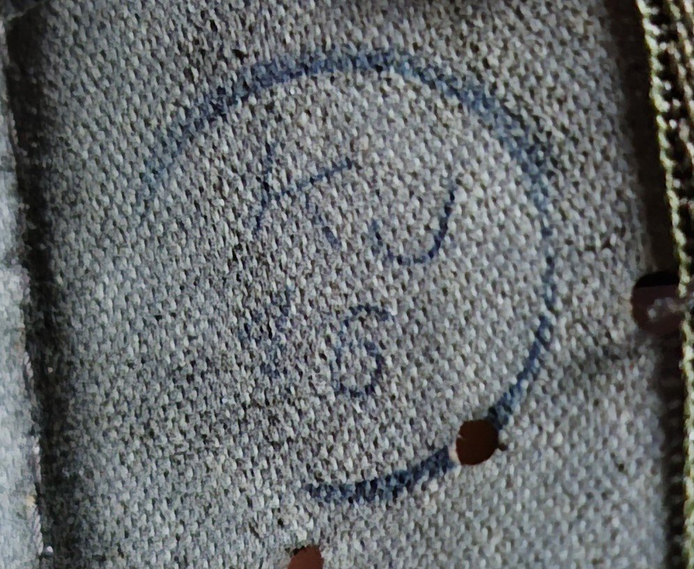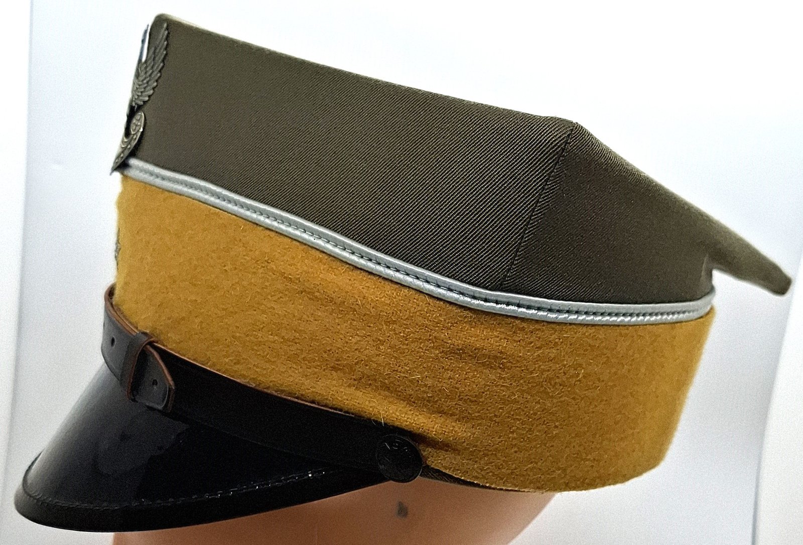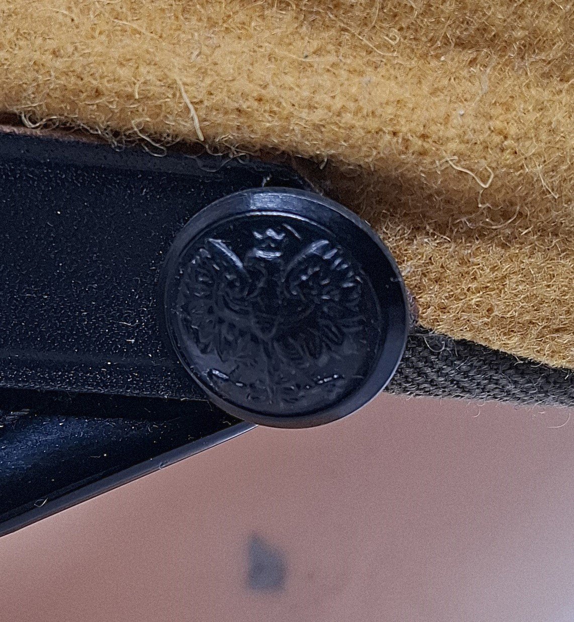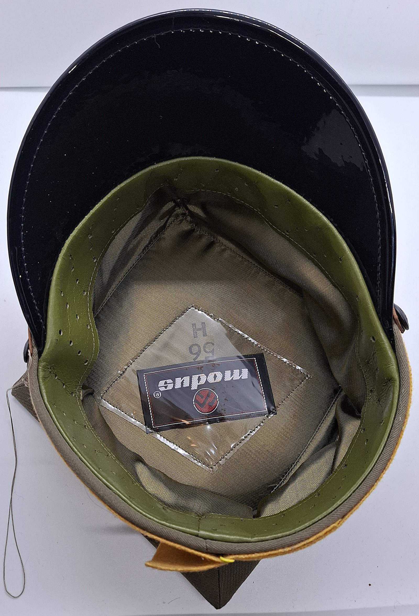 Rogatywka wykonana z gabardyny w kolorze khaki. Denko czapki ma kształt czworokąta foremnego. Przedni i lewy róg uniesione, pozostałe obniżone na wysokość górnej krawędzi otoku. Przednie kwatery usztywnione usztywniaczem krawieckim, filcem? Wnętrze czapki wyłożone jedwabnym materiałem w jaśniejszym odcieniu materiału zasadniczego. W denku, na jedwabnej podszewce, wszyty tworzywowy transparentny romb zabezpieczający przed potem. Pod nim znajduje się metka z danymi producenta i niżej rozmiarem. Dno czapki napięte jest prętem zapewniającym kształt kwadratu. Daszek tworzywowy koloru czarnego. Z góry gładki, od spodu także gładki, obszyty wąskim paskiem na rancie. Taśma otokowa w kolorze żółtym, wykonana z tkaniny wełnianej - sukna. Nad otokiem srebrny galon. Na dolnej krawędzi taśmy otokowej nad daszkiem znajduje się pasek skórzany koloru czarnego, zapinany na metalową sprzączkę. Pasek przypięty guzikami z wąsami wykonanymi z tworzywa sztucznego z wizerunkiem orła z koroną wzoru państwowego w kolorze czarnym o średnicy 16 mm. Wewnątrz potnik skórzany perforowany. Wewnątrz potnika stempel z kontrolą jakości i datą.