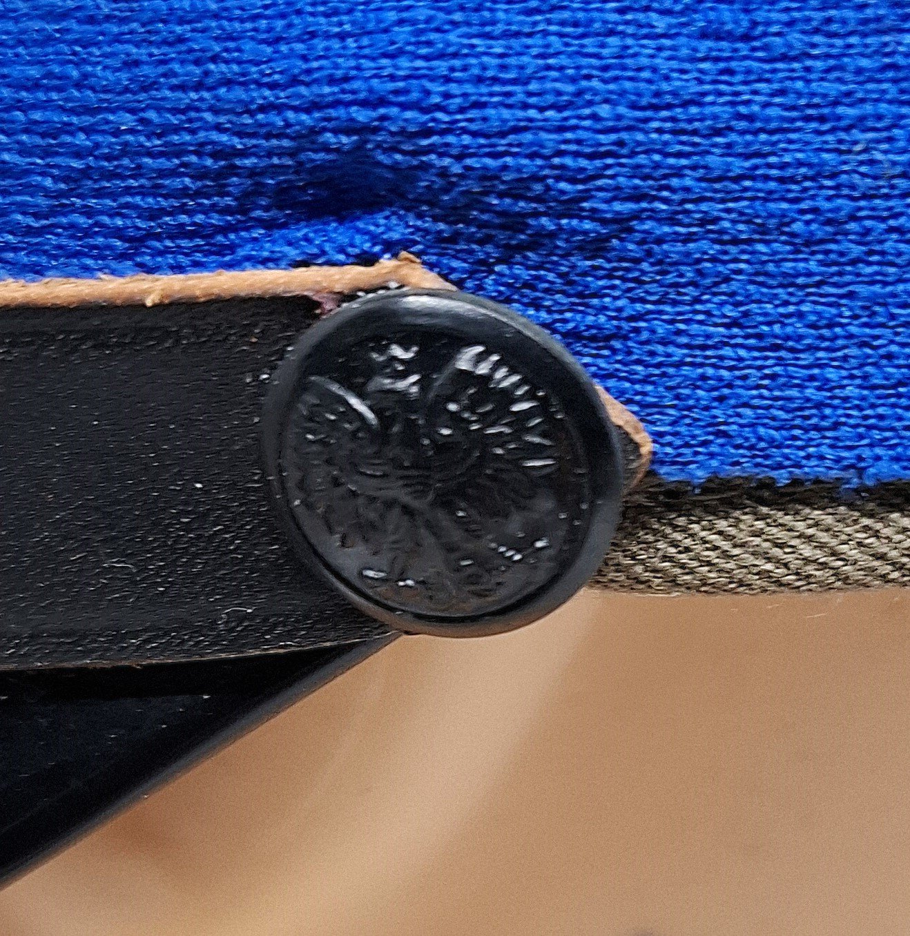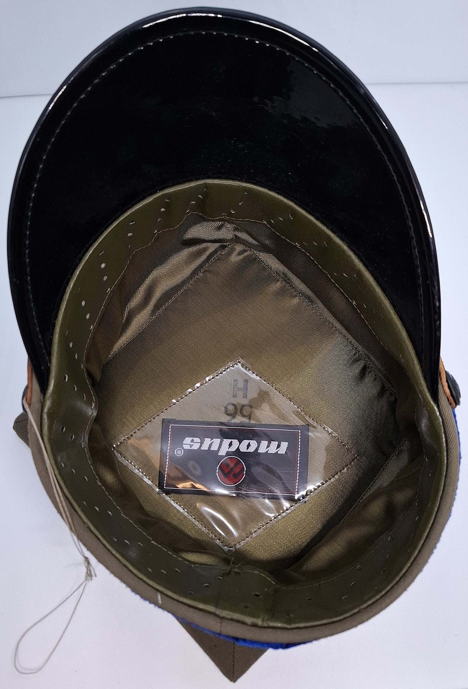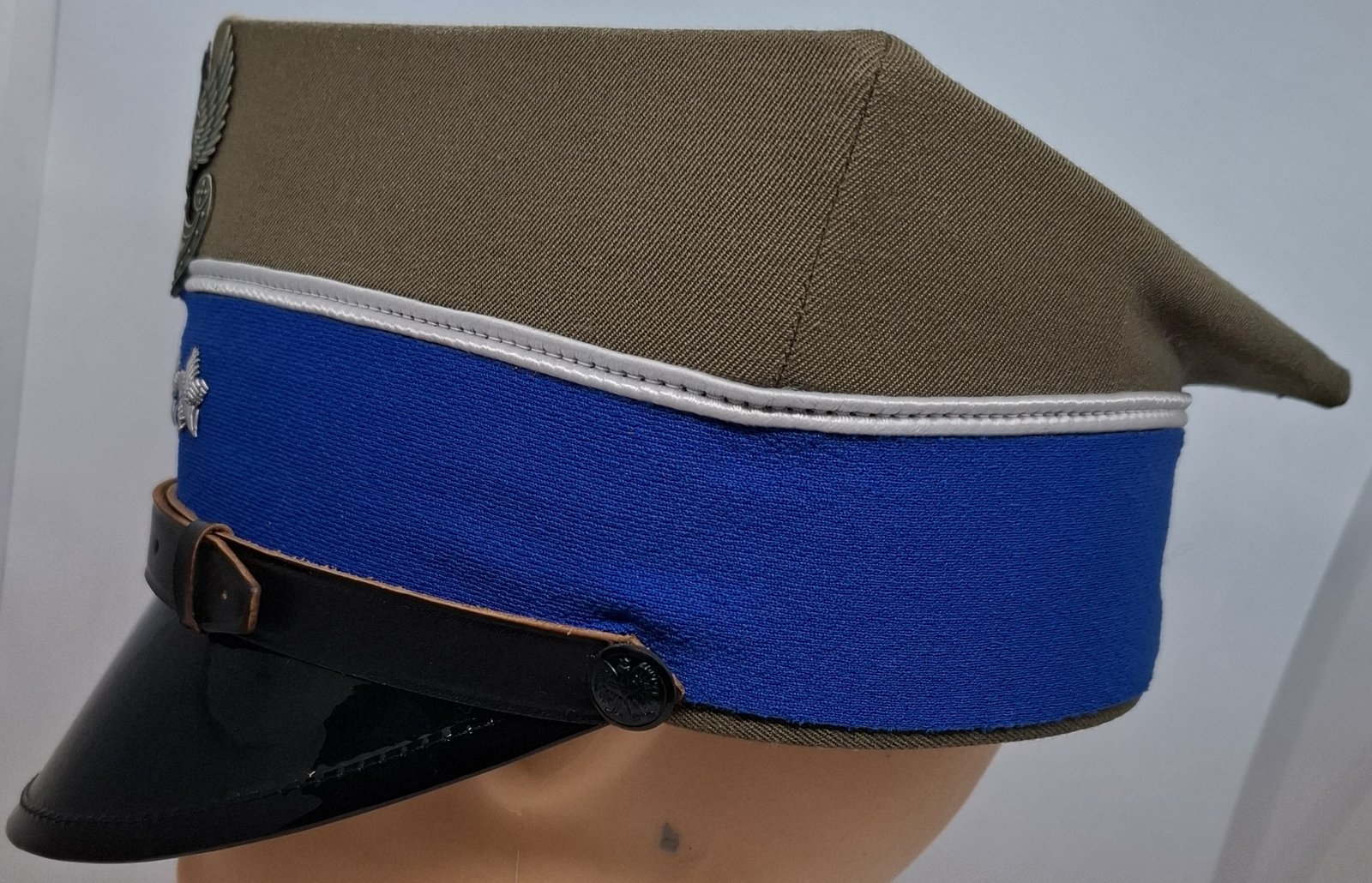 Rogatywka wykonana z gabardyny w kolorze khaki. Denko czapki ma kształt czworokąta foremnego. Przedni i lewy róg uniesione, pozostałe obniżone na wysokość górnej krawędzi otoku. Przednie kwatery usztywnione usztywniaczem krawieckim, filcem? Wnętrze czapki wyłożone jedwabnym materiałem w jaśniejszym odcieniu materiału zasadniczego. W denku, na jedwabnej podszewce, wszyty tworzywowy transparentny romb zabezpieczający przed potem. Pod nim znajduje się metka z danymi producenta, niżej stempel z rozmiarem. Dno czapki napięte jest prętem zapewniającym kształt kwadratu. Daszek tworzywowy koloru czarnego. Z góry gładki, od spodu także gładki, obszyty wąskim paskiem na rancie. Taśma otokowa w kolorze czarnym, wykonana z tkaniny wełnianej - sukna wyłogowego art. W-0419/p.1780. Nad otokiem srebrny galon. Na dolnej krawędzi taśmy otokowej nad daszkiem znajduje się pasek skórzany koloru czarnego, zapinany na metalową sprzączkę. Pasek przypięty guzikami z wąsami, wykonane z metalu z wizerunkiem orła z koroną wzoru państwowego w kolorze granatowym o średnicy 16 mm. Wewnątrz potnik skórzany perforowany. Od wewnętrznej strony potnika stempel z datą.