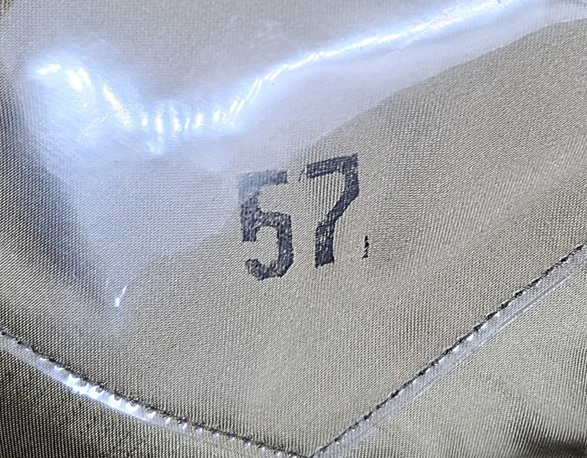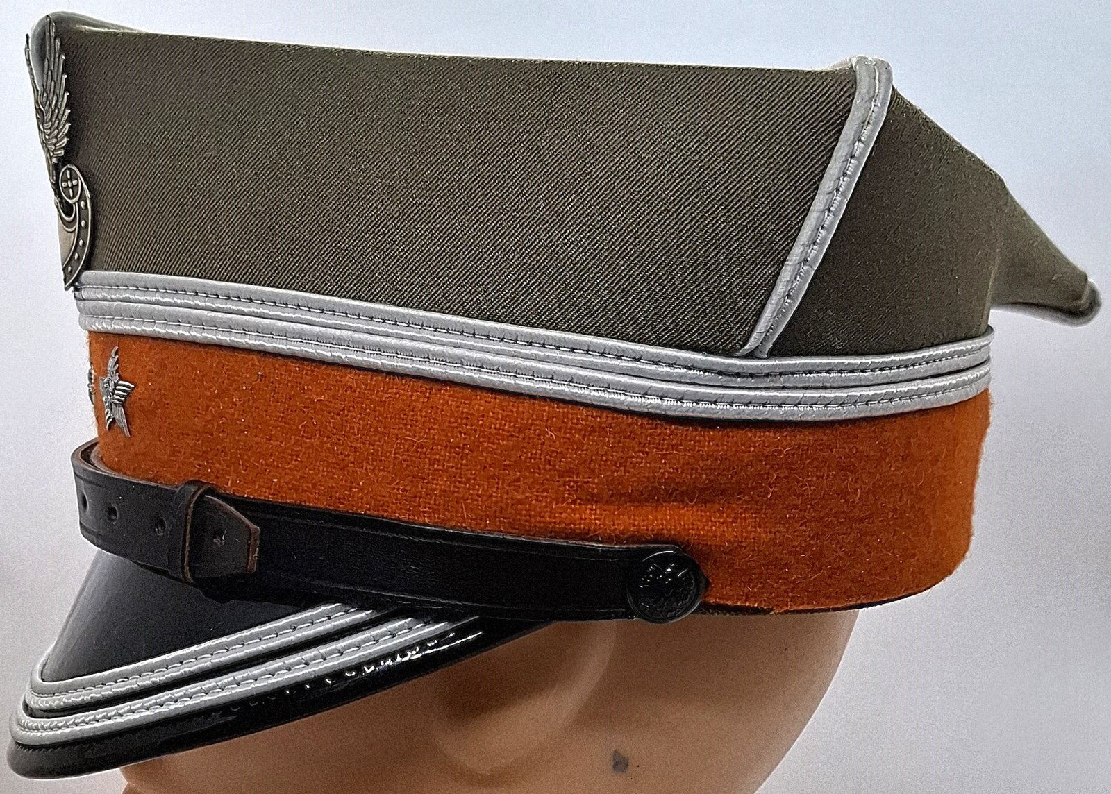 Rogatywka galowa wykonana z gabardyny w kolorze khaki. Denko czapki ma kształt czworokąta foremnego. Przedni i lewy róg uniesione, pozostałe obniżone na wysokość górnej krawędzi otoku. Przednie kwatery usztywnione usztywniaczem krawieckim, filcem? Wnętrze czapki wyłożone jedwabnym materiałem w jaśniejszym odcieniu materiału zasadniczego. W denku, na jedwabnej podszewce, wszyty tworzywowy transparentny romb zabezpieczający przed potem. Pod nim znajduje się stempel z rozmiarem. Dno czapki napięte jest prętem zapewniającym kształt kwadratu. Daszek tworzywowy koloru czarnego. Z góry gładki, od spodu także gładki, obszyty wąskim paskiem na rancie. Taśma otokowa w kolorze pomarańczowym, wykonana z tkaniny wełnianej - sukna. Nad otokiem srebrny galon w dwóch rzędach. Podobnie w pobliżu rantu daszka galon w dwóch rzędach. Pojedynczy galon na zszyciu kwater w denku, sięgający górnej krawędzi otoku. Na dolnej krawędzi taśmy otokowej nad daszkiem znajduje się pasek skórzany koloru czarnego, zapinany na metalową sprzączkę. Pasek przypięty guzikami z wąsami wykonanymi z tworzywa sztucznego z wizerunkiem orła z koroną wzoru państwowego w kolorze czarnym o średnicy 16 mm. Wewnątrz potnik skórzany perforowany.