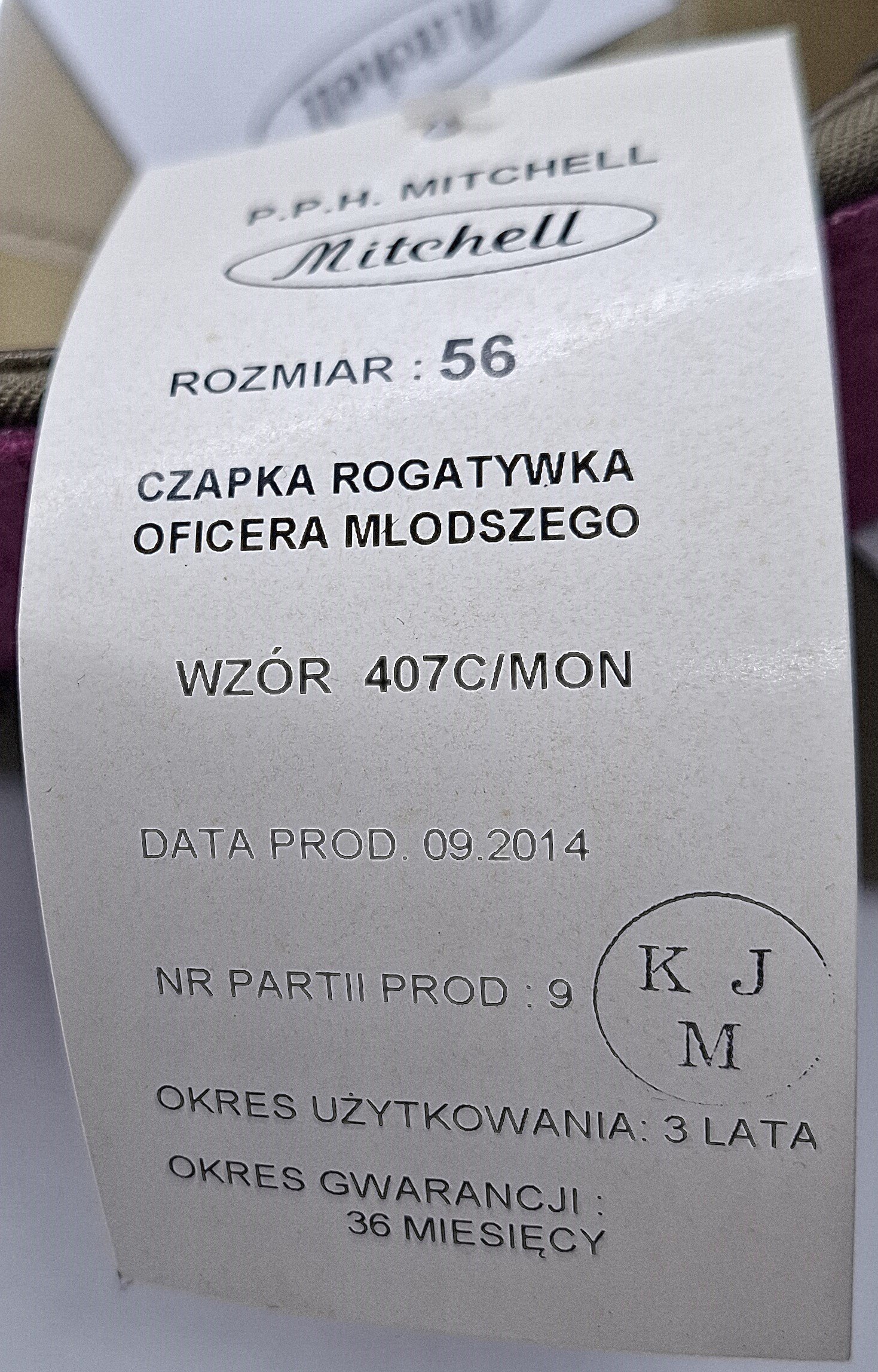 Rogatywka wykonana z gabardyny w kolorze khaki. Denko czapki ma kształt czworokąta foremnego. Przedni i lewy róg uniesione, pozostałe obniżone na wysokość górnej krawędzi otoku. Przednie kwatery usztywnione usztywniaczem krawieckim, filcem? Wnętrze czapki wyłożone jedwabnym materiałem w jaśniejszym odcieniu materiału zasadniczego. W denku, na jedwabnej podszewce, wszyty tworzywowy transparentny romb zabezpieczający przed potem. Pod nim znajdowała się metka z danymi producenta, niżej stempel z datą i rozmiarem. Dno czapki napięte jest prętem zapewniającym kształt kwadratu. Daszek tworzywowy koloru czarnego. Z góry gładki, od spodu także gładki, obszyty wąskim paskiem na rancie. Otok wykonany z sukna. Stopień haftowany bajorkiem w szyku co ok. 2 mm. Kolor nawiązuje do wypustek służby duszpasterskiej do 1951. Na dolnej krawędzi taśmy otokowej nad daszkiem znajduje się pasek skórzany koloru czarnego, zapinany na metalową sprzączkę. Pasek przypięty guzikami z wąsami wykonanymi z tworzywa sztucznego z wizerunkiem orła z koroną wzoru państwowego w kolorze czarnym o średnicy 16 mm. Wewnątrz potnik skórzany perforowany.
