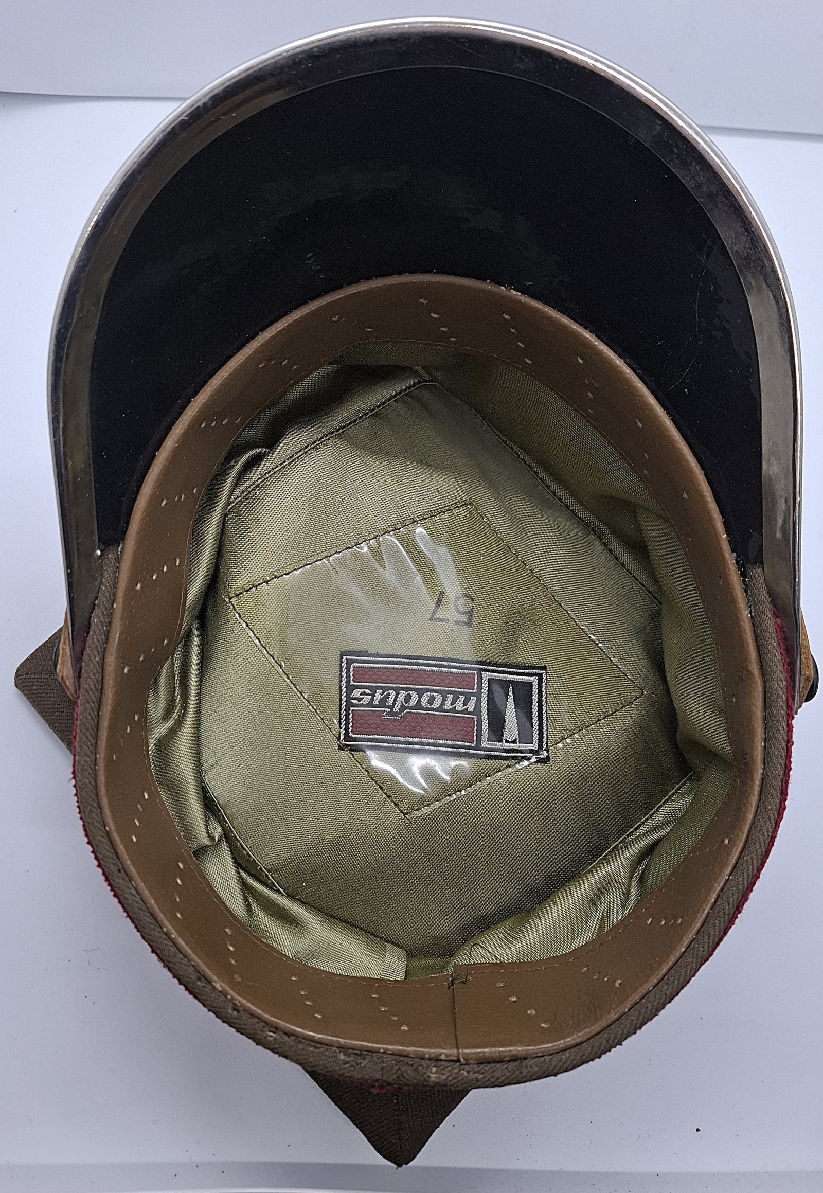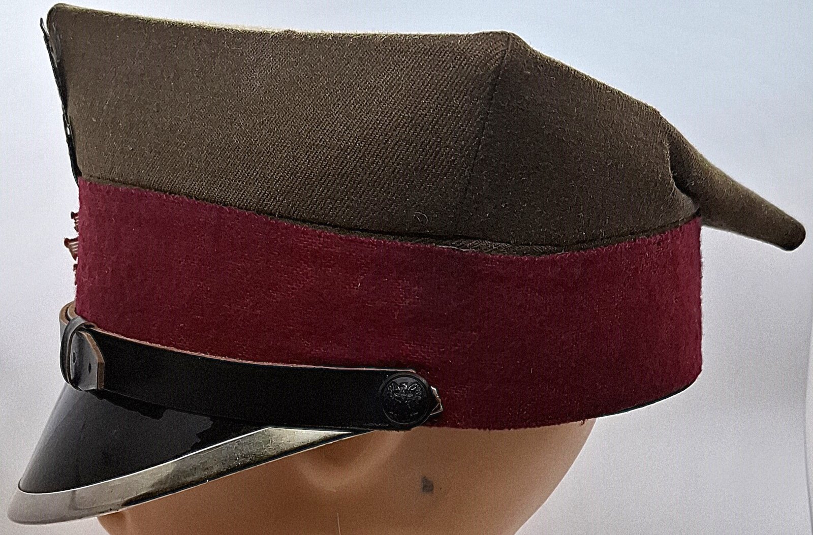 Rogatywka wykonana z gabardyny w kolorze khaki. Denko czapki ma kształt czworokąta foremnego. Przedni i lewy róg uniesione, pozostałe obniżone na wysokość górnej krawędzi otoku. Przednie kwatery usztywnione usztywniaczem krawieckim, filcem? Wnętrze czapki wyłożone jedwabnym materiałem w jaśniejszym odcieniu materiału zasadniczego. W denku, na jedwabnej podszewce, wszyty tworzywowy transparentny romb zabezpieczający przed potem. Pod nim znajduje się metka z danymi producenta, niżej stempel z rozmiarem. Dno czapki napięte jest prętem zapewniającym kształt kwadratu. Daszek tworzywowy koloru czarnego. Z góry gładki, od spodu także gładki. Taśma otokowa w kolorze granatowym, wykonana z tkaniny wełnianej - sukna. Na dolnej krawędzi taśmy otokowej nad daszkiem znajduje się pasek skórzany koloru czarnego, zapinany na metalową sprzączkę. Pasek przypięty guzikami z wąsami, wykonane z metalu z wizerunkiem orła bez korony wzoru państwowego w kolorze granatowym o średnicy 16 mm (ze starych zapasów). Wewnątrz potnik skórzany perforowany, na wewnętrznej stronie stempel z datą i kontrolą jakości. Na rancie daszka charakterystyczne metalowe okucie.