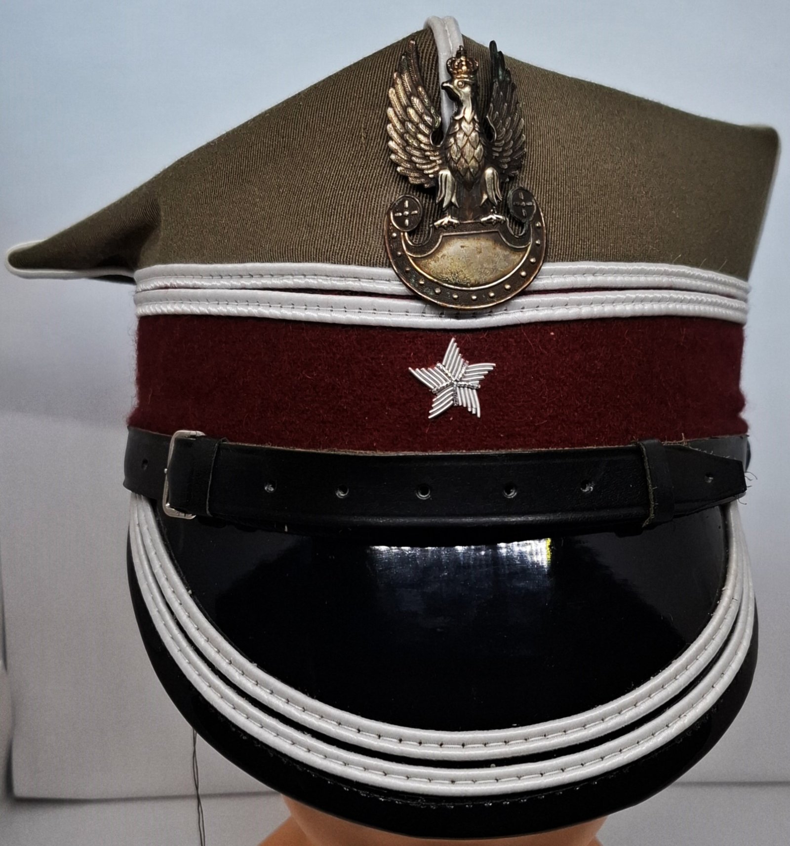 Rogatywka jest wykonana z gabardyny koloru oliwkowego. Daszek z tworzywa sztucznego z usztywnieniem i skórzany pasek są koloru czarnego. Klamerka paska w formie prostokąta. Pasek przypięty guzikami z wąsami wykonanymi z tworzywa sztucznego z wizerunkiem orła bez korony (początkowo używano takich guzików aby zużyć zapasy magazynowe) wzoru państwowego w kolorze czarnym o średnicy 16 mm. Wewnątrz potnik skórzany perforowany. Przednie kwatery usztywnione usztywniaczem krawieckim, filcem? Wnętrze czapki wyłożone jedwabnym materiałem w jaśniejszym odcieniu materiału zasadniczego. W denku, na jedwabnej podszewce, wszyty tworzywowy transparentny romb zabezpieczający przed potem. Pod nim znajduje się metka z danymi producenta i niżej stemplem rozmiaru (brak daty, nawet pod metką). Dno czapki napięte jest prętem zapewniającym kształt kwadratu. Przedni i lewy narożnik są uniesione. Prawy i tylny obniżone na wysokość górnej krawędzi otoku.