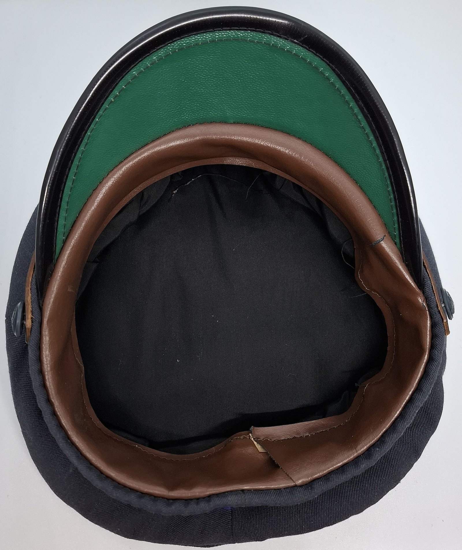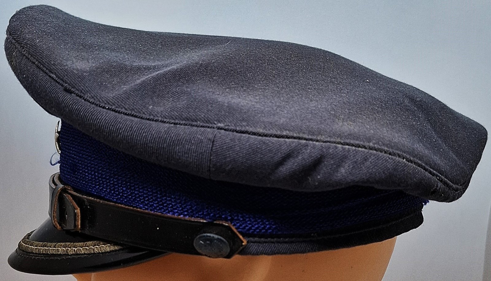 Materiał zasadniczy to gabardyna w kolorze stalowoszarym. Kształt czapki przyjmuje formę okrągłą denka. Między dnem, a kwaterami zaszyta wypustka z materiału zasadniczego. W przednich kwaterach usztywnienie z filcu i usztywniacza krawieckiego(?). Brak wietrzników. W denku znajduje się podszewka w odcieniu czerni. Potnik wykonany ze skóry w kolorze brązowym. Daszek czarny, wykonany z tworzywa sztucznego. Z góry gładki i błyszczący, od spodu zielony o fakturze skóropodobnej. Całość usztywniona (tekturą?). Pasek podbródkowy w formie skórzanej, dwuczęściowej spinanej na klamerkę. Klamerka metalowa. Przytwierdzony dwoma guzikami tworzywowymi w niebieskim odcieniu z wizerunkiem orła administracyjnego bez korony. Mocowane na uszko. Usztywnienie otoku wykonane prawdopodobnie z grubego tworzywa sztucznego. Otok w postaci taśmy o grubym splocie w kolorze granatowym. Stopień tłoczony ze srebrnego metalu. Na przednich kwaterach orzeł Służby Więziennej wykonany z tłoczonego metalu. Orzeł mocowany na wąsy.