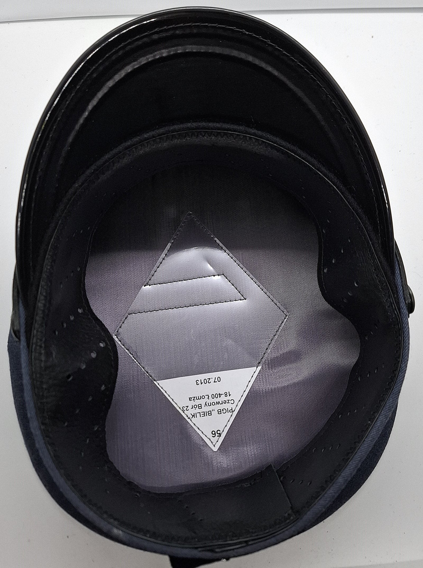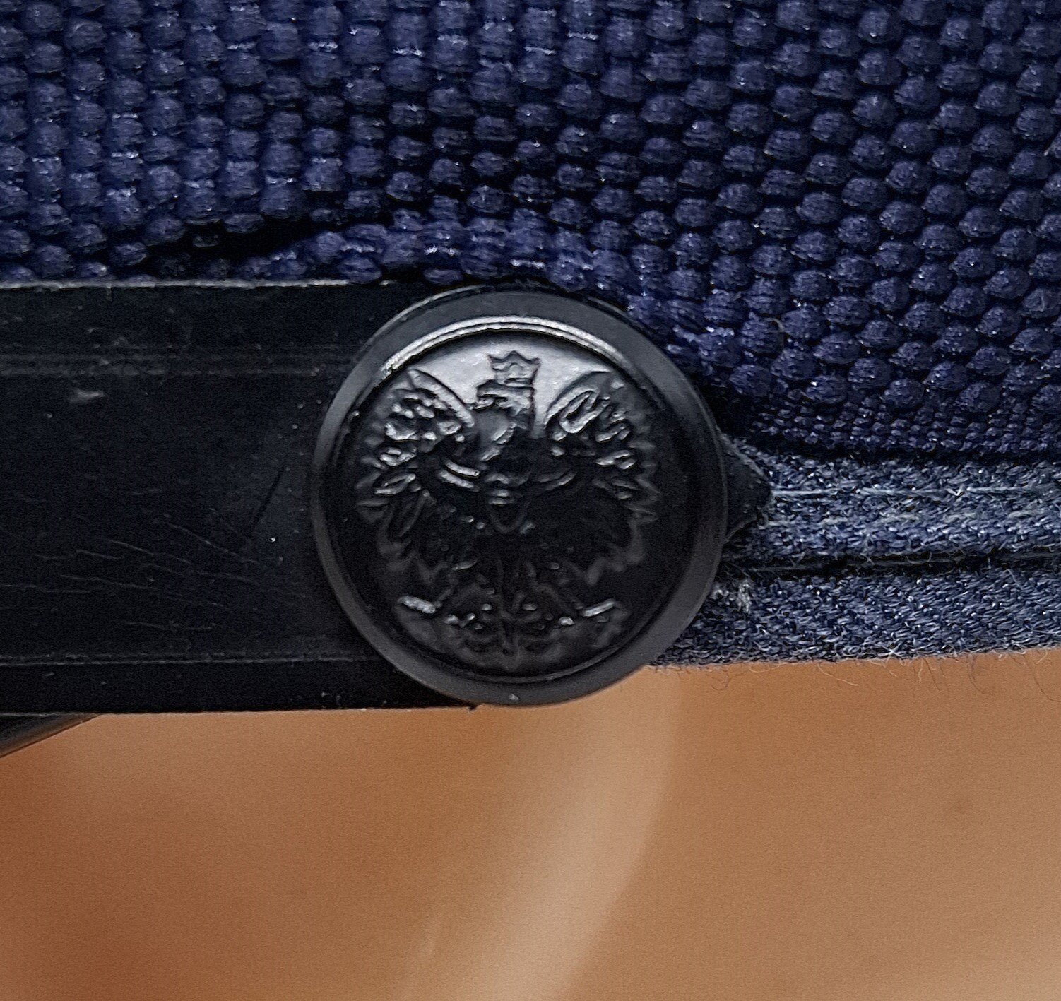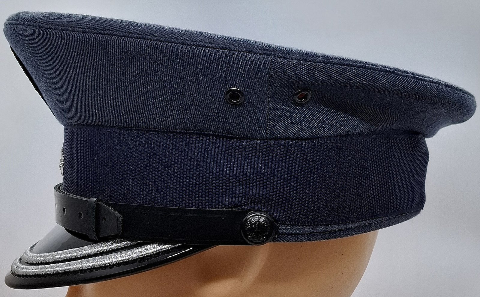 Materiał zasadniczy to gabardyna w kolorze stalowoszarym/stalowoniebieskim. Kształt czapki przyjmuje formę okrągłą denka. Między dnem, a kwaterami zaszyta wypustka z materiału zasadniczego. W przednich kwaterach usztywnienie z filcu i usztywniacza krawieckiego(?). Po obu stronach wietrzniki metalowe, okrągłe lakierowane na czarno. Rozmieszczone symetrycznie po obu stronach bocznych zszyć kwater. W denku znajduje się atłasowy materiał w odcieniu materiału zasadniczego. Na środku wszyta tworzywowa, transparentna osłona denka z metką producenta(?), rozmiarem i datą produkcji. Potnik wykonany ze skóry w kolorze czarnym, perforowanej otworami w skośnych kolumnach po 4. Daszek czarny, wykonany z tworzywa sztucznego. Z góry gładki i błyszczący, od spodu czarny o fakturze gładkiej. W pobliżu rantu podwójny, srebrny galon. Całość usztywniona (tekturą?). Pasek podbródkowy w formie skórzanej, dwuczęściowej spinanej na klamerkę. Klamerka metalowa. Przytwierdzony dwoma guzikami tworzywowymi, czarnymi z wizerunkiem orła administracyjnego w koronie. Mocowane za pomocą metalowych wąsów. Usztywnienie otoku wykonane prawdopodobnie z grubego tworzywa sztucznego. Otok w postaci taśmy o drobnym splocie w kolorze granatowym. Stopień haftowany srebrnym bajorkiem. Na przednich kwaterach haftowany orzeł Służby Więziennej. Orzeł wprowadzony rozporządzeniem Ministra Sprawiedliwości w 2011. Orzeł mocowany na wąsy.