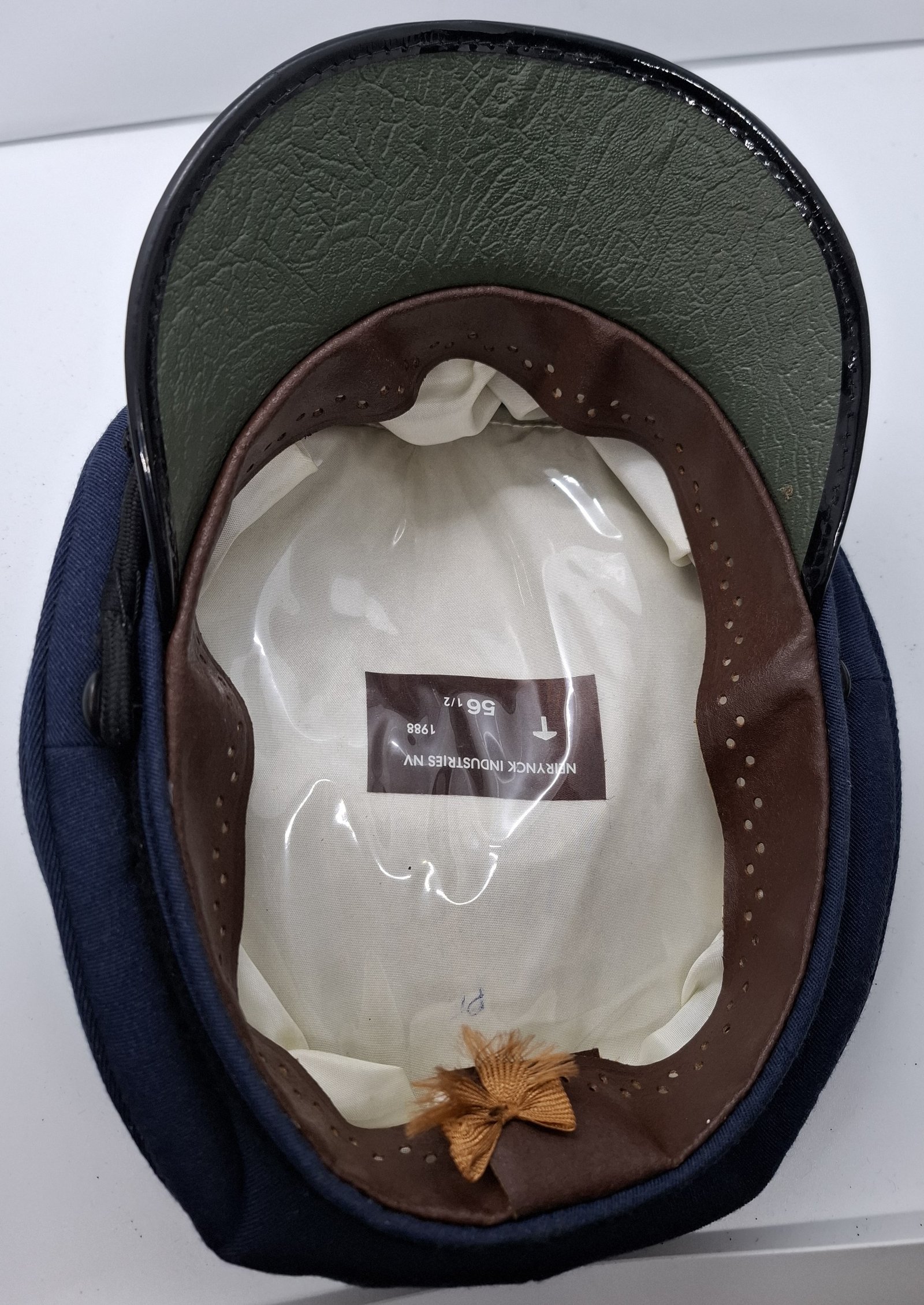 Materiałem zasadniczym jest gabardyna w kolorze granatowym. Denko w formie owalu. Do niego przyszyte cztery kwatery. Między denkiem i kwaterami wszyta wypustka z materiału zasadniczego. Symetrycznie do bocznych zszyć kwater umieszczone czarne wietrzniki. Otok sztywny obszyty materiałem zasadniczym. W dolnej części ślepa wypustka podtrzymująca taśmę otokową. Taśma otokowa wełniana (?). Pasek w formie sznurka regulowanego na szlufki. Przypinany na guziki mocowane na wąsy. Guziki tworzywowe, czarne, gładkie. Na przodzie czapki odznaka haftowana bajorkiem na czarnej sukiennej podkładce. Jest to odznaka w formie dla korpusu chorążych - Sous-officiers. Daszek tworzywowy czarny. Od spodu o regularnej fakturze, zielony. Obszyty paskiem tworzywowym. Wewnątrz atłasowa podszewka ze metką producenta. Całe denko wyłożone transparentnym tworzywem. Potnik skórzany perforowany. Związany w tylnej części.