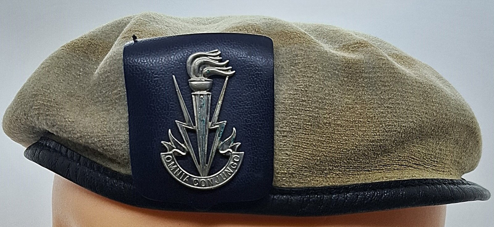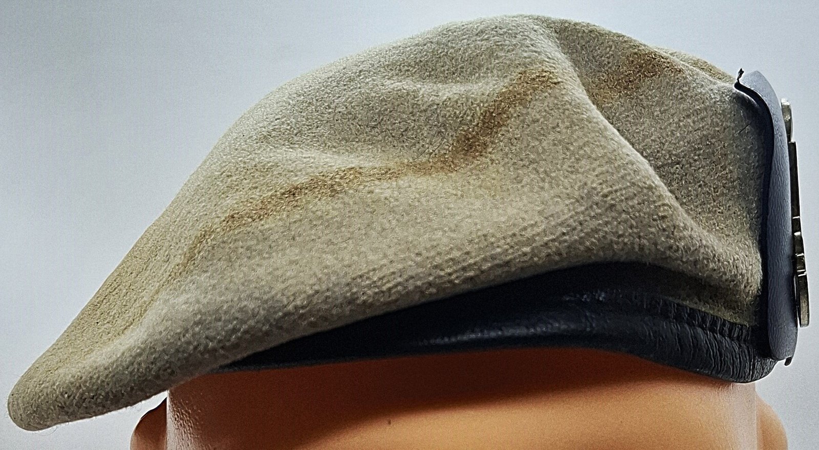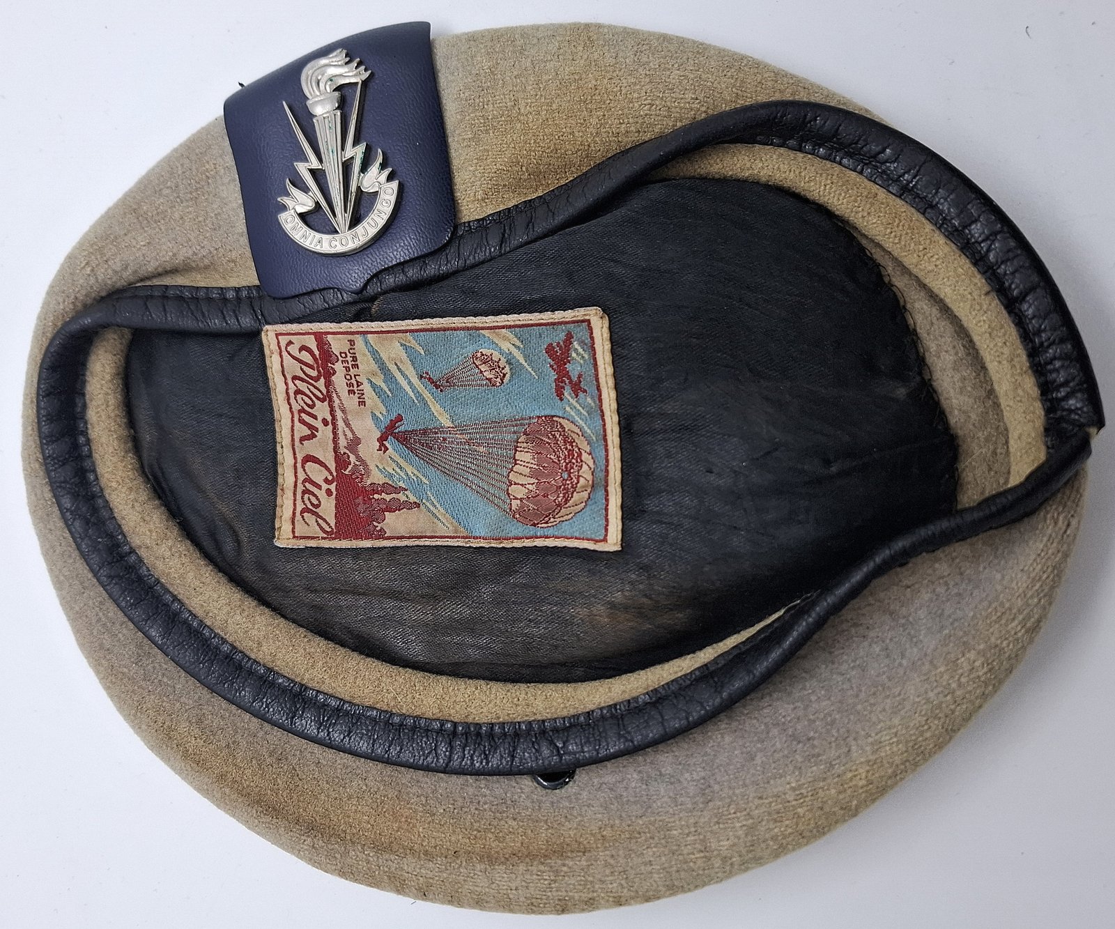Beret tłoczony Plein Ciel używany w wielu krajach jak Francja, Belgia, Holandia, Polska (AT), byłe kolonie francuskie. Denko wyszyte podszewką. Lamówka wykonana ze skóry. Wewnątrz materiałowa taśma do regulacji rozmiaru (wyciągnięta). Nie ma usztywnienia w miejscu odznaki. Jest osłona zaczepu odznaki ze sztucznej skóry.