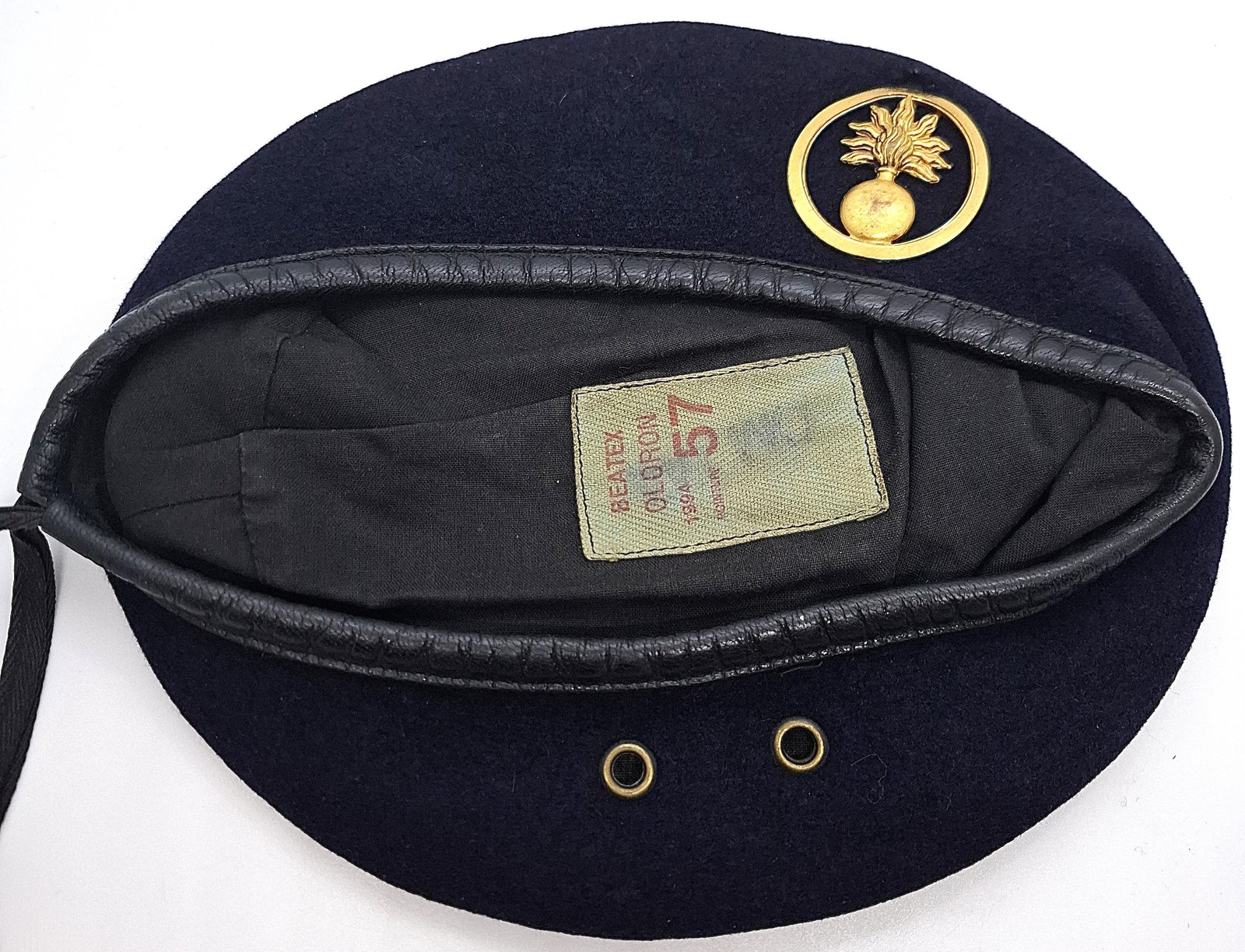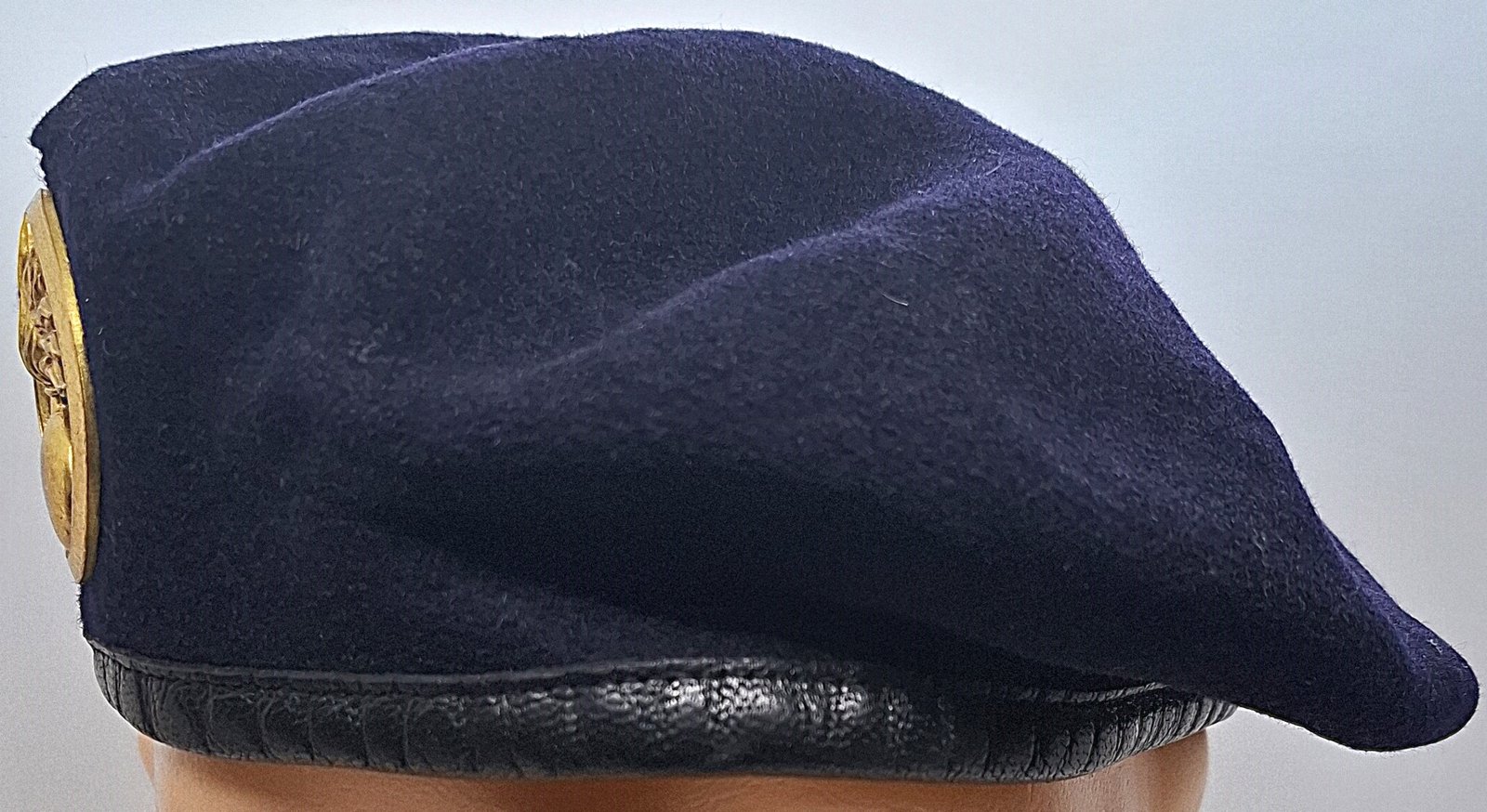 Beret tłoczony. Zarówno denko jak i boki wyłożone podszewką. Na środku wszyta metka. W miejscu odznaki usztywnienie ze skóry. Lamówka skórzana z materiałową taśmą do regulacji rozmiaru.