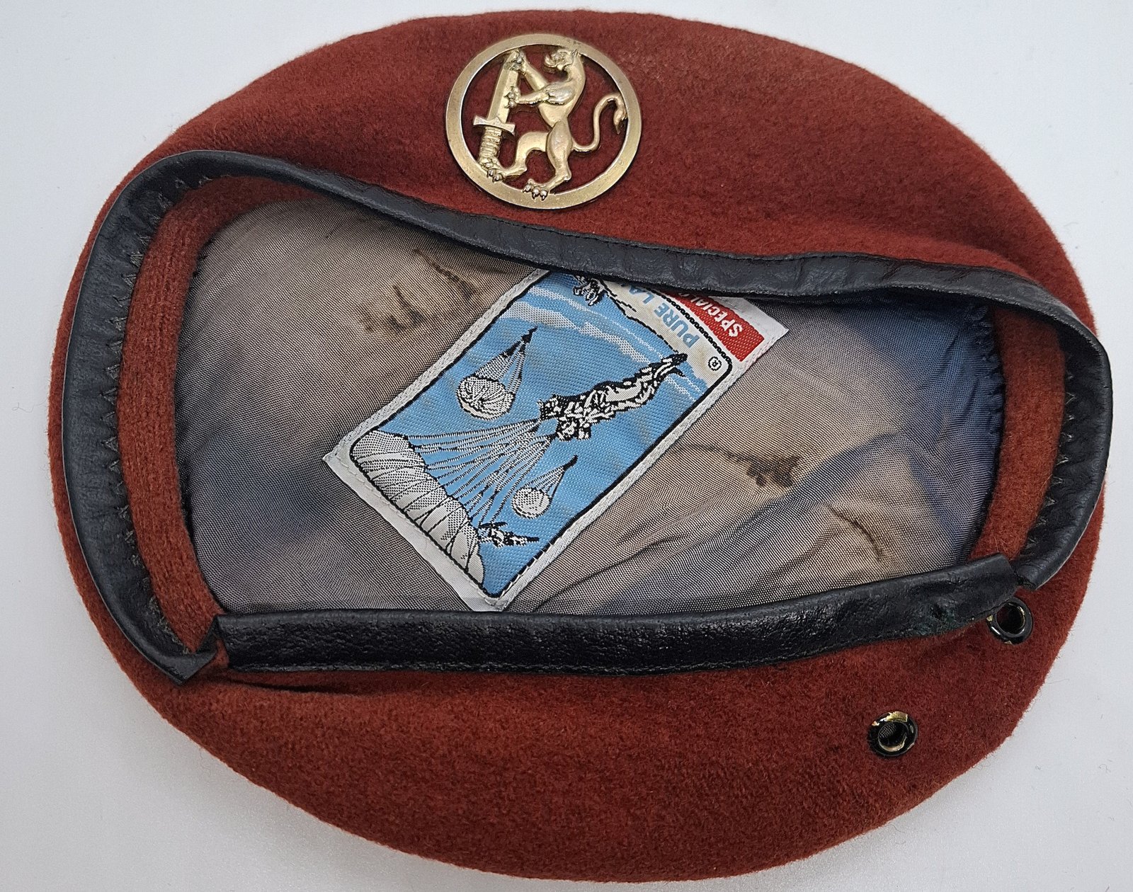 Beret tłoczony używany w wielu krajach jak Francja, Belgia, Holandia, Polska (AT), byłe kolonie francuskie. Beret z podszewką w denku. Lamówka wykonana ze skóry. Wewnątrz materiałowa taśma do regulacji rozmiaru. Brak usztywnienia w miejscu odznaki. Odznaka mocowana zawleczką na dwie omegi. Wewnątrz osłona mocowania odznaki.