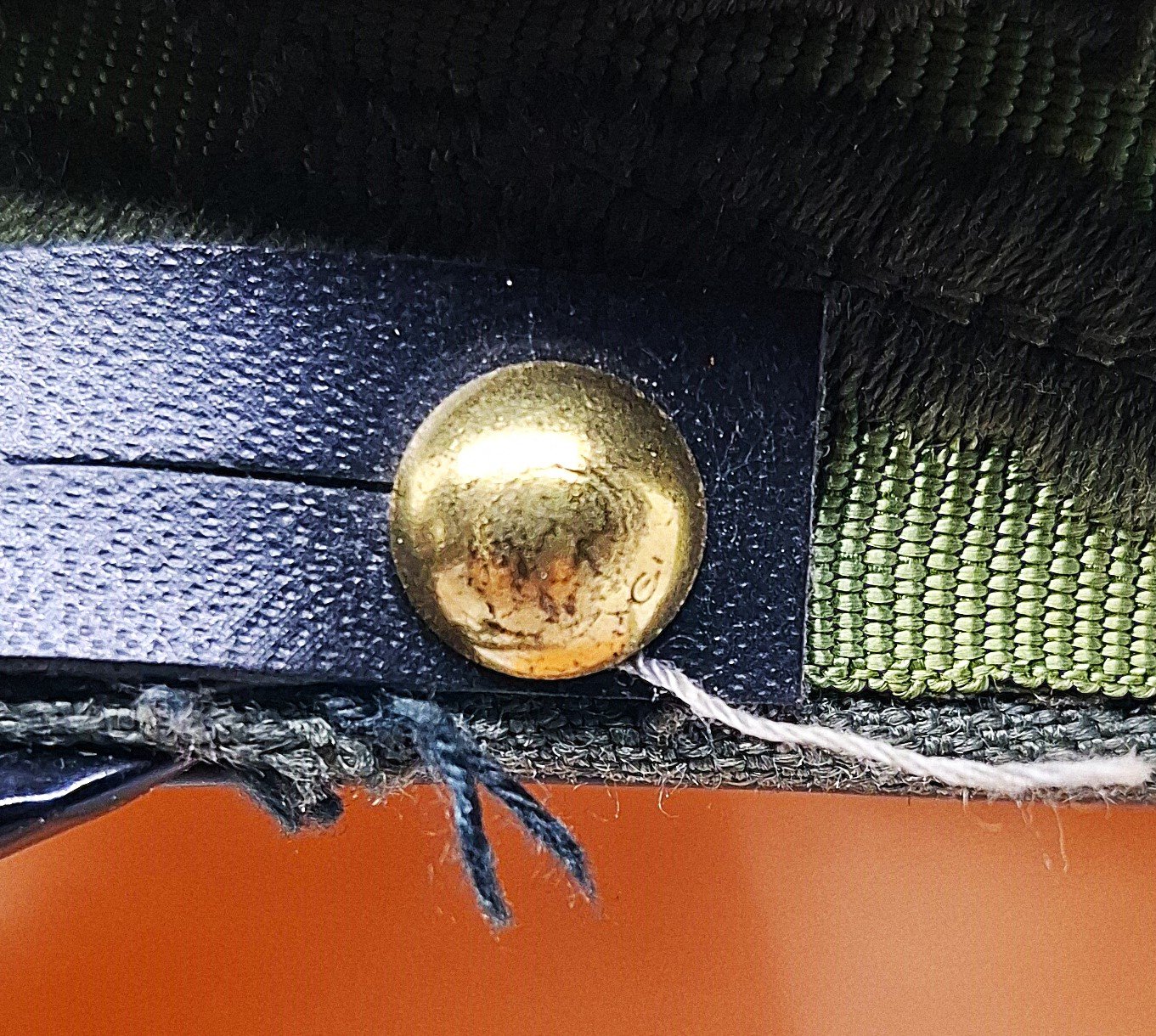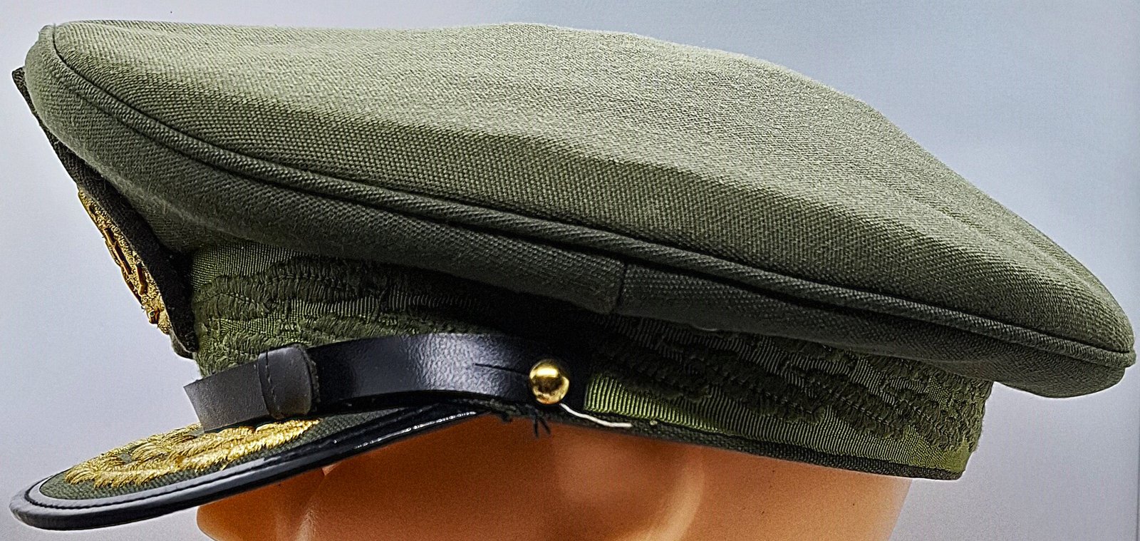 The garrison cap is green. The main material is a variety of thick tropic fabric. A piping is placed between the bottom and the quarters. Vents, varnished in the same color as the main material, are sewn symmetrically to the side panels. The quarters are strongly stiffened, maintaining the cap's oval shape. A stiff brim (plastic?) is trimmed with the main material. The brim features a brim band with embroidered laurel leaves. The two-piece leather belt is fastened with gold buttons by wires called whiskers. It is adjustable with loops. The stiff peak is trimmed with the main material at the top, featuring laurel leaves (senior officer) embroidered with gold thread. The underside is lined with black, porous material. The brim is trimmed with a smooth strip of black material. The interior is lined with a velvet-like yellow material, stitched four times. A sweat guard made of transparent material is sewn into the center. Beneath it is the label of the manufacturer and owner of the hat. The label reads:
