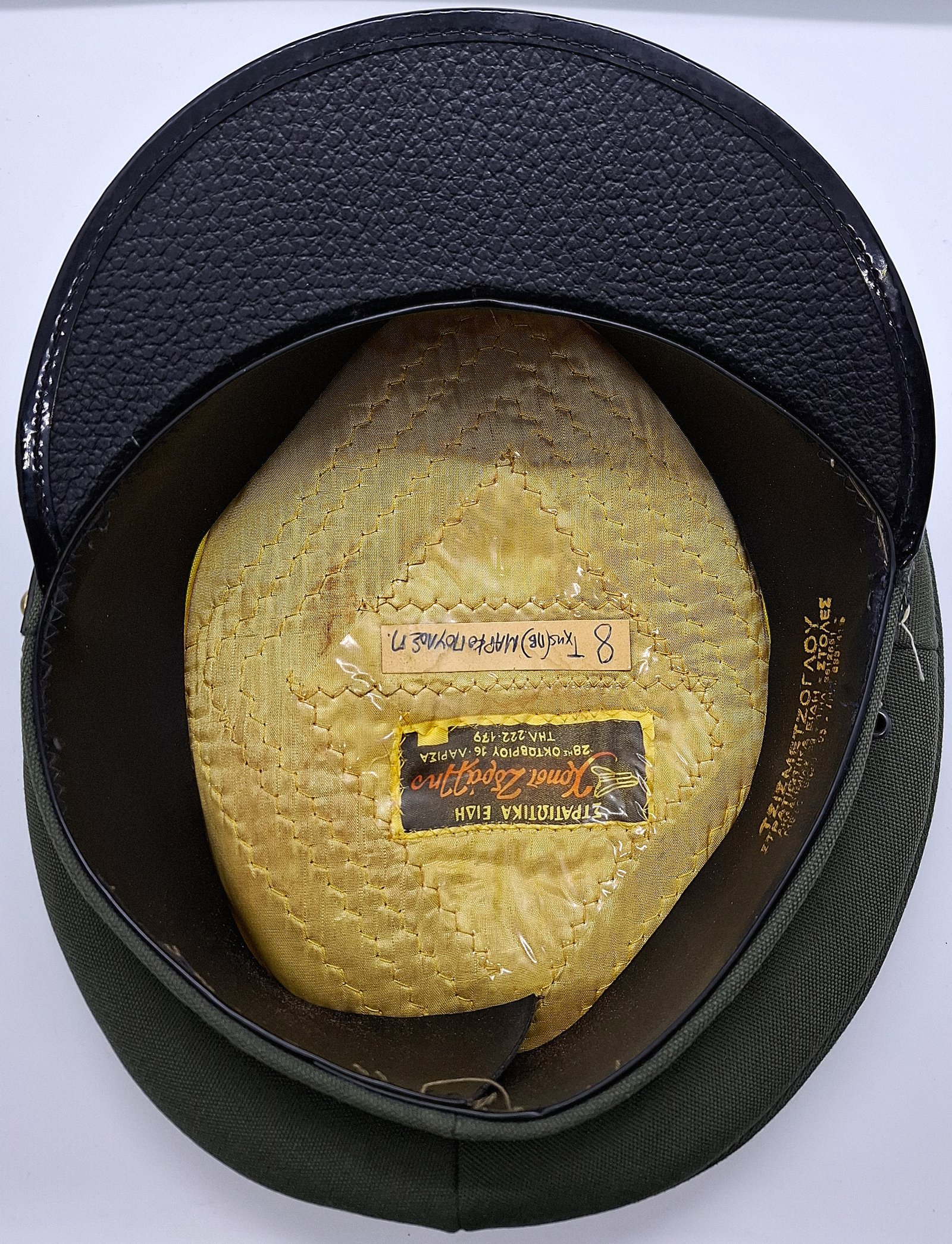 The Senior Officer's Cap of the Land Forces (Ανωτάτου Αξιωματικού Ελληνικού Στρατού – Senior Officer of the Hellenic Army). This uniform pattern, which appeared in the 1970s, was based on the dark green American uniform of the time. The insignia was based on the British style, as on earlier uniforms.