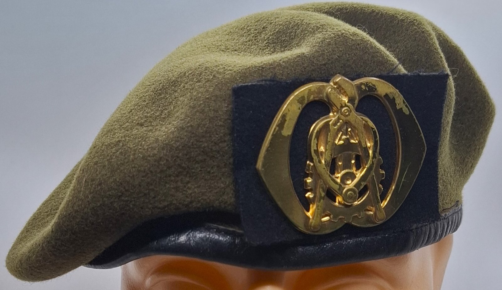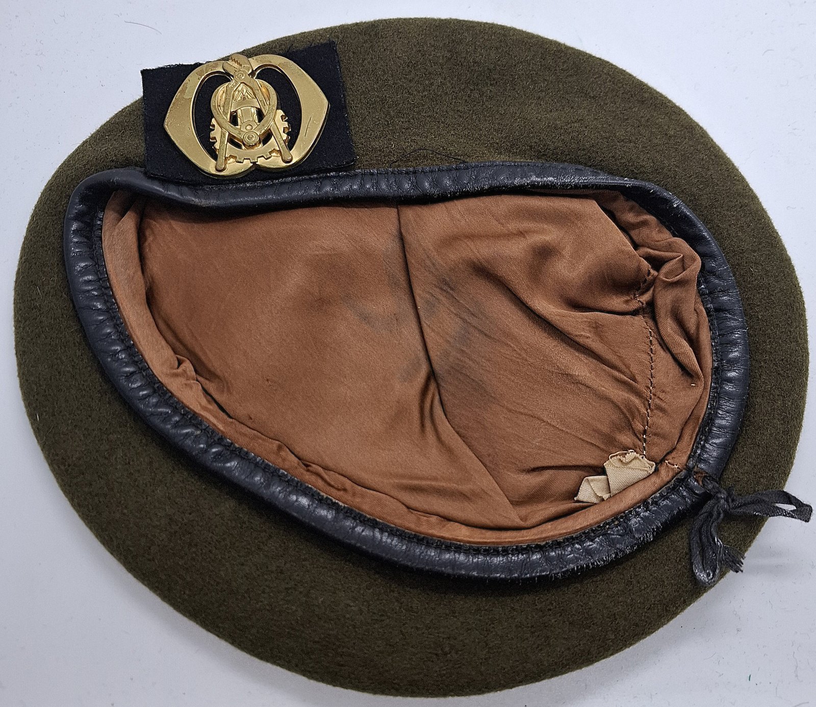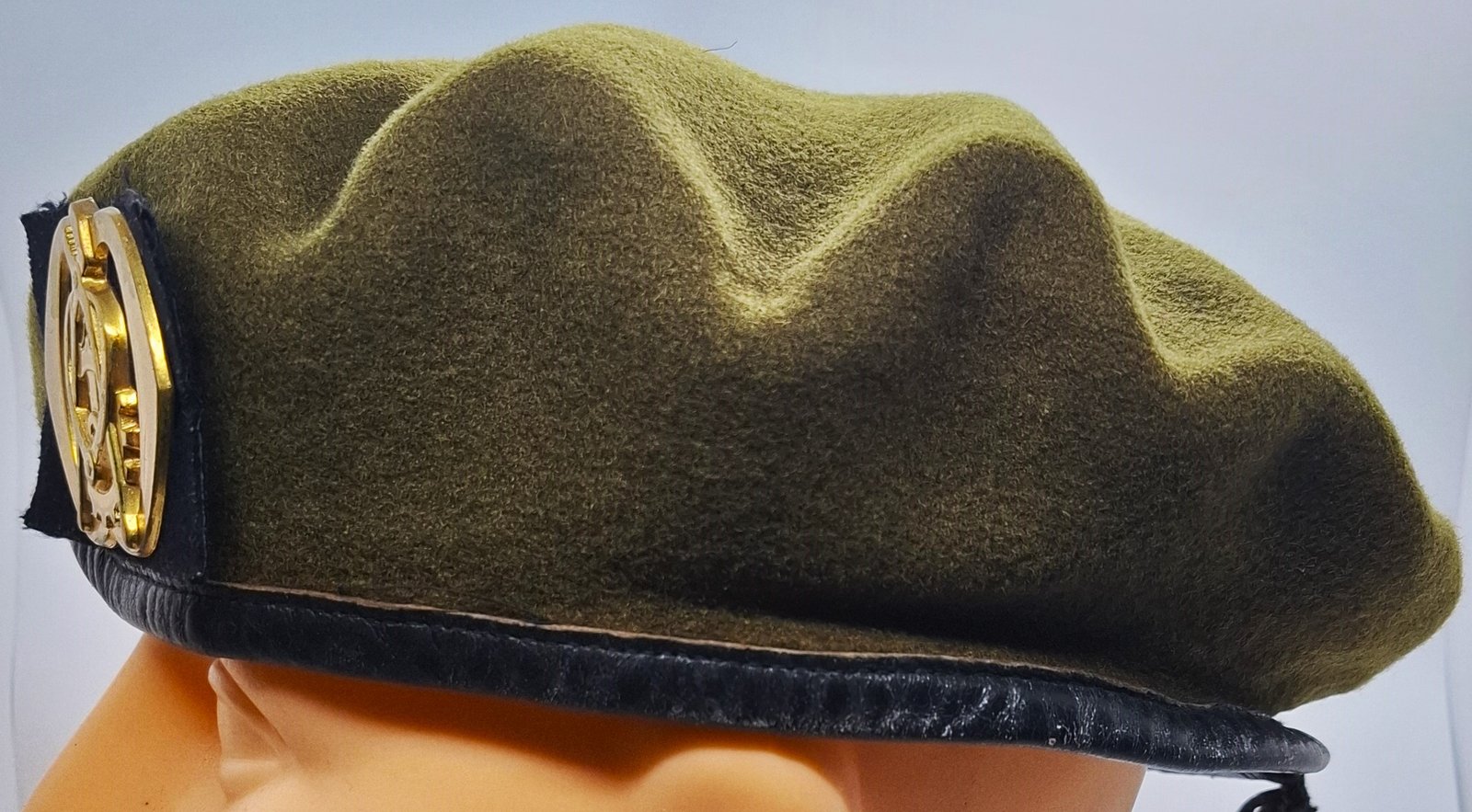 Beret khaki, tłoczony z podszewką w całym wnętrzu. Lamówka wykonana ze skóry. Wewnątrz materiałowa taśma do regulacji rozmiaru. Brak usztywnienia w miejscu odznaki. Jest osłona zaczepu odznaki z materiału podszewki.
