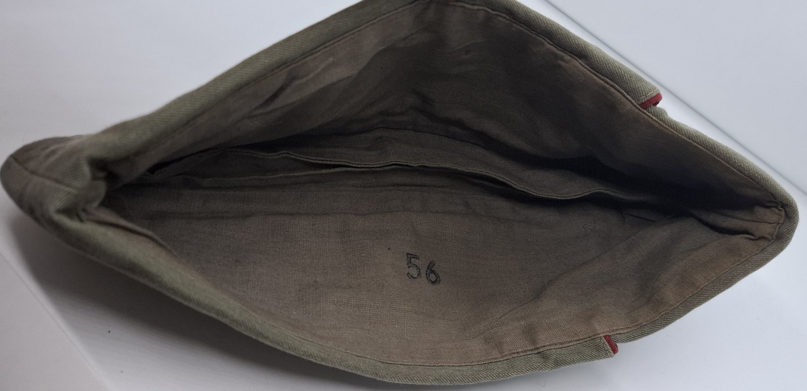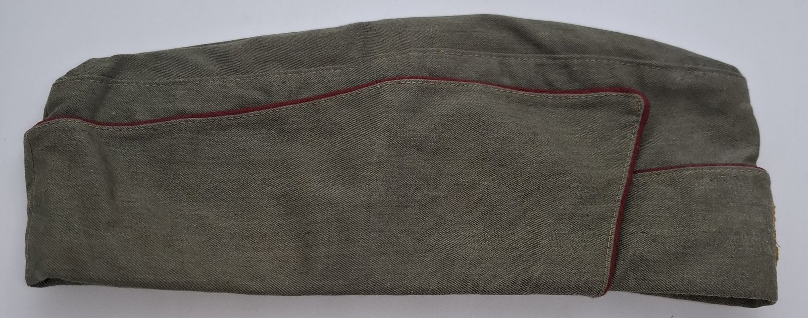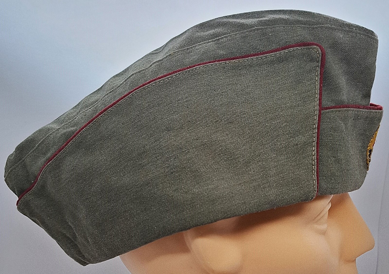 Materiał zasadniczy podobny do gabardyny w kolorze oliwkowym. Wysokie boczne klapy. W przedniej części czołowa kwatera z odznaką. Odznaka haftowana. Kwatera i klapy obszyte czerwono/różową wypustką. Wewnątrz stempel rozmiaru.