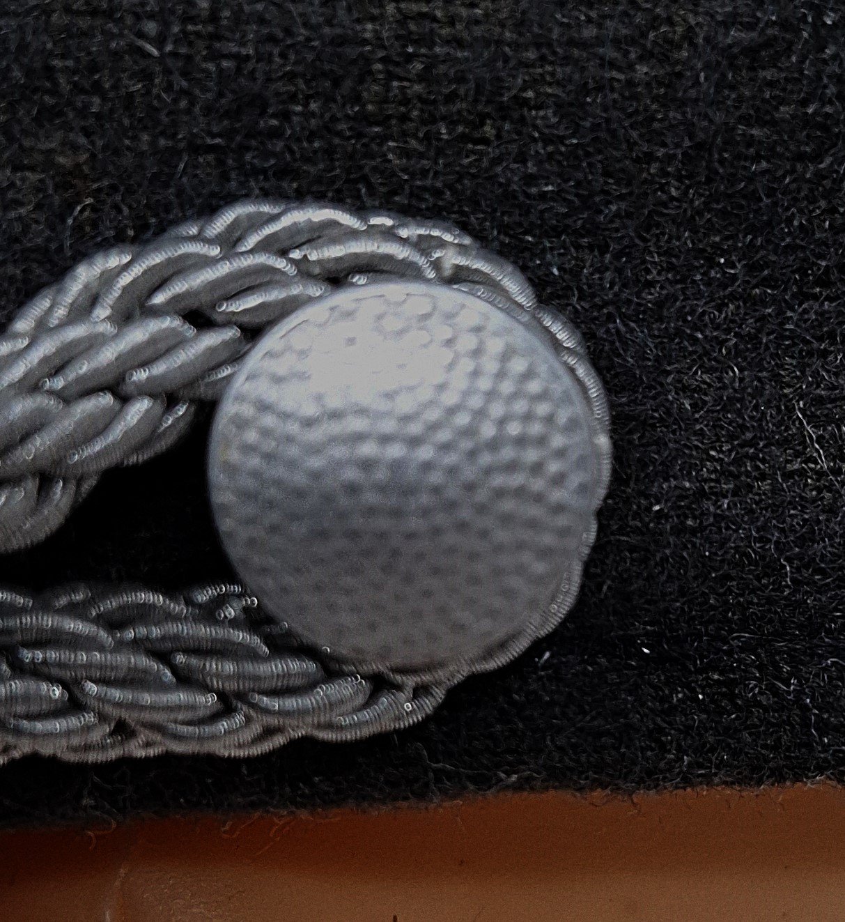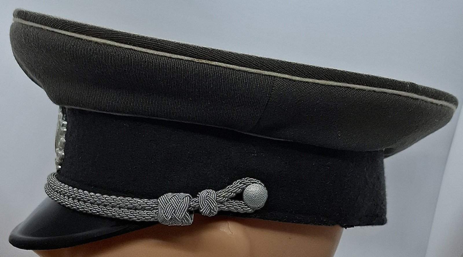 Materiał zasadniczy podobny do gabardyny w szarym kolorze. W dolnej części denka 4 kwatery. Między kwaterami i denkiem wszyta wypustka z białego sukna. Podobna na zszyciu kwater i otoku. Otok sztywny (tworzywo?). Obszyty ciemniejszym materiałem. Po obu stronach guziki (groszek) srebrne o średnicy około 12 mm, przypinane na metalowe wąsy. Pasek pleciony, sznurkowy, srebrny, złożony z dwóch części. Z jednej strony przypinany guzikiem, z drugiej wsuwka do regulacji. Daszek tworzywowy, gładki, czarny, jednoczęściowy. Od spodu czarny. Wewnątrz materiałowa podszewka z wszywką tworzywową przezroczystą z stemplem daty, rozmiarem i kieszenią na kartę z nazwiskiem użytkownika. Potnik z brązowej skóry. Odznaka metalowa, tłoczona z godłem NRD - Niemieckej Republiki Demokratycznej (DDR - Deutsche Demokratische Republik) w wieńcu z liści dębu i żołędzi. Odznaka umieszczona na otoku.