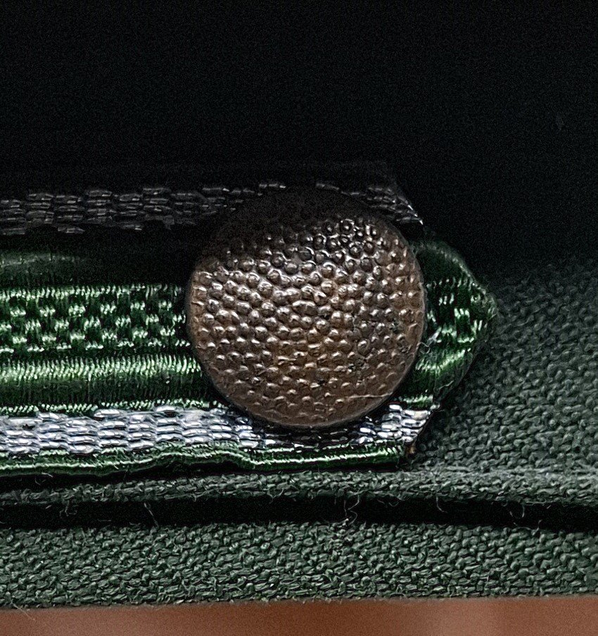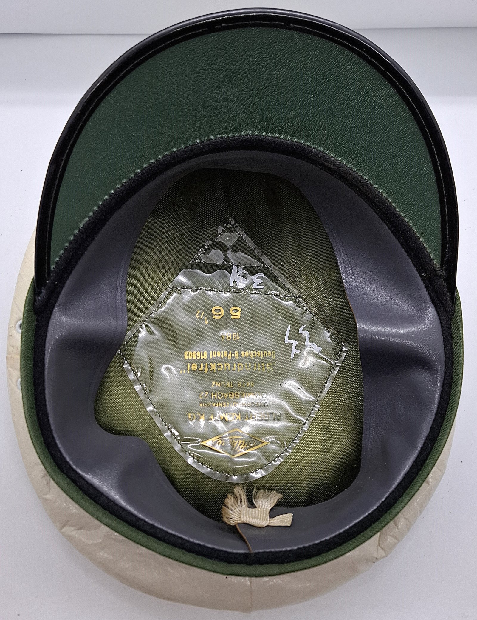 Materiał zasadniczy nieco podobny do gabardyny. Denko i 4 kwatery wykonane z białego tworzywa (nieprzemakalnego? - kruszeje starzejąc się). Otok sztywny (tworzywo?). Brak taśmy otokowej. Po obu stronach guziki (groszek) o średnicy około 12 mm koloru złotego, przypinane na metalowe wąsy. Pasek materiałowy zielony, złożony z dwóch części. Z jednej strony przypinany guzikiem, z drugiej wsuwka do regulacji. Daszek tworzywowy, gładki, czarny. Od spodu zielony. Na rancie obszyty czarnym paskiem tworzywowym. Wewnątrz jedwabnopodobna podszewka z wszywką tworzywową przezroczystą ze stemplem i kieszenią na kartę z nazwiskiem użytkownika. Potnik z miękkiej skóry. Końce związane w tylnej części białą materiałową taśmą. Odznaka metalowa z herbem landu. Niżej bączek tworzywowy w kolorach narodowych niemieckich.
