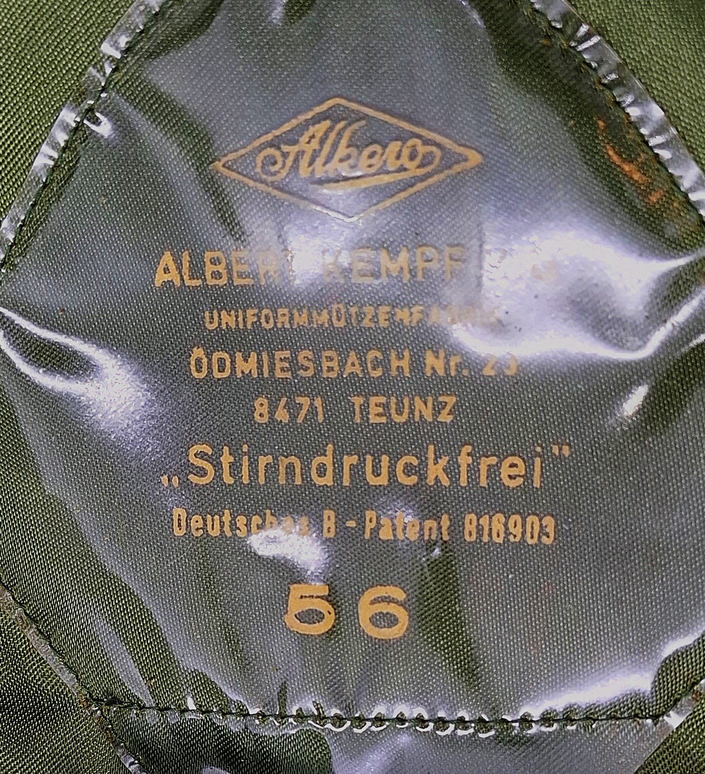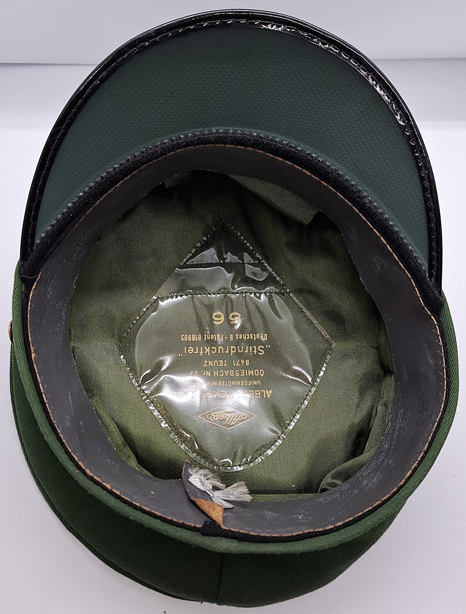 Materiał zasadniczy nieco podobny do gabardyny. W dolnej części denka 4 kwatery. Otok sztywny (tworzywo?). Brak taśmy otokowej. Po obu stronach guziki (groszek) złote o średnicy około 12 mm koloru złotego, przypinany na metalowe wąsy. Pasek materiałowy zielony, złożony z dwóch części. Z jednej strony przypinany guzikiem, z drugiej wsuwka do regulacji. Daszek tworzywowy, gładki, czarny. Od spodu zielony. Na rancie obszyty czarnym paskiem tworzywowym. Wewnątrz jedwabnopodobna podszewka z wszywką tworzywową przezroczystą ze stemplem i kieszenią na kartę z nazwiskiem użytkownika. Potnik z miękkiej skóry. Końce związane w tylnej części. Odznaka metalowa z herbem landu. Niżej bączek tworzywowy w kolorach narodowych niemieckich.