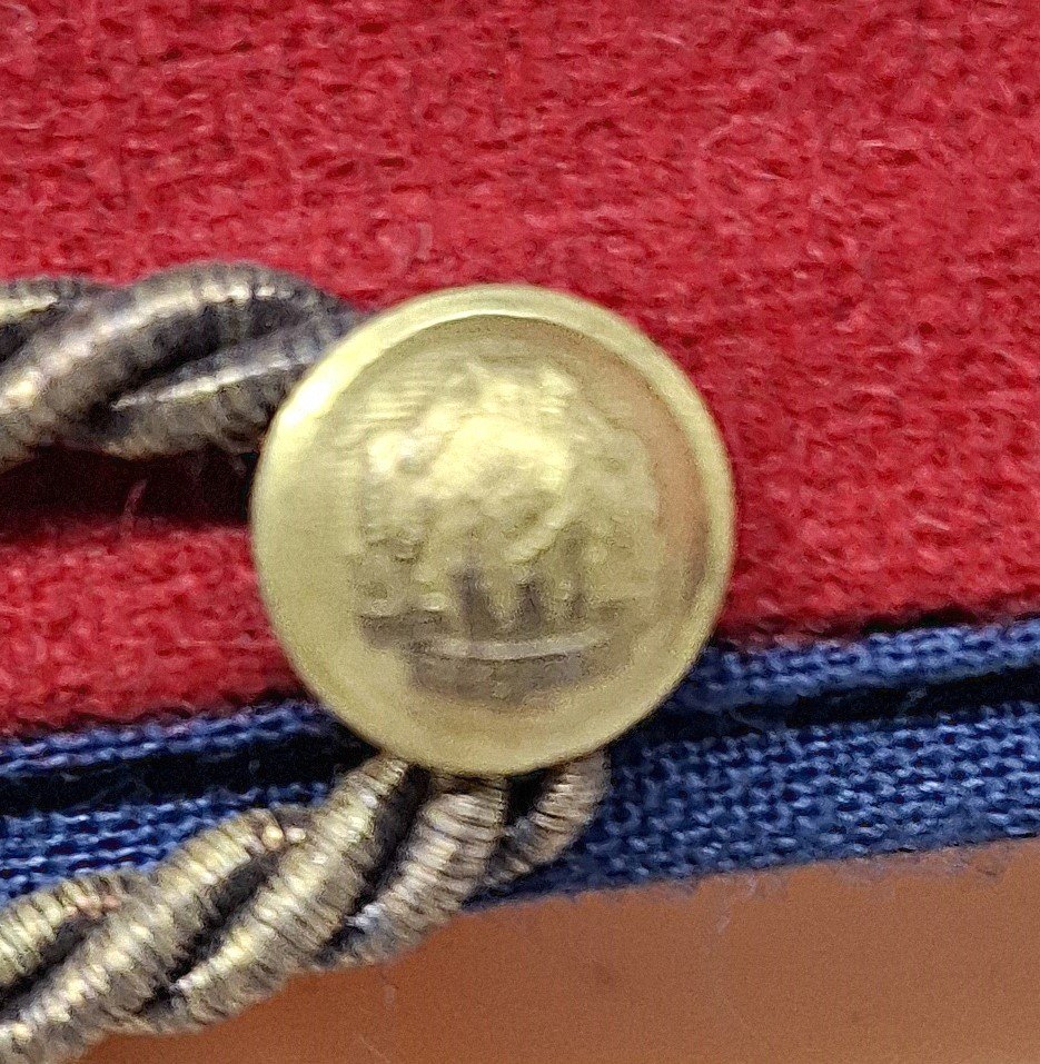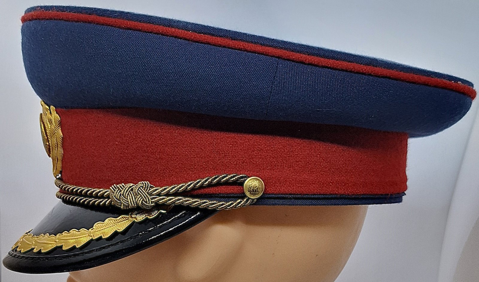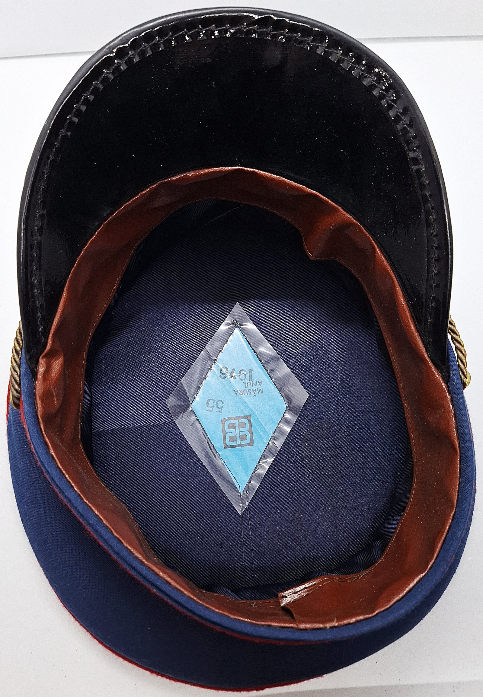 Materiał zasadniczy to granatowy tropik. Góra denka wykonana z jednego kawałka materiału. Dolna część z 4 kwater. Brak wietrzników. Otok sztywny, obszyty materiałem zasadniczym. W rancie denka wypustka koloru czerwonego. Całe kwatery wypełnione puchatym materiałem utrzymującym właściwy kształt czapki. Na otoku sukienna taśma otokowa koloru czerwonego wsparta ślepą wypustką. Czapka posiada daszek obszyty czarnym, gładkim tworzywem. Na rancie daszka czarna tworzywowa lamówka. Na brzegu daszka złoty wieniec z liści dębu - pojedynczy dla młodszych oficerów. Pasek sznurkowy, złoty, podwójny. Przypięty guzikami po obu stronach czapki. Guziki metalowe z wytłoczonym wizerunkiem odznaki. Wewnątrz wyłożona atłasowym? materiałem w odcieniu czapki. Wokół otoku potnik skóropodobny(?), brązowy, zszyty w tylnej części. W denku metka producenta, rozmiaru i daty. Na metce naszyta rombowa osłona z transparentnego tworzywa. Pod odznaką wewnątrz czapki dodatkowe usztywnienie sięgające rantu denka. Odznaka metalowa, tłoczona, dwuczęściowa. Na wieńcu przymocowane godło Rumunii w wersji czwartej, przyjętej w 1965 i obowiązującej do końca socjalistycznej republiki.