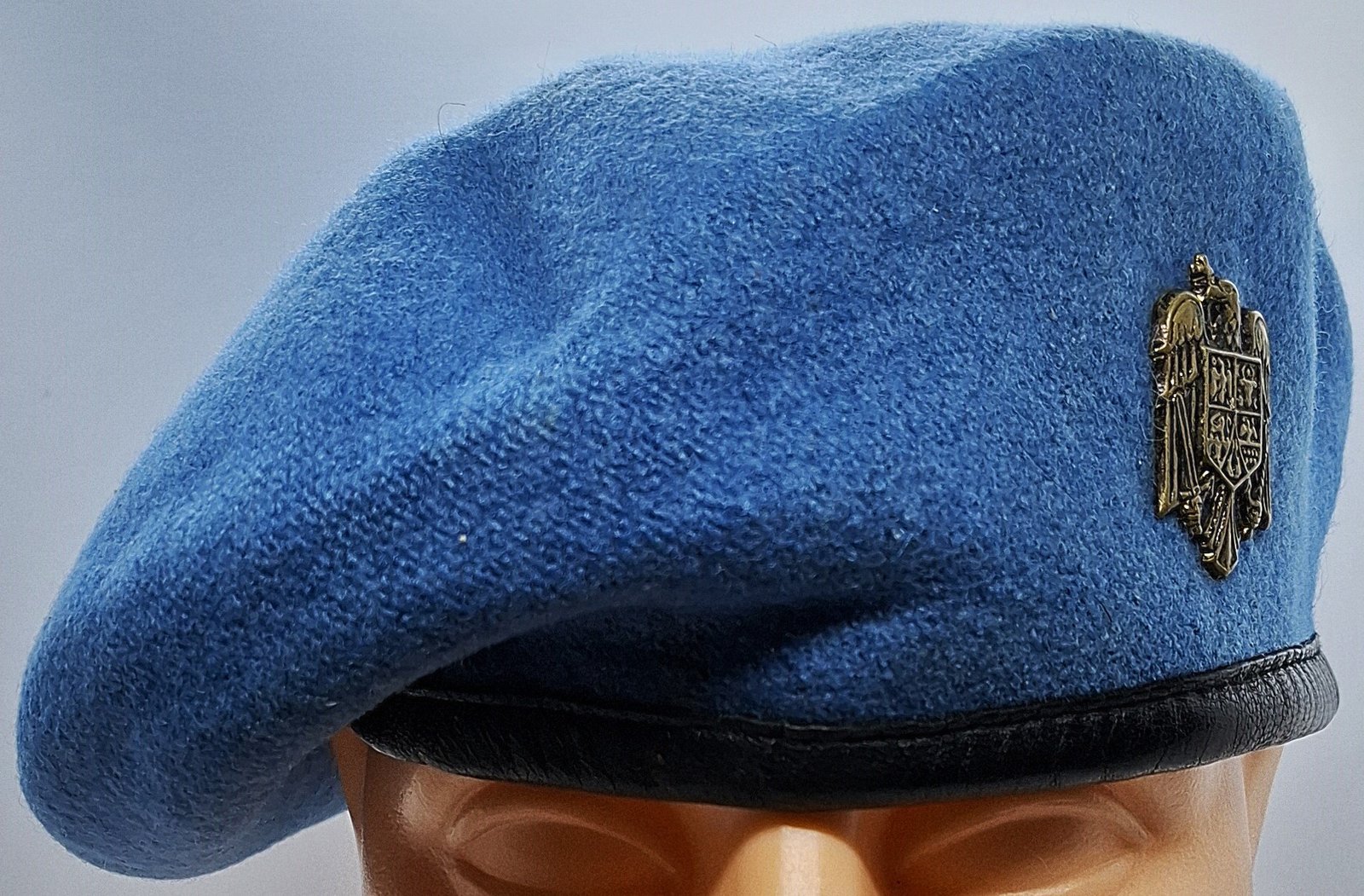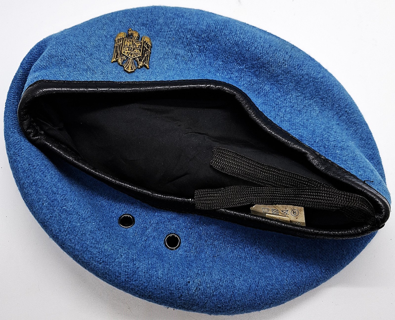 Jasnoniebieski beret tłoczony, wykonany z sukna. Z prawej strony dwa wywietrzniki w postaci oczek szewskich. Wewnątrz atłasowa, czarna podszewka. Skórzana lamówka z materiałową wstążką do regulacji rozmiaru. Metka wszyta pod lamówką. Na metce stempel "C.T.C." - Controlul Tehnic de Calitate, rumuński znak kontroli jakości. Na froncie odznaka metalowa, tłoczona, lakierowana na czarno, mocowana na wąsy. Jest to herb Rumunii z lat 1992 - 2016 (bez korony). W miejscu odznaki brak usztywnienia.