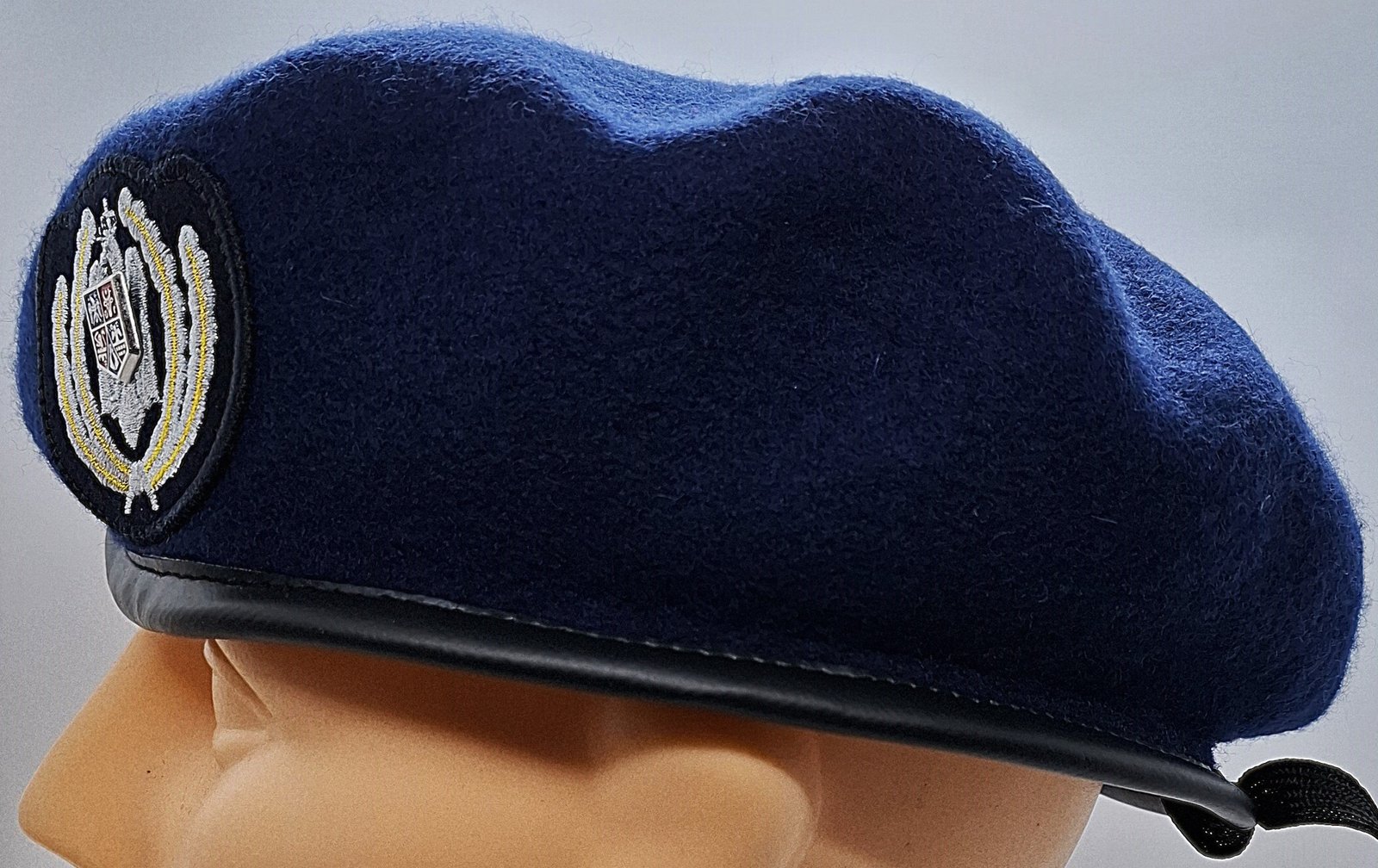 Ciemnoniebieski beret tłoczony, wykonany z sukna. Z prawej strony dwa wywietrzniki w postaci oczek szewskich. Wewnątrz atłasowa, czarna podszewka. Materiałowa lamówka z materiałową wstążką do regulacji rozmiaru. Metka z danymi producenta, rozmiarem i datą wszyta pod lamówkę. Odznaka haftowana na podkładce z materiału w kolorze ciemniejszym, granatowym. W miejscu odznaki brak usztywnienia.