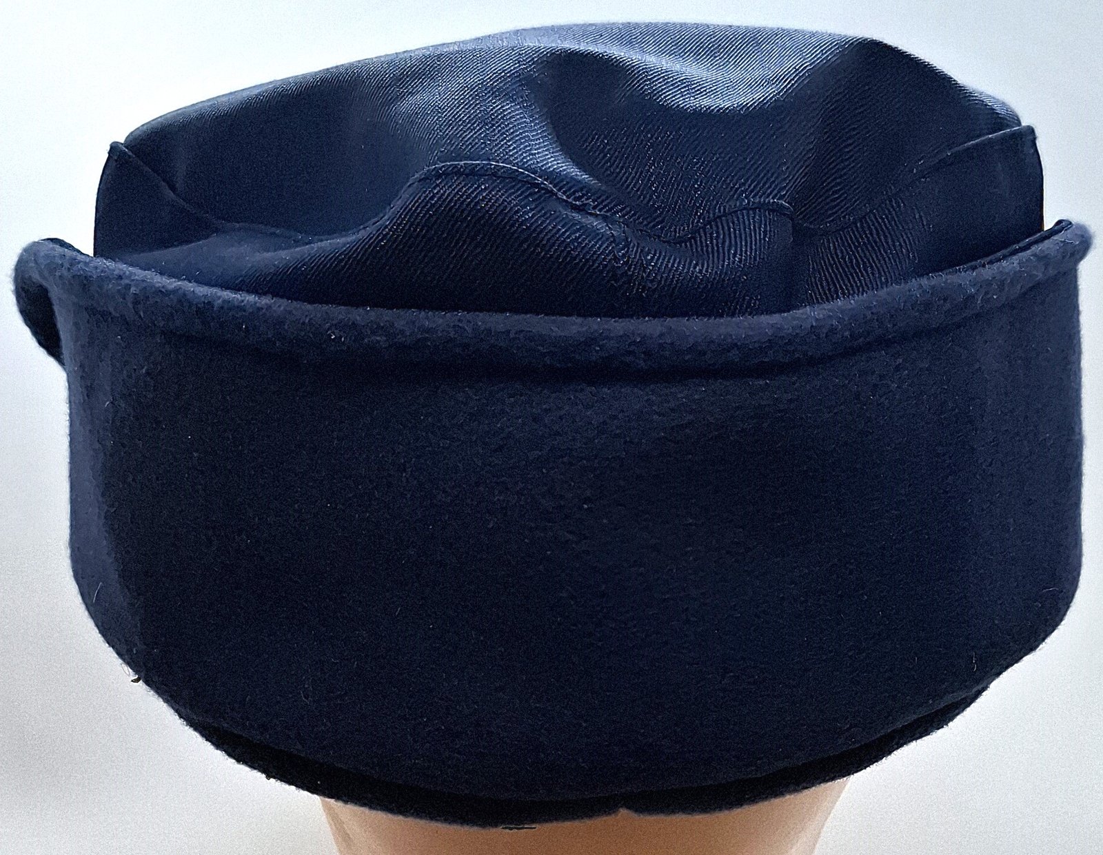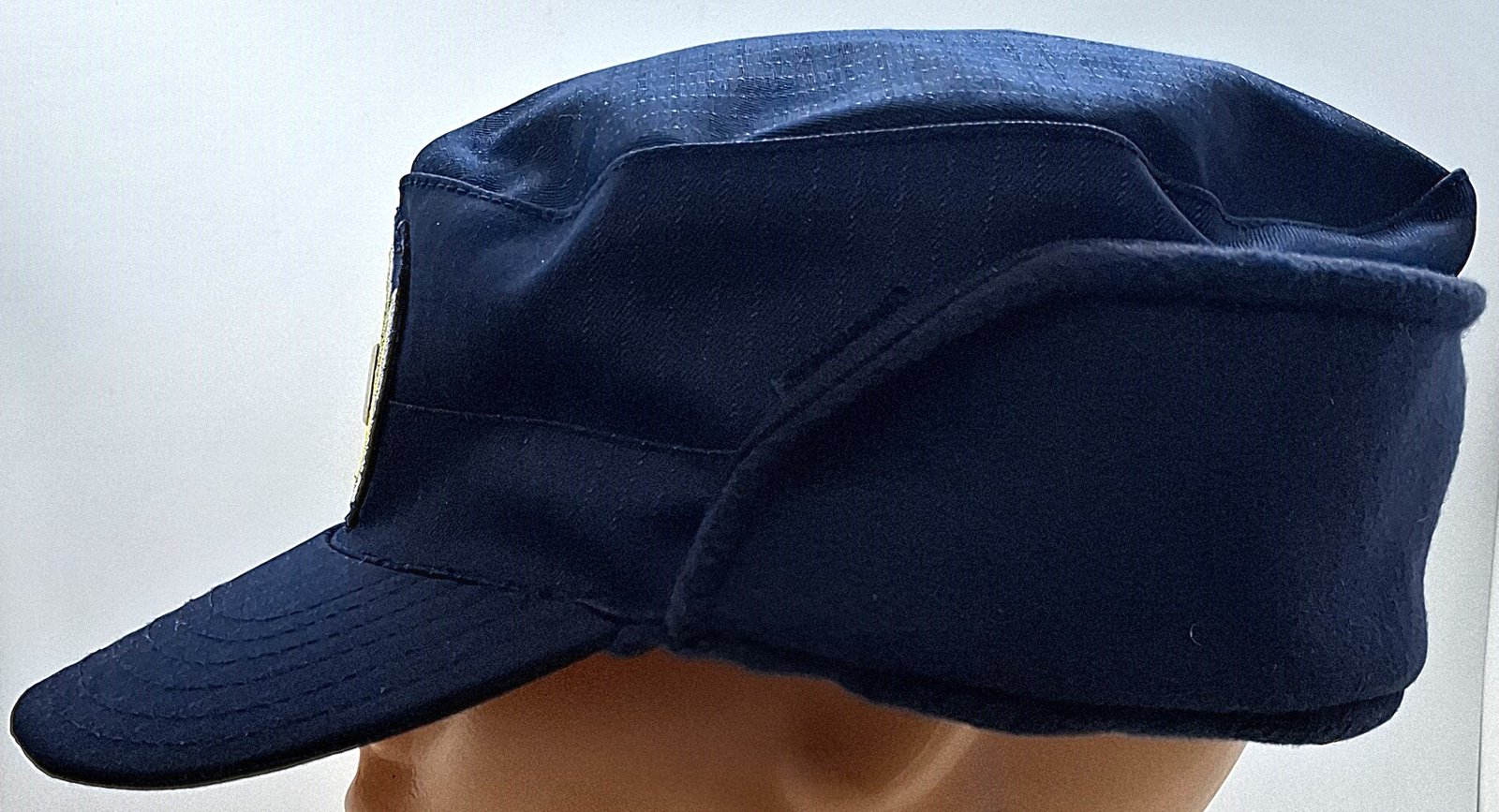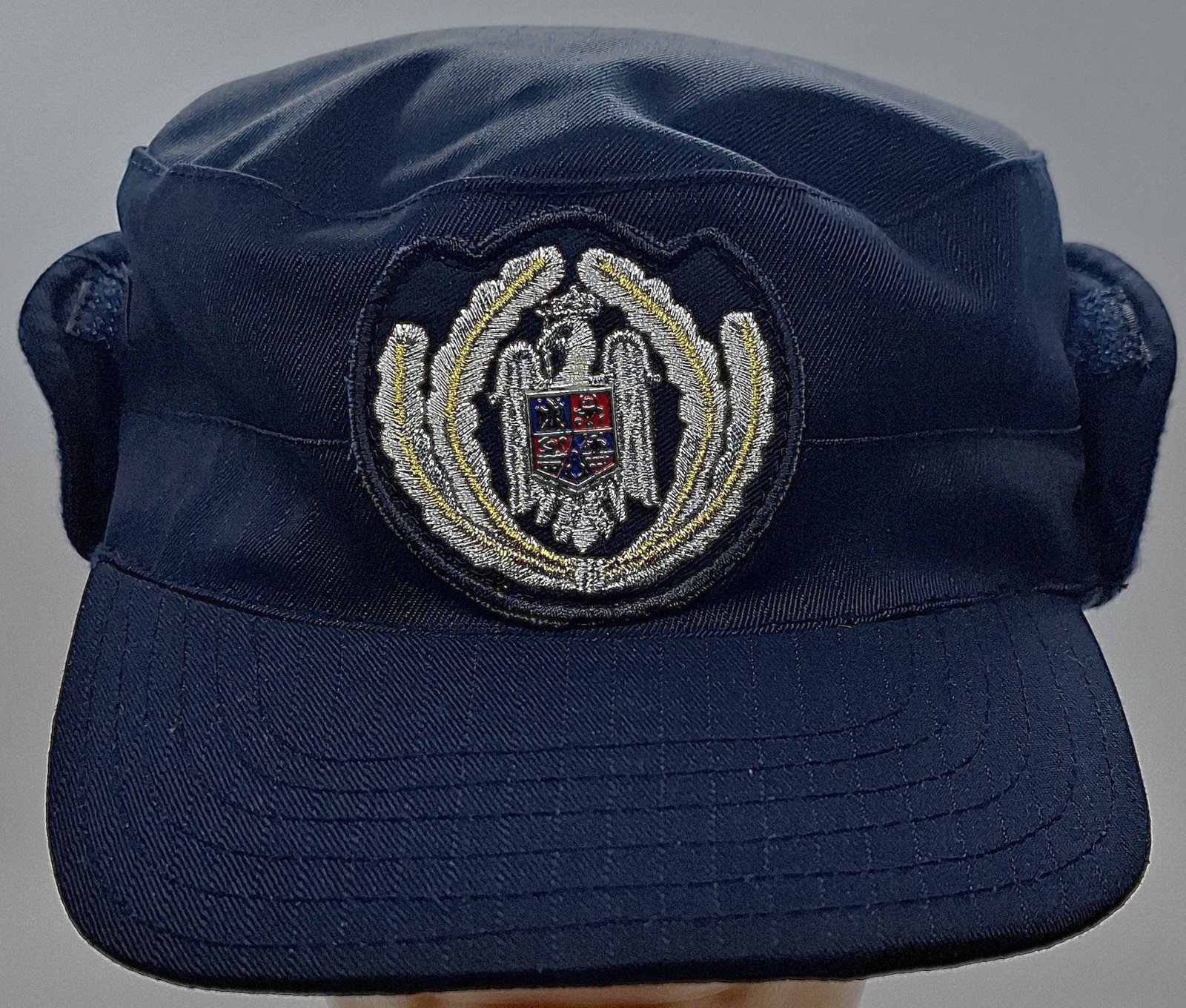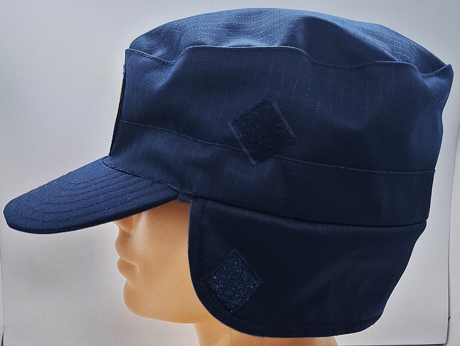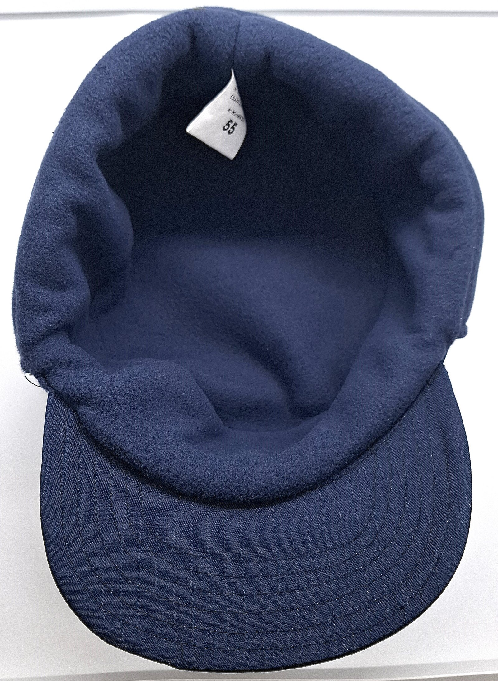 Czapka w formie kepi. Materiałem zasadniczym jest tkanina ripstop w kolorze granatowym. Denko owalne, otok jednoczęściowy, zszyty z tyłu. Na otoku wietrzników. W dolnej części otoku naszyty drugi pasek materiału zasadniczego. Do otoku doszyta jednoczęściowa klapa obszyta polarem w kolorze materiału zasadniczego. Klapa przypinana na rzep samosczepny. Wnętrze wyłożone polarem. Brak potnika. Metka producenta, rozmiaru i daty w tylnej części w zszyciu polaru. Na metce stempel "C.T.C.4" - Controlul Tehnic de Calitate, rumuński znak kontroli jakości. Daszek sztywny, obszyty materiałem zasadniczym, przeszyty sześć razy. Odznaka haftowana na podkładce z materiału w kolorze ciemniejszym, granatowym. W miejscu odznaki brak usztywnienia.
