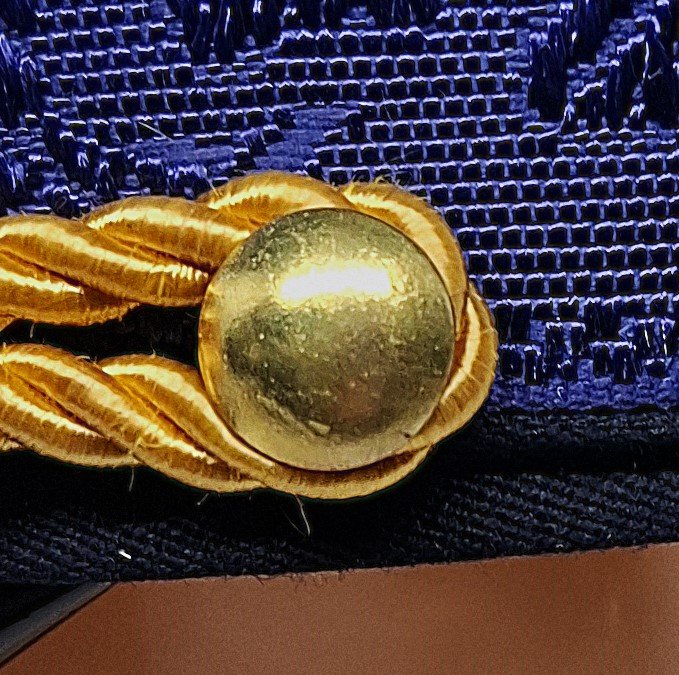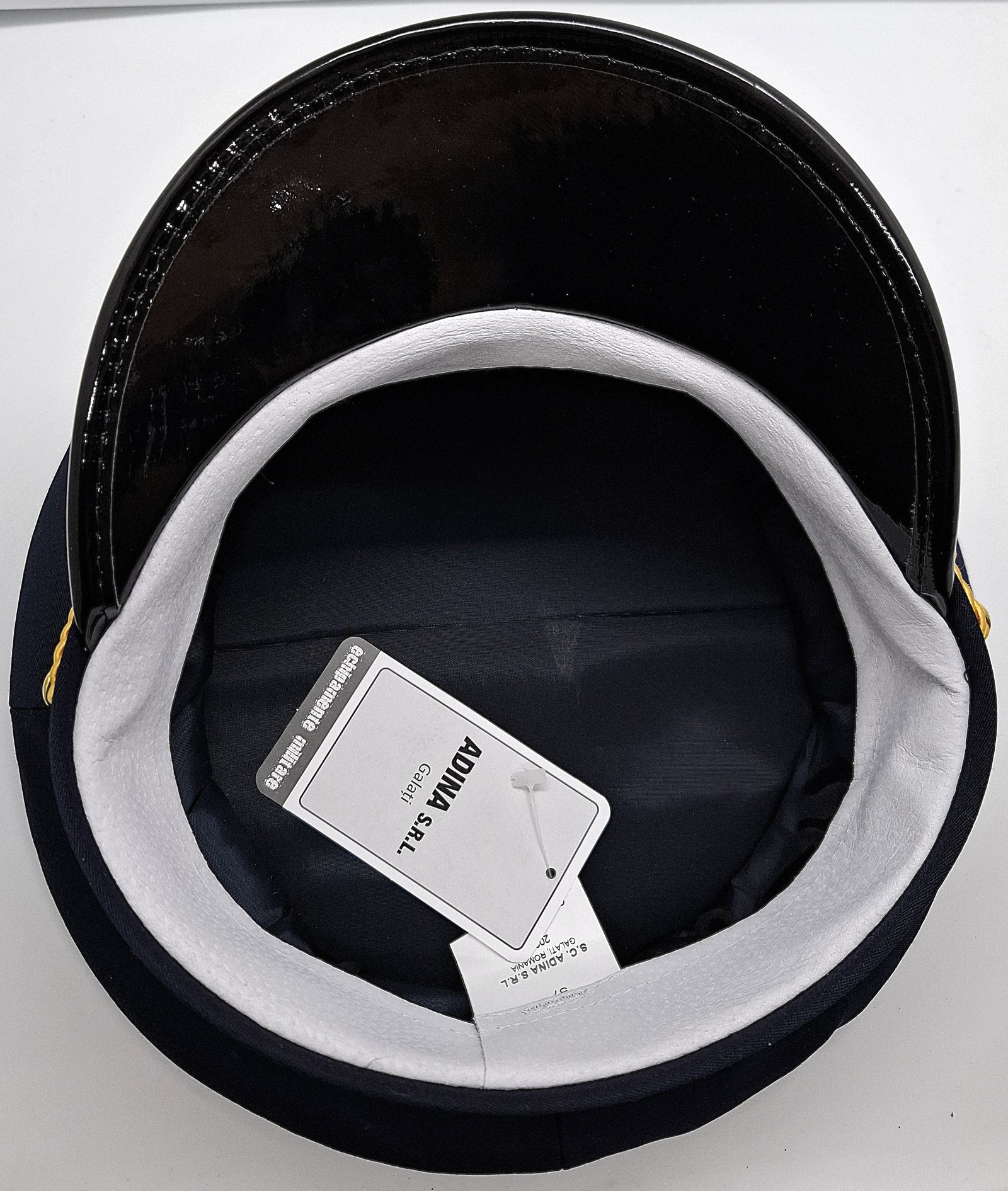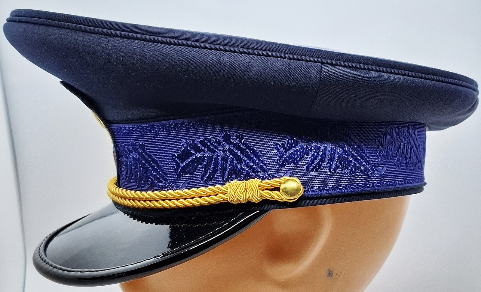 Materiał zasadniczy granatowy, podobnego splotu do tropiku. Góra denka wykonana z jednego kawałka materiału. Dolna część z 4 kwater. Brak wietrzników. Otok sztywny, obszyty materiałem zasadniczym. W rancie denka jak i na zszyciu kwater i otoku wypustka z materiału zasadniczego.Sztywnik w otoku prawdopodobnie tworzywowy. Na otoku taśma otokowa koloru ciemnoniebieskiego zdobionego haftowanymi liśćmi dębu(?) wsparta ślepą wypustką. Czapka posiada sztywny daszek obłożony czarnym lśniącym tworzywem. Złoty sznurek pełni rolę bardziej ozdobną niż rodzaj paska podbródkowego. Jest on przypięty guzikami po obu stronach czapki. Guziki metalowe, gładkie, złote z metalowymi wąsami. Wewnątrz wyłożona jedwabnopodobnym (atłasowym?) materiałem w kolorze czarnym. Wokół otoku potnik skórzany, biały, delikatny, jednolity, zszyty w tylnej części. W miejscu zszycia metka producenta, rozmiaru i daty. Na metce stempel "C.T.C." - Controlul Tehnic de Calitate, rumuński znak kontroli jakości. W całych przednich kwaterach znajduje się gąbczaste wypełnienie utrzymujące kształt i formę czapki. W rancie denka metalowa(?) taśma o szerokości ok. 3 mm utrzymująca okrągłą formę czapki. Pod odznaką wewnątrz czapki dodatkowe usztywnienie sięgające rantu denka. Odznaka haftowana na podkładce z materiału w kolorze ciemniejszym, granatowym.