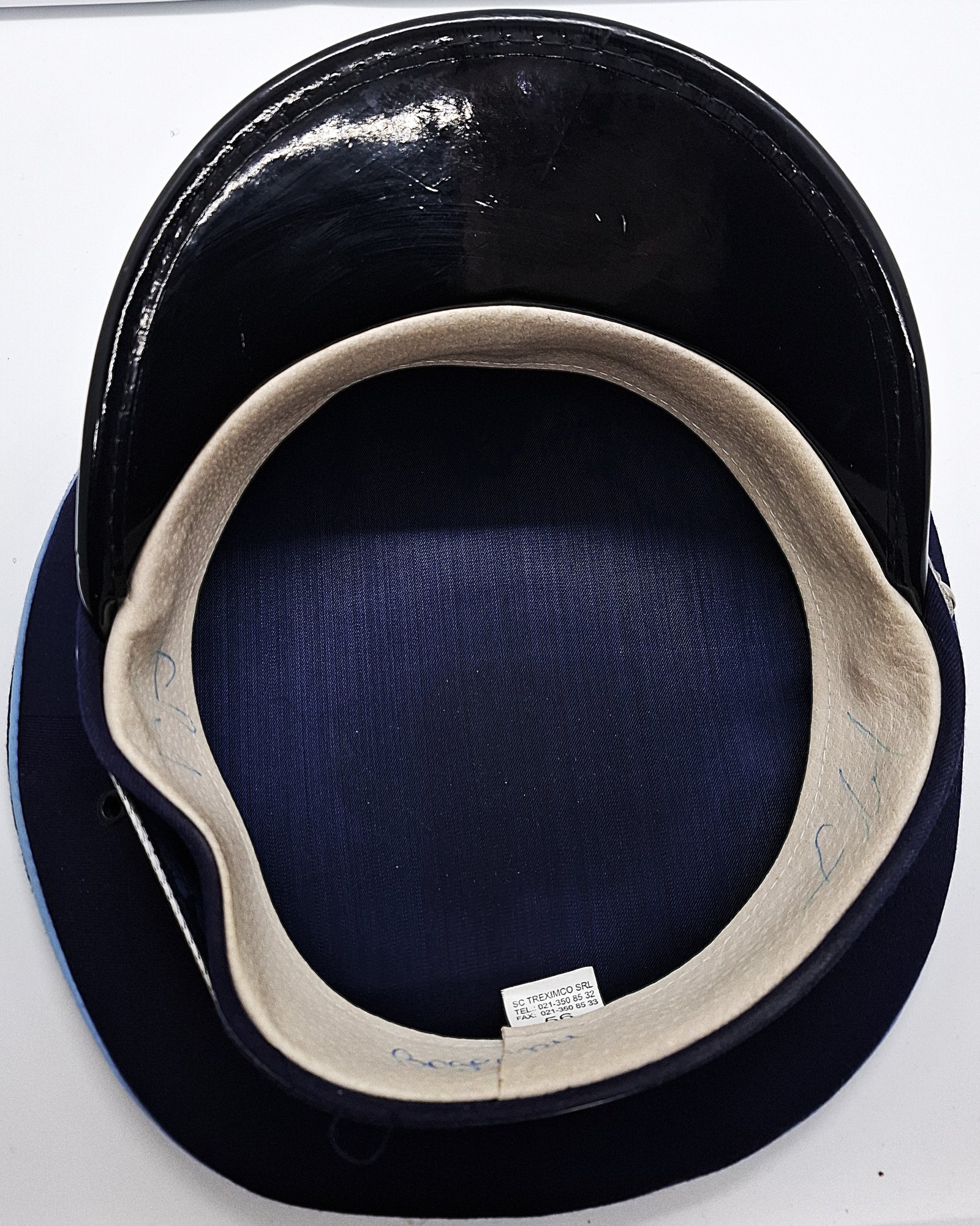 Materiał zasadniczy granatowy, podobnego splotu do gabardyny. Góra denka wykonana z jednego kawałka materiału. Dolna część z 4 kwater. Wietrzniki rozmieszczone symetrycznie do bocznych zszyć kwater. Otok sztywny, obszyty materiałem zasadniczym. W rancie denka wypustka koloru błękitnego. Sztywnik w otoku prawdopodobnie tworzywowy. Na otoku taśma otokowa koloru ciemnoniebieskiego zdobionego haftowanymi liśćmi dębu(?) wsparta ślepą wypustką. Czapka posiada sztywny daszek obłożony czarnym lśniącym tworzywem. Srebrny pasek pełni rolę bardziej ozdobną niż rodzaj paska podbródkowego. Jest on przypięty guzikami po obu stronach czapki. Guziki metalowe, gładkie, srebrne z metalowymi wąsami. Wewnątrz wyłożona jedwabnopodobnym (atłasowym?) materiałem w kolorze grafitu. Wokół otoku potnik skórzany, biały, delikatny, jednolity, zszyty w tylnej części. W miejscu zszycia metka producenta, rozmiaru i daty. W całych przednich kwaterach znajduje się gąbczaste wypełnienie utrzymujące kształt i formę czapki. W rancie denka metalowa(?) taśma o szerokości ok. 3 mm utrzymująca okrągłą formę czapki. Pod odznaką wewnątrz czapki dodatkowe usztywnienie sięgające rantu denka. Odznaka haftowana na podkładce z materiału w kolorze ciemniejszym, granatowym.
