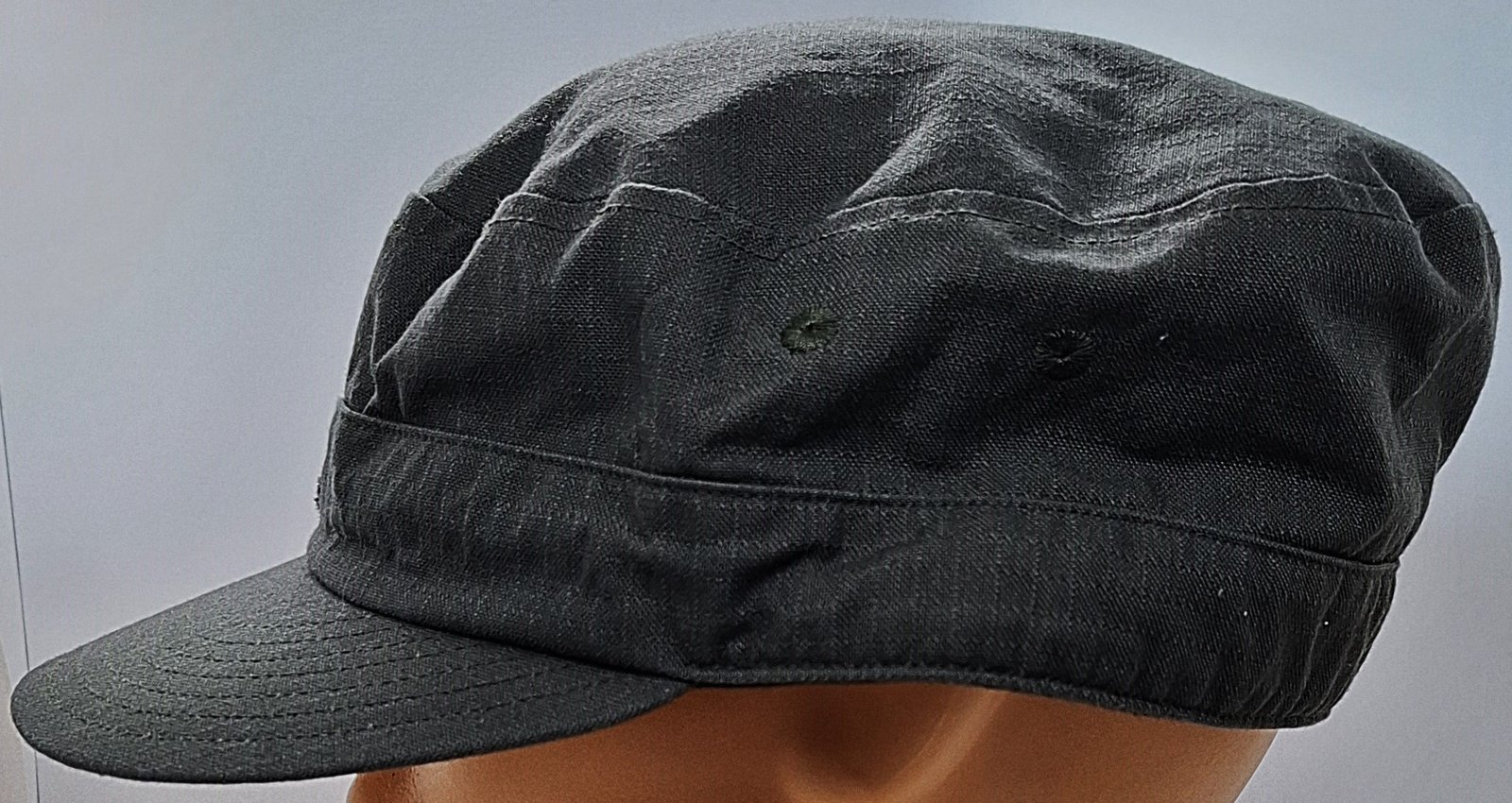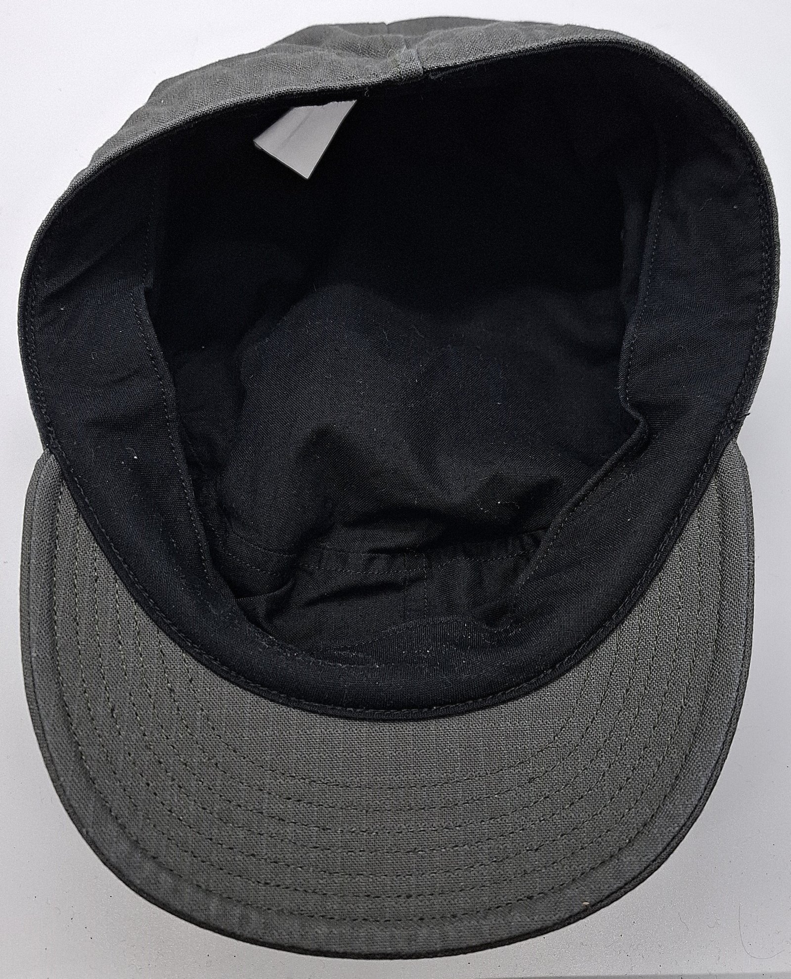 Materiał zasadniczy w kolorze szarym. Czerep czapki zszyty z denka i otoku wykonanego z dwóch bocznych kwater. Po bokach po dwa wietrzniki. Otwory obszyte nićmi. Brak regulacji rozmiaru. Daszek z usztywniaczem z siedmioma przeszyciami. Na froncie haftowana odznaka na czarnej podkładce. We wnętrzu czarna, materiałowa podszewka. Potnik z materiału podszewki. W tylnym zszyciu kwater wszyta metka.