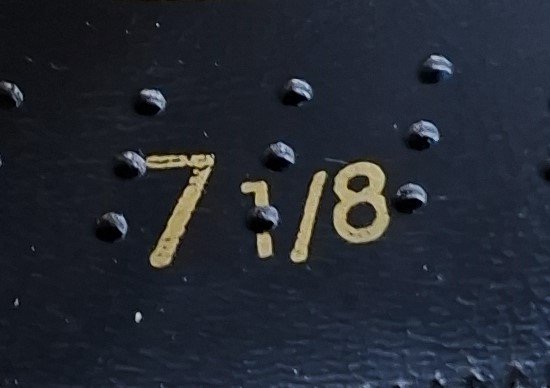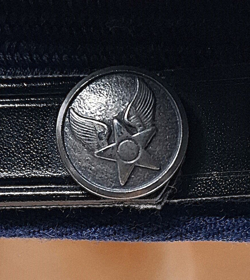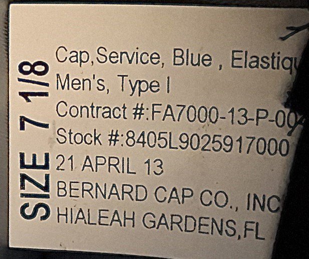 Materiał zasadniczy zbliżony do gabardyny w kolorze granatowym. Kształt czapki przyjmuje formę okrągłą denka. Przednie kwatery usztywnione. Wietrzniki metalowe, lakierowane na czarno symetrycznie po obu stronach bocznych zszyć kwater. Wewnątrz całe denko wyłożone transparentnym tworzywem. Pod nim, metka właściciela i producenta. Denko usztywnione prętem tworzywowym w formie plecionej rurki. Potnik wykonany ze skóry w kolorze czarnym. Potnik związany jedwabną wstążką w tylnej części czapki. Na potniku stempel z rozmiarem "7 1/4" i producentem. Daszek czarny, tworzywowy, gładki z góry, od spodu szary, porowaty. Na skraju naszyty rant tworzywowy, srebrny, gładki. Całość usztywniona (tekturą, tworzywem?). Pasek podbródkowy skórzany, czarny. Przytwierdzony dwoma metalowymi, tłoczonymi guzikami. Guziki mocowane na słupek. Odznaka czapki to bielik amerykański z rozłożonymi skrzydłami. W lewym szponie trzyma 13 strzał symbolizujących 13 kolonii. W prawym trzyma gałązkę oliwną, co symbolizuje odpowiednio wojnę i pokój. Głowa orła, zwrócona w kierunku gałązki, ma symbolizować nadrzędność pokoju. Odznaka mocowana na słupek. Usztywnienie otoku wykonane prawdopodobnie z grubego tworzywa sztucznego. Otok z plecionej taśmy w kolorze granatowym. Nad otokiem srebrny galon. W tylnej części czapki, na otoku drugi pasek mocowany na tych samych guzikach, zapinany na metalową klamerkę.