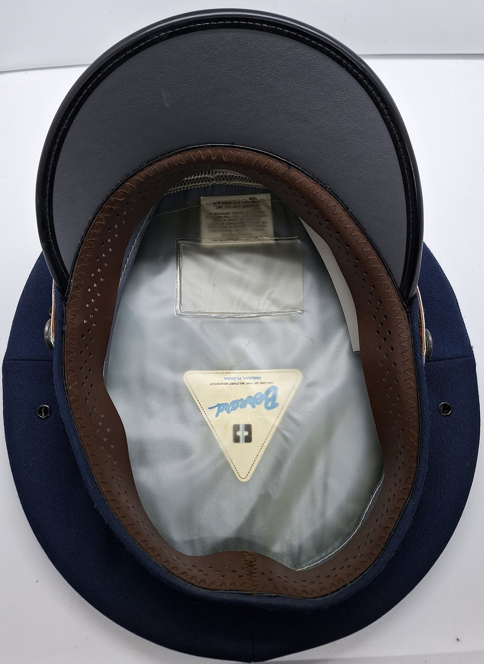 Materiał zasadniczy podobny do gabardyny w kolorze granatowym. Kształt czapki przyjmuje formę okrągłą denka. Brak usztywnienia w kwaterach przednich. Wietrzniki metalowe, lakierowane na czarno symetrycznie po obu stronach bocznych zszyć kwater. Wewnątrz całe denko wyłożone foliową osłoną. Pod nią, metka producenta. Denko usztywnione prętem tworzywowym w formie plecionej rurki. Potnik wykonany ze skóry w kolorze brązowym. Potnik zszyty w tylnej części czapki. W tylnej części denka metka z rozmiarem. Daszek czarny, z góry wyłożony pękającym tworzywem. Daszek z góry czarny, od spodu porowaty, tworzywowy, szary. Na skraju naszyty rant tworzywowy, gładki. Całość usztywniona (tekturą, tworzywem?). Pasek pleciony ze srebrnych nici. Przytwierdzony dwoma metalowymi, tłoczonymi guzikami. Guziki mocowane na słupek. Odznaka czapki będąca godłem USA (Bielik amerykański z rozłożonymi skrzydłami. W lewym szponie trzyma 13 strzał symbolizujących 13 kolonii. W prawym trzyma gałązkę oliwną, co symbolizuje odpowiednio wojnę i pokój. Głowa orła, zwrócona w kierunku gałązki, ma symbolizować nadrzędność pokoju. Dziobem chwyta wstęgę z napisem "E Pluribus Unum - Z wielości, jedność". Nad głową znajduje się nimb z 13 gwiazdami. Odznaka mocowana na słupek. Usztywnienie otoku wykonane prawdopodobnie z grubego tworzywa sztucznego. Otok pleciony w kolorze granatowym.