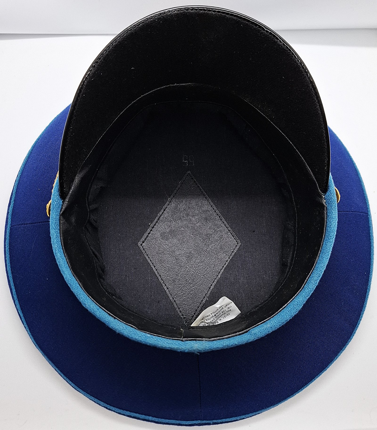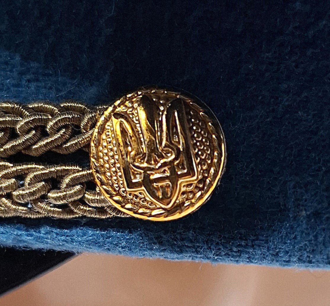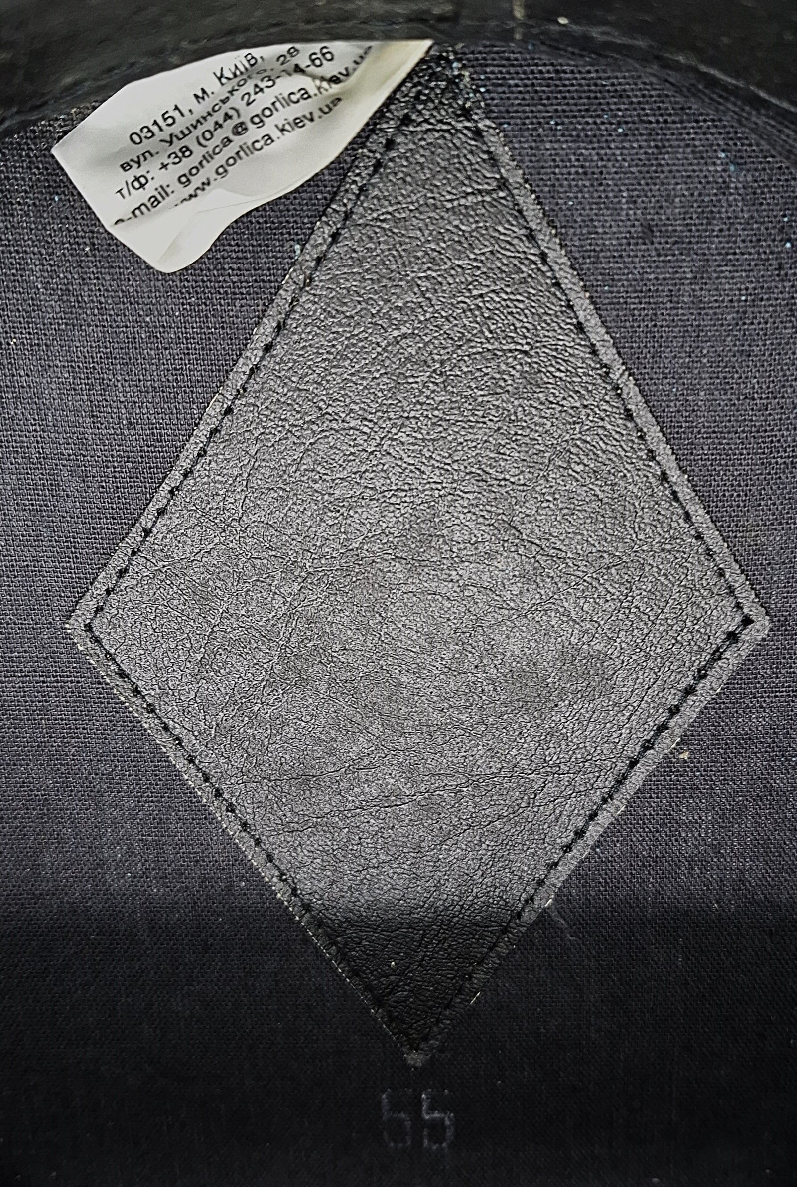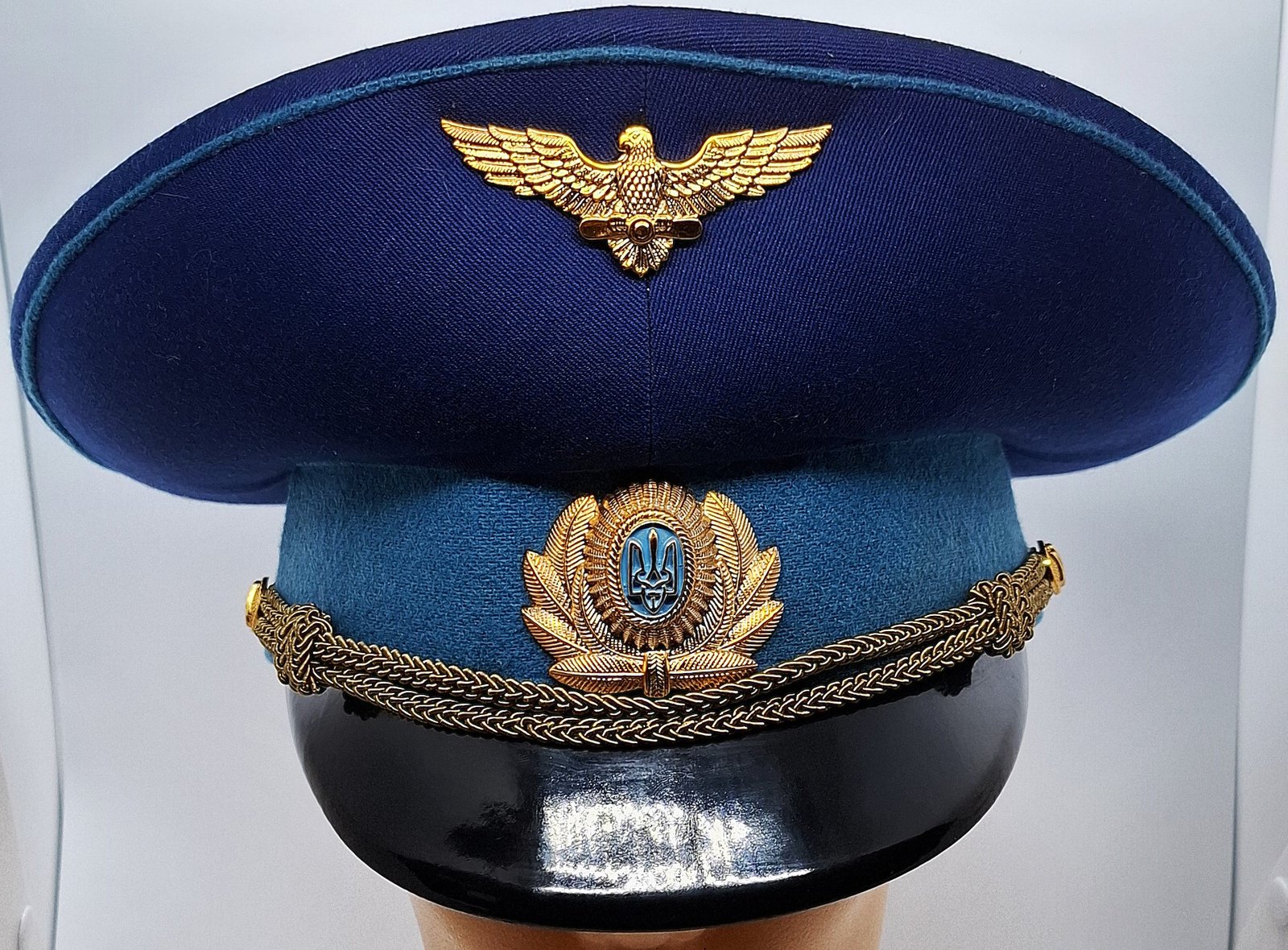 Materiał zasadniczy to gabardyna w kolorze granatowym. Kształt czapki przyjmuje formę okrągło denka. Między dnem, a kwaterami wszyta wypustka w kolorze otoku (niebieskie sukno). Przednie kwatery wypełnione puszystym materiałem (tworzywem) jak gąbka. W całym wnętrzu znajduje się materiał podobny do płótna w kolorze czarnym. Na środku wszyty skóropodobny romb w kolorze czarnym, niżej stempel z rozmiarem. Denko usztywnione prętem. Potnik wykonany ze skóropodobnego materiału w kolorze czarnym zszyty z tyłu czapki. Daszek wykonany z czarnego, gładkiego tworzywa z góry. Od spodu wszyte czarne sukno. Całość usztywniona (tekturą?). Pasek podbródkowy w formie plecionego żółtego sznurka przypiętego dwoma tworzywowymi złotymi guzikami z godłem Ukrainy - tryzubem. Guziki mocowane za pomocą metalowych wąsów. Usztywnienie otoku wykonane prawdopodobnie z grubego tworzywa sztucznego. Na przodzie otoku metalowa, tłoczona odznaka mocowana dwoma metalowymi wąsami. Na kwaterach odznaka orła ze śmigłem w szponach.