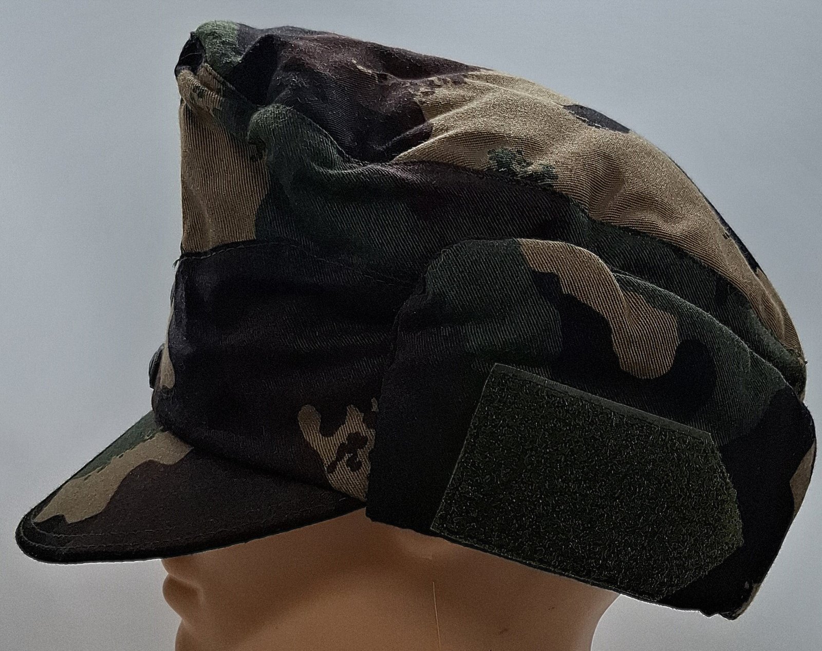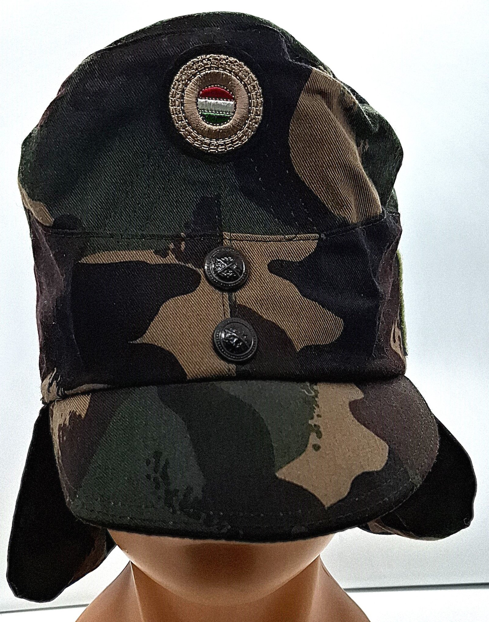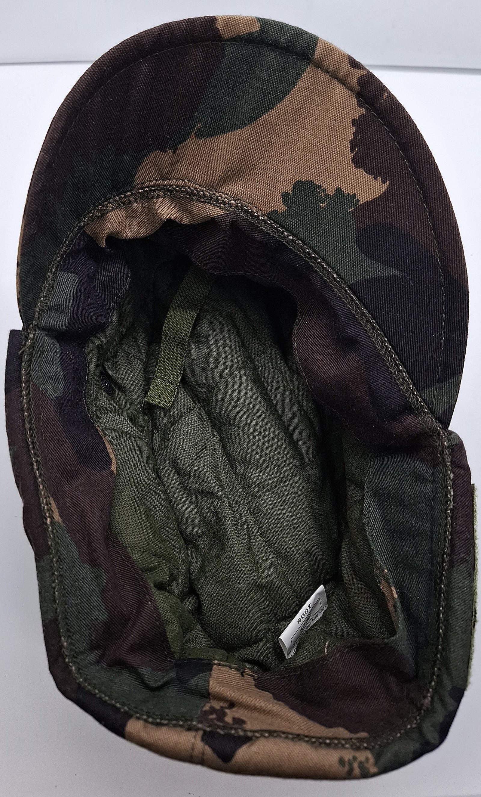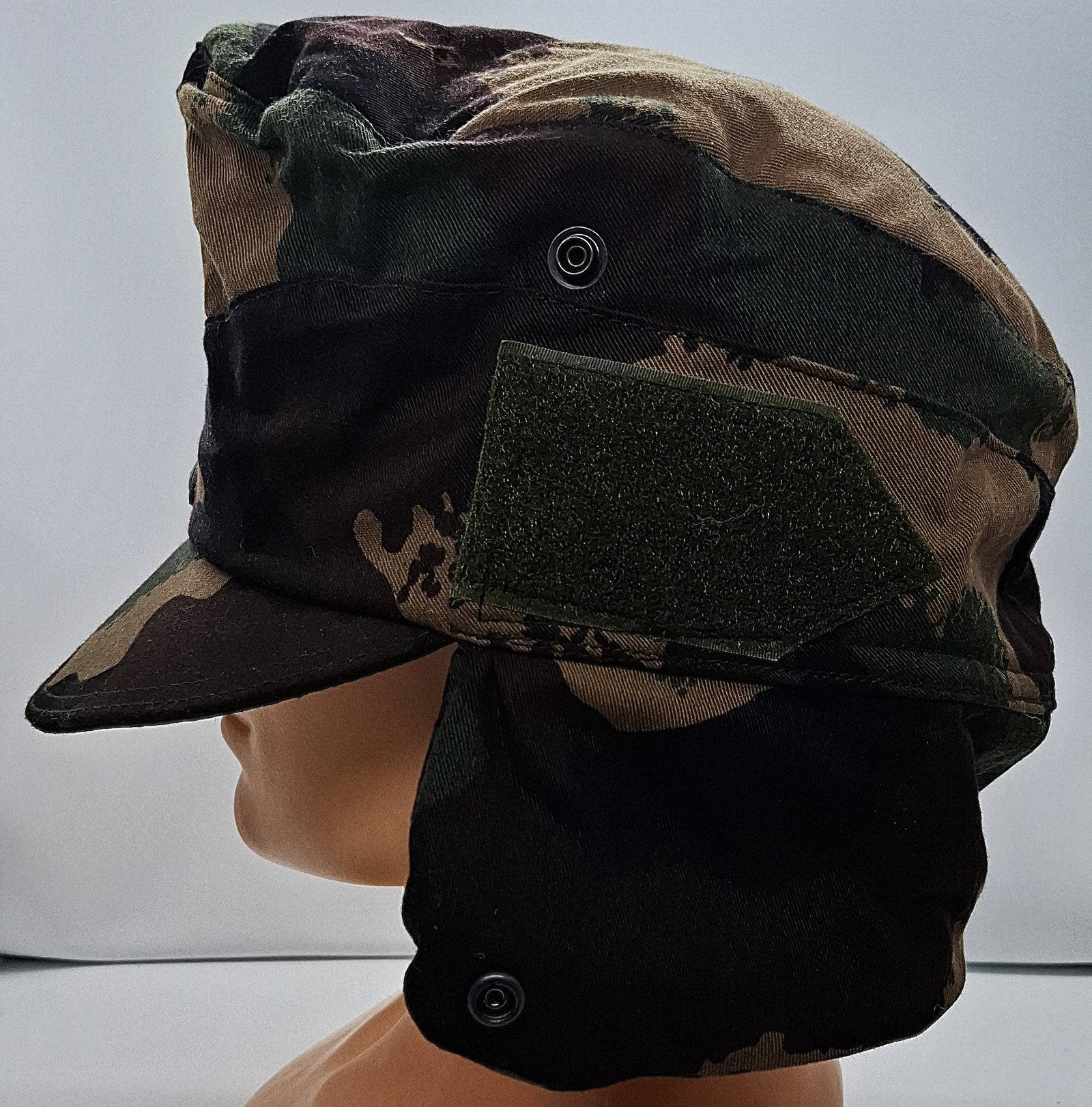 Materiał zasadniczy to tkanina składająca się w 50% z nylonu i 50% z wełny w kamuflażu M1990. Denko w kształcie owalu. Otok zszyty z dwóch bocznych kwater. W przedniej części uniesiony. Wewnątrz podszewka w kolorze grafitowym. W tylnej części metki z producentem i rozmiarem. Potnik z materiału zasadniczego. Daszek elastyczny, obszyty materiałem zasadniczym, przeszyty dwukrotnie. Na zewnątrz otoku imitacja klap spiętych na przodzie dwoma guzikami. Guziki tworzywowe, brązowe z wizerunkiem skrzyżowanych karabinów na wieńcu laurowym. Rzeczywiste klapy przypięte na zatrzaski. Otok, denko i boczne klapy wypełnione rodzajem izolującego puchu. Na froncie naszyta haftowana kokarda z flagą