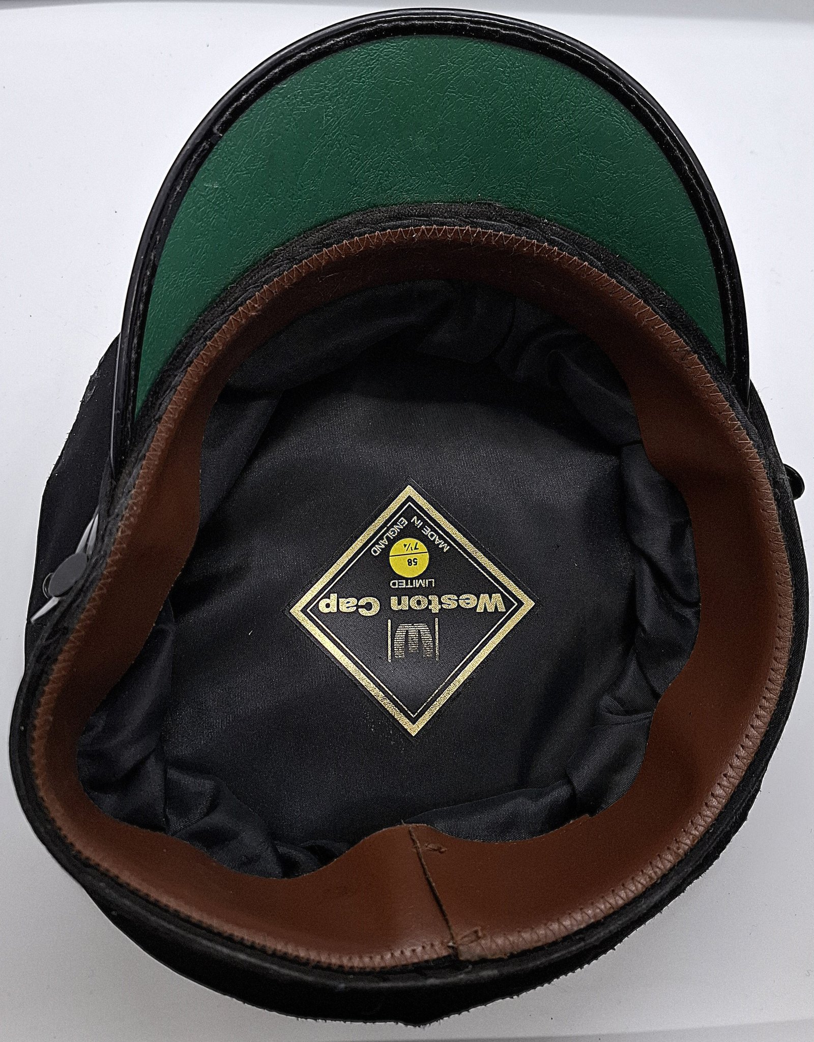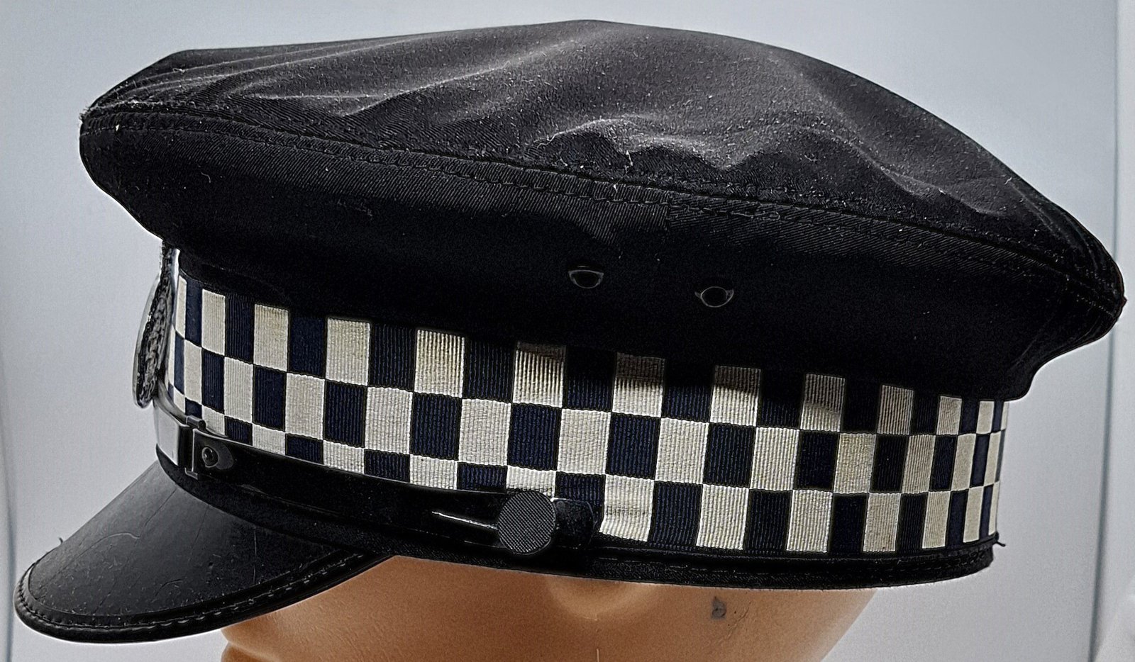 Czapka flat cap (męska) używana przez funkcjonariuszy pieszych i mobilnych patroli (foot patrol, mobile patrol) w stopniach: constable, sergeant, inspector i chief inspector. Otok obszyty materiałem zasadniczym podobnym do gabardyny (drobniejsza). Taśma otokowa wsparta ślepą wypustką. Taśma otokowa materiałowa z wzorem w kratkę biało-granatową. Denko czapki wykonane z materiału zasadniczego. Denko usztywnione bardzo grubym (średnica ok. 2 cm) prętem wykonanym z tworzywowej pianki. W górnej części jednolite, w dolnej 4 kwatery. Symetrycznie do bocznych zszyć po dwa wietrzniki (oczka szewskie). Wewnątrz potnik ze skóry łączony w tylnej części zszyciem. Całe wnętrze wyłożone czarną jedwabną podszewką. W denku wklejona metka producenta. Pasek tworzywowy, czarny, gładki, lśniący. Złożony z dwóch części. Obie z jednej strony przypięte guzikiem, z drugiej klamerka do przesuwania i regulacji długości. Guziki tworzywowe, czarne o średnicy 14 mm, przyszyte. Daszek sztywny, z góry pokryty czarnym tworzywem. W spodniej części porowatym, zielonym. Rant obszyty czarnym tworzywowym paskiem. Odznaka metalowa, tłoczona zasuwana z góry w gniazdo za otokiem.