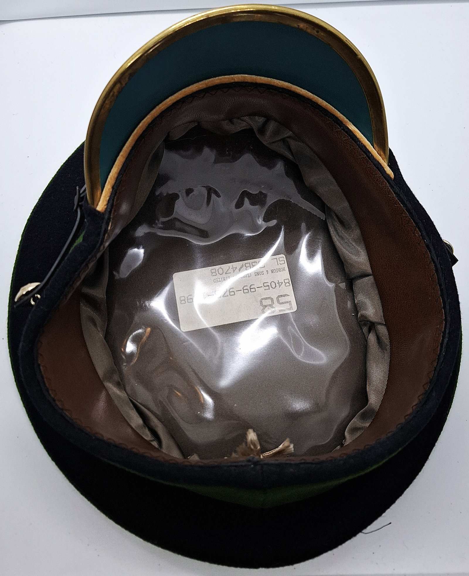 Materiałem zasadniczym jest granatowe sukno. Denko czapki wykonane z materiału zasadniczego. W górnej części jednolite, w dolnej 4 kwatery. W zszyciu denka z kwaterami wypustka z zielonego materiału. Otok z tworzywa (?) obszyty zielonym materiałem. Na dole rant otoku obszyty materiałem zasadniczym. Wewnątrz potnik ze sztucznej skóry (?). Całe wnętrze wyłożone czarną atłasową podszewką z metką i tworzywową, transparentną wkładką jako osłona przed potem. Pasek tworzywowy, czarny, gładki, lśniący. Złożony z dwóch części. Obie z jednej strony przypięte guzikiem, z drugiej klamerka do przesuwania i regulacji długości. Guziki złote, przymocowane na uszko. Na guziku wizerunek Royal Harp Badge of Ireland. Daszek sztywny, z góry pokryty czarnym lśniącym tworzywem. W spodniej części porowatym, zielonym. Rant okuty metalową blaszką. Odznaka metalowa, mocowana na omegi. Na odznace napis motto "Quis Separabit?" - „Kto nas rozdzieli?”. W dolnej części data zapisana pismem rzymskim "MDCCLXXXIII" - to 1783 - data ustanowienia Orderu św. Patryka.