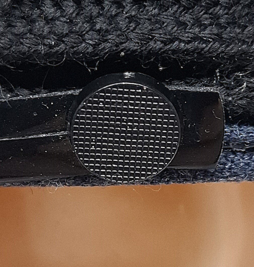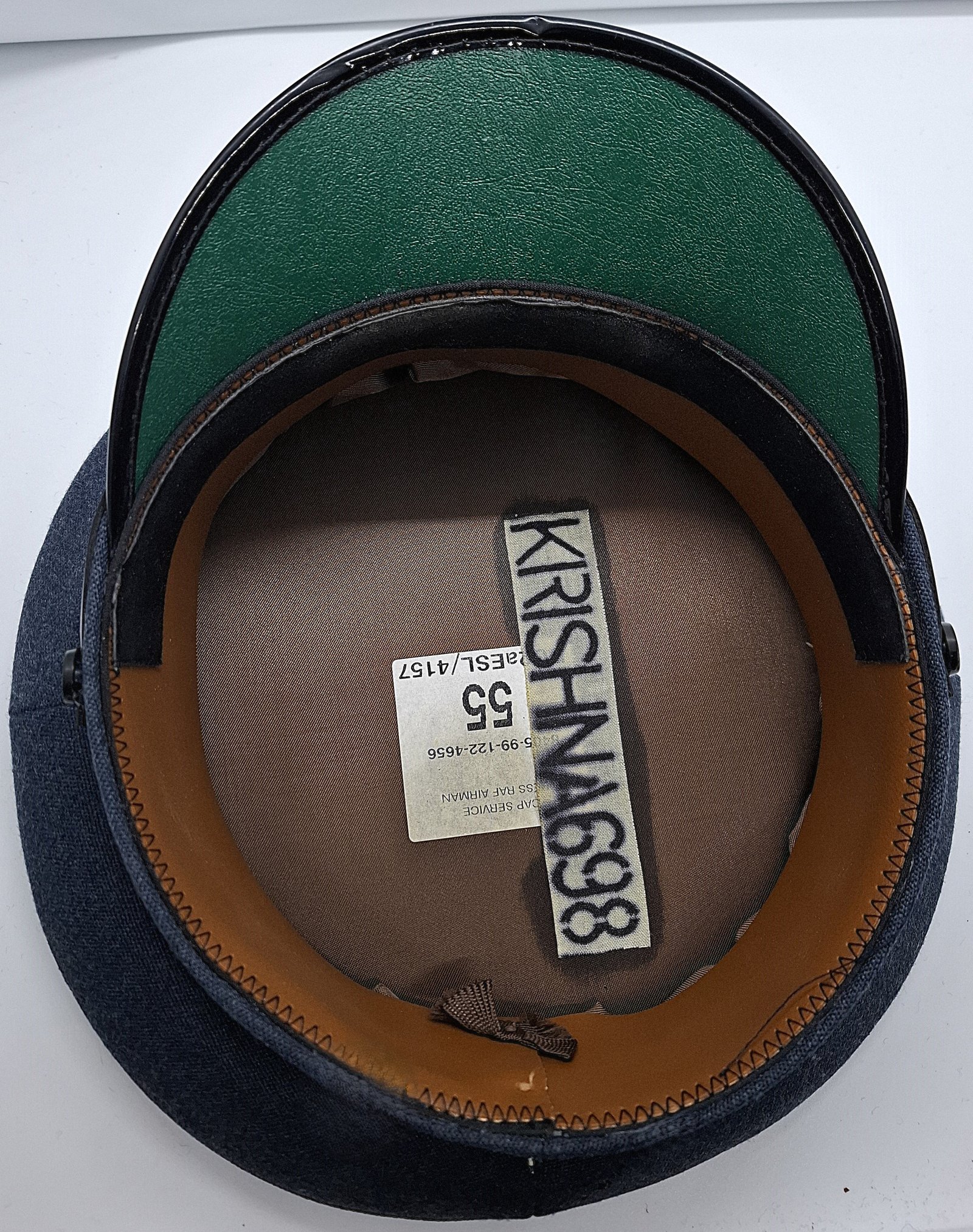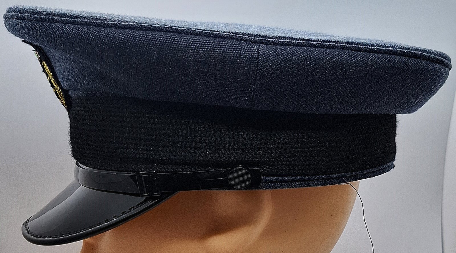 Materiałem zasadniczym jest granatowo-szare (blue-grey) sukno. Otok i denko czapki wykonane z materiału zasadniczego. W górnej części jednolite, w dolnej 4 kwatery. W zszyciu denka z kwaterami wypustka z materiału zasadniczego. Otok z tworzywa (?) obszyty materiałem zasadniczym. Na dole otoku ślepa wypustka do podtrzymania taśmy otokowej. Taśma otokowa pleciona, czarna. Wewnątrz potnik ze sztucznej skóry (?). W przedniej części potnika wszyty czarny, zamszowy pasek. Całe wnętrze wyłożone czarną atłasową podszewką. Pasek tworzywowy, czarny, gładki, lśniący. Złożony z dwóch części. Obie z jednej strony przypięte guzikiem, z drugiej klamerka do przesuwania i regulacji długości. Guziki tworzywowe, czarne, przymocowane na metalowe wąsy. Na guziku faktura kratki. Daszek sztywny, z góry pokryty czarnym lśniącym tworzywem. W spodniej części porowatym, zielonym. Rant obszyty czarną tworzywową lamówką. Odznaka haftowana metalizowanymi nićmi na czarnym materiale.