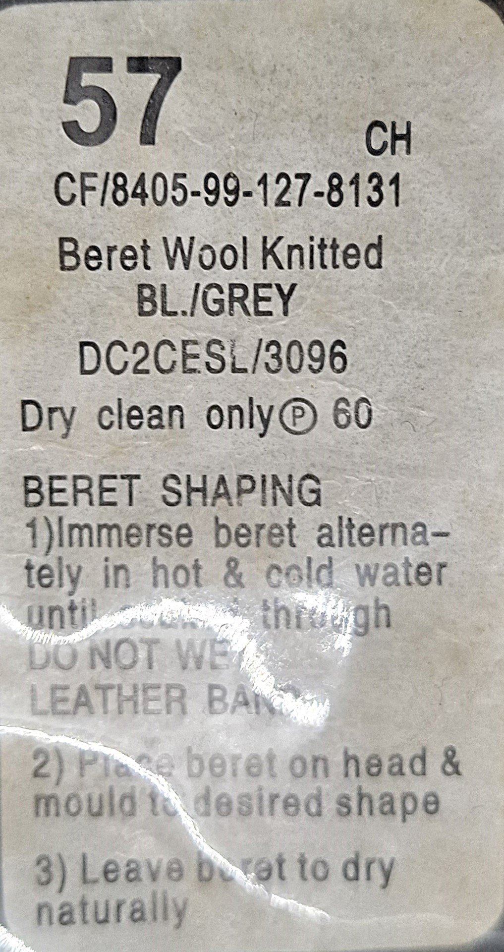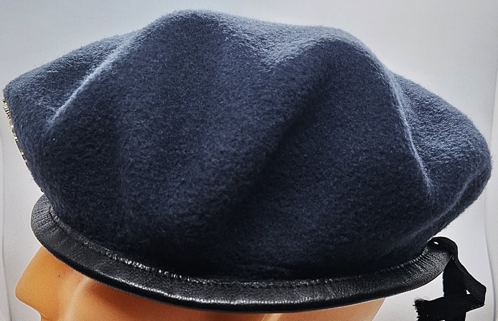 Beret tłoczony, koloru blue gray, z podszewką i wszytą metką. Pod odznaką, wewnątrz, usztywnienie i okrągła metalowa podkładka. Lamówka ze skóry z materiałową tasiemką do regulacji rozmiaru.