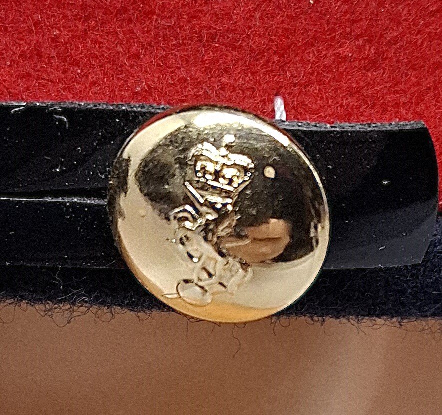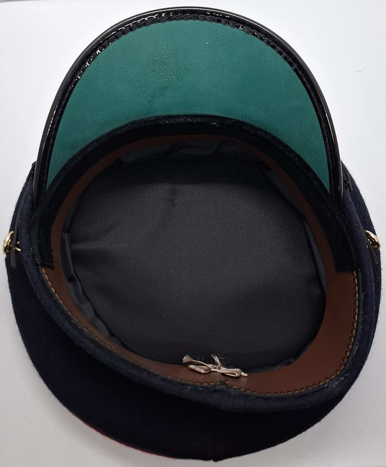 Materiałem zasadniczym jest czarne (granatowe?) sukno. Denko czapki wykonane z materiału zasadniczego. W górnej części jednolite, w dolnej 4 kwatery. W zszyciu denka z kwaterami wypustka z czerwonego materiału. Otok z tworzywa (?) obszyty czerwonym materiałem. Na dole rant otoku obszyty materiałem zasadniczym. Wewnątrz potnik ze sztucznej skóry (?). W przedniej części potnika wszyty czarny, zamszowy pasek. Całe wnętrze wyłożone czarną atłasową podszewką. Pasek tworzywowy, czarny, gładki, lśniący. Złożony z dwóch części. Obie z jednej strony przypięte guzikiem, z drugiej klamerka do przesuwania i regulacji długości. Guziki złote, przymocowane na uszko. Na guziku wizerunek odznaki jednostki. Daszek sztywny, z góry pokryty czarnym lśniącym tworzywem. W spodniej części porowatym, zielonym. Rant obszyty czarną tworzywową lamówką. Odznaka metalowa, mocowana na szynie z napisem "J. R. GAUNT B'HAM".