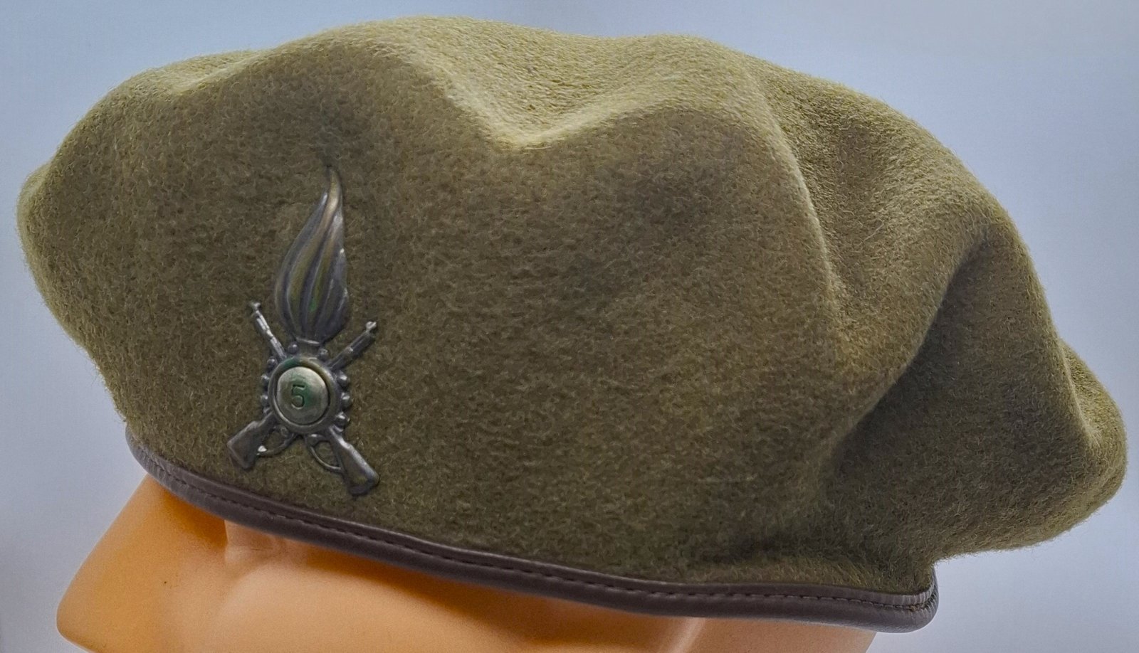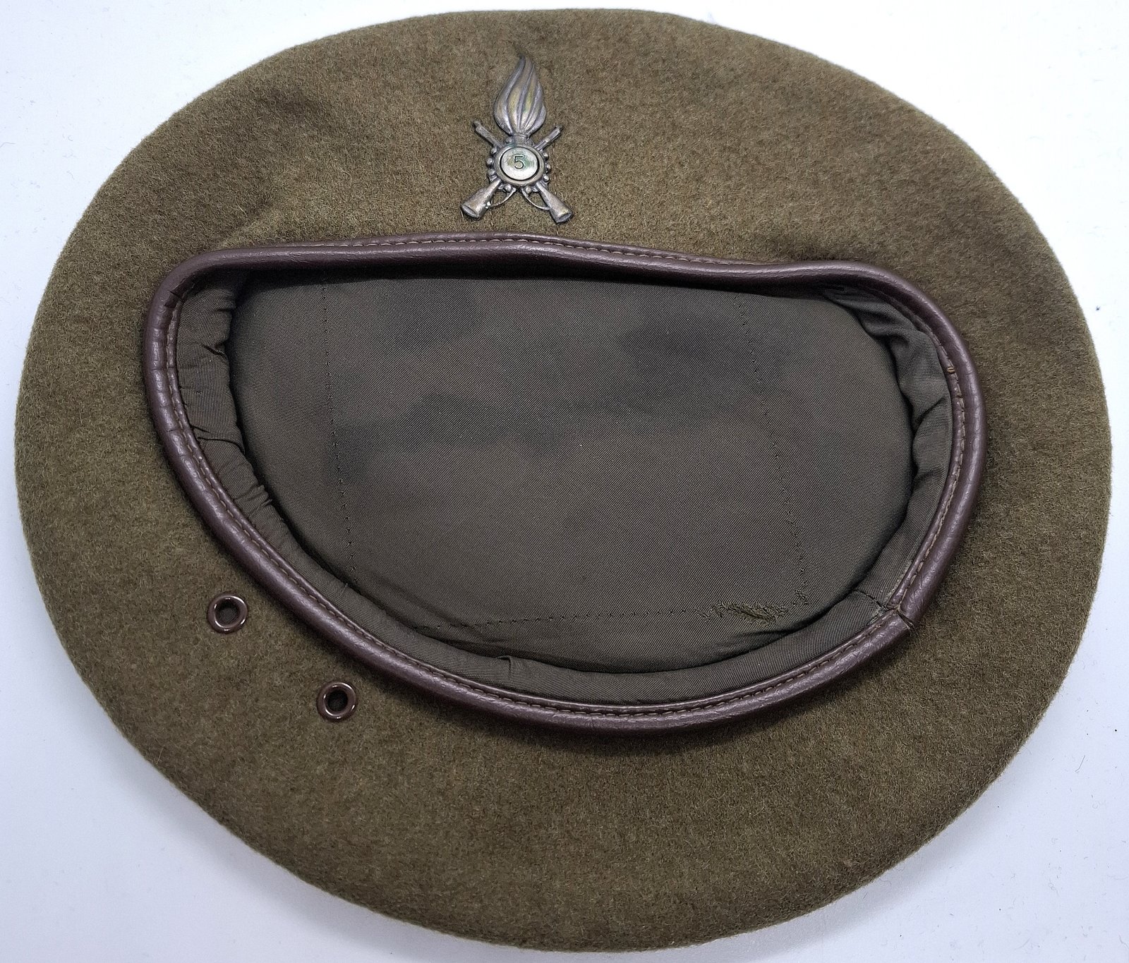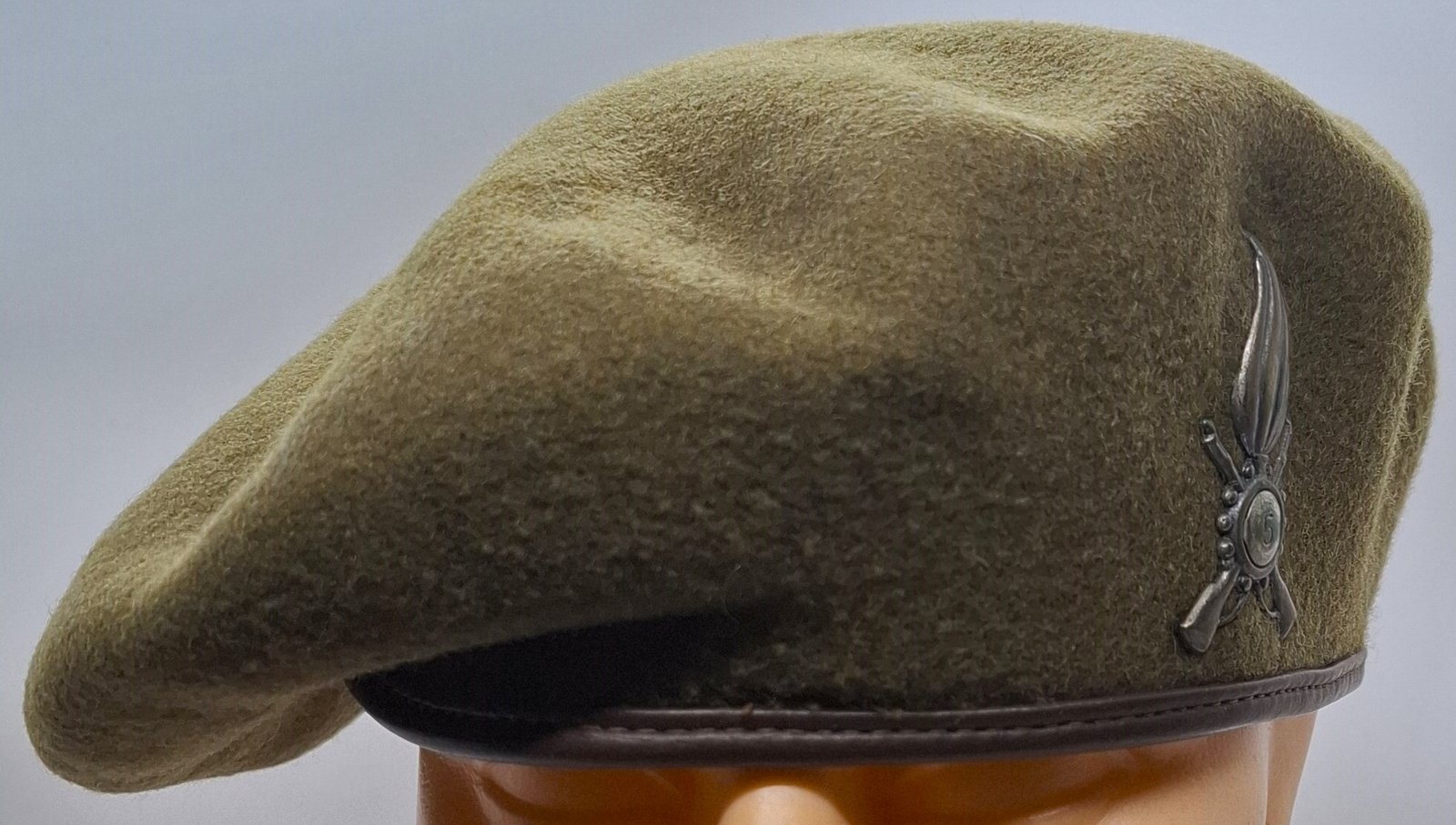 Beret tłoczony, sukienny, khaki. Wewnątrz aksamitna(?), podszewka w kolorze materiału zasadniczego. Lamówka wykonana ze skóry. Wewnątrz brak materiałowej taśmy do regulacji rozmiaru. Pod odznaką półokrągła podkładka. Miejsce przypięcia dodatkowo podszyte skórą. Na odznace (fregio basco - odznaka beretowa) przypięta wypukła, blaszana tarczka (pulce dischetto) z numerem pododdziału. Odznaka przypinana na dwie omegi i wsuwkę.