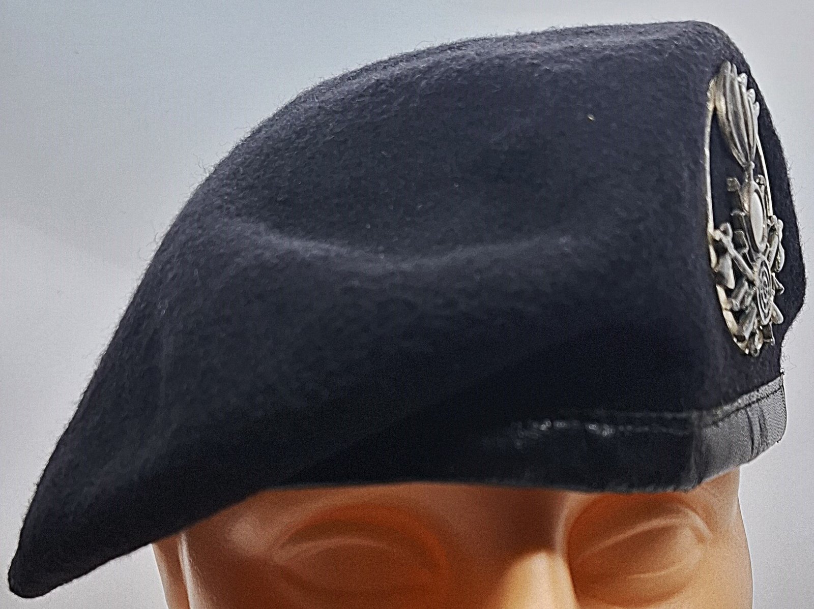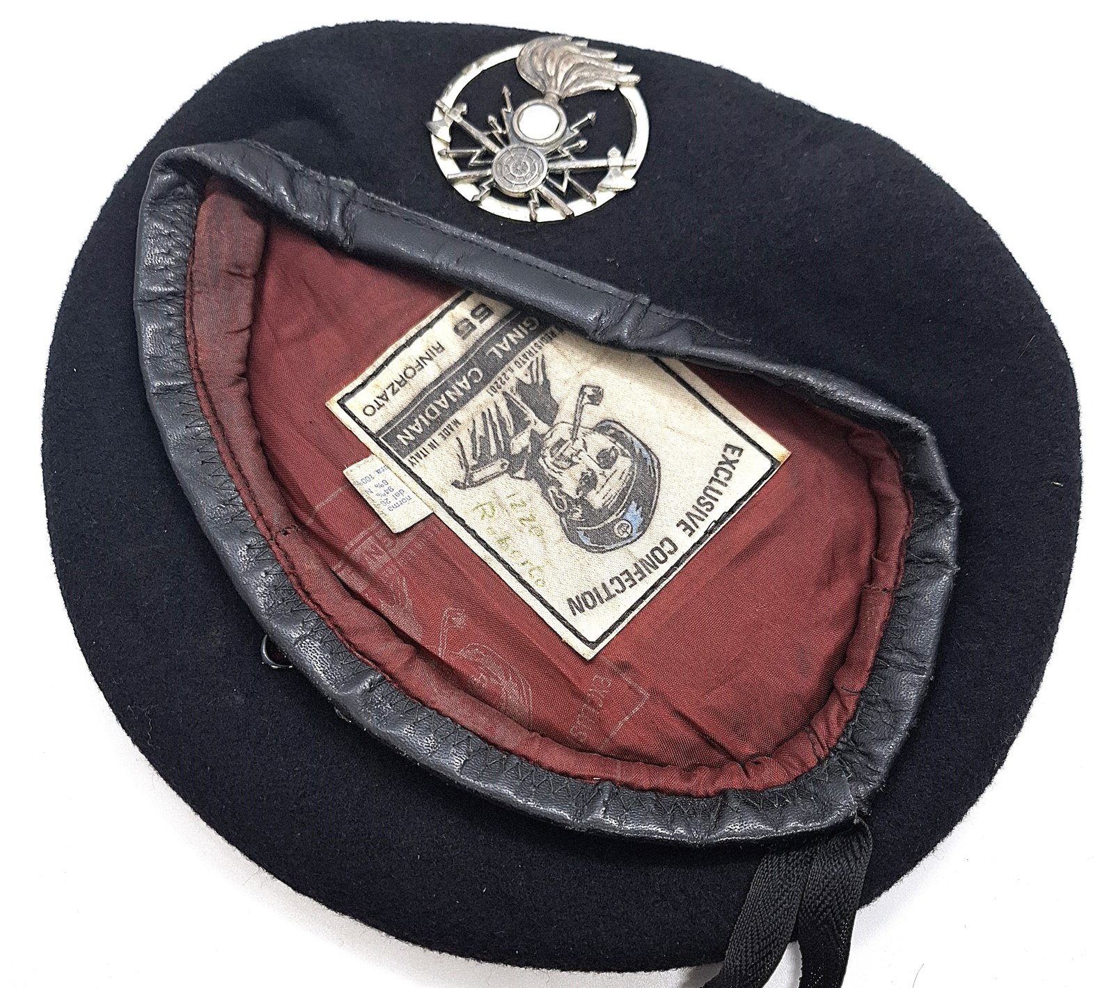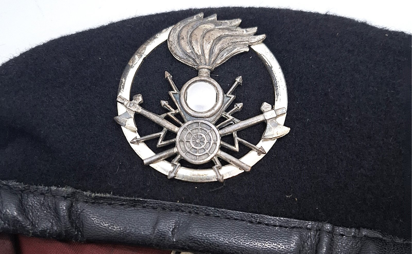 Beret tłoczony, sukienny, czarny. Wewnątrz aksamitna, bordowa podszewka z metką producenta i rozmiarem. Lamówka wykonana ze skóry. Wewnątrz materiałowa taśma do regulacji rozmiaru. Pod odznaką półokrągła podkładka. Miejsce przypięcia dodatkowo podszyte skórą. Na odznace (fregio basco - odznaka beretowa) miejsce na przypinaną wypukłą, blaszaną tarczkę (pulce dischetto) z numerem pododdziału. Tu przypięta pusta blaszka. Odznaka przypinana na dwie omegi i wsuwkę.