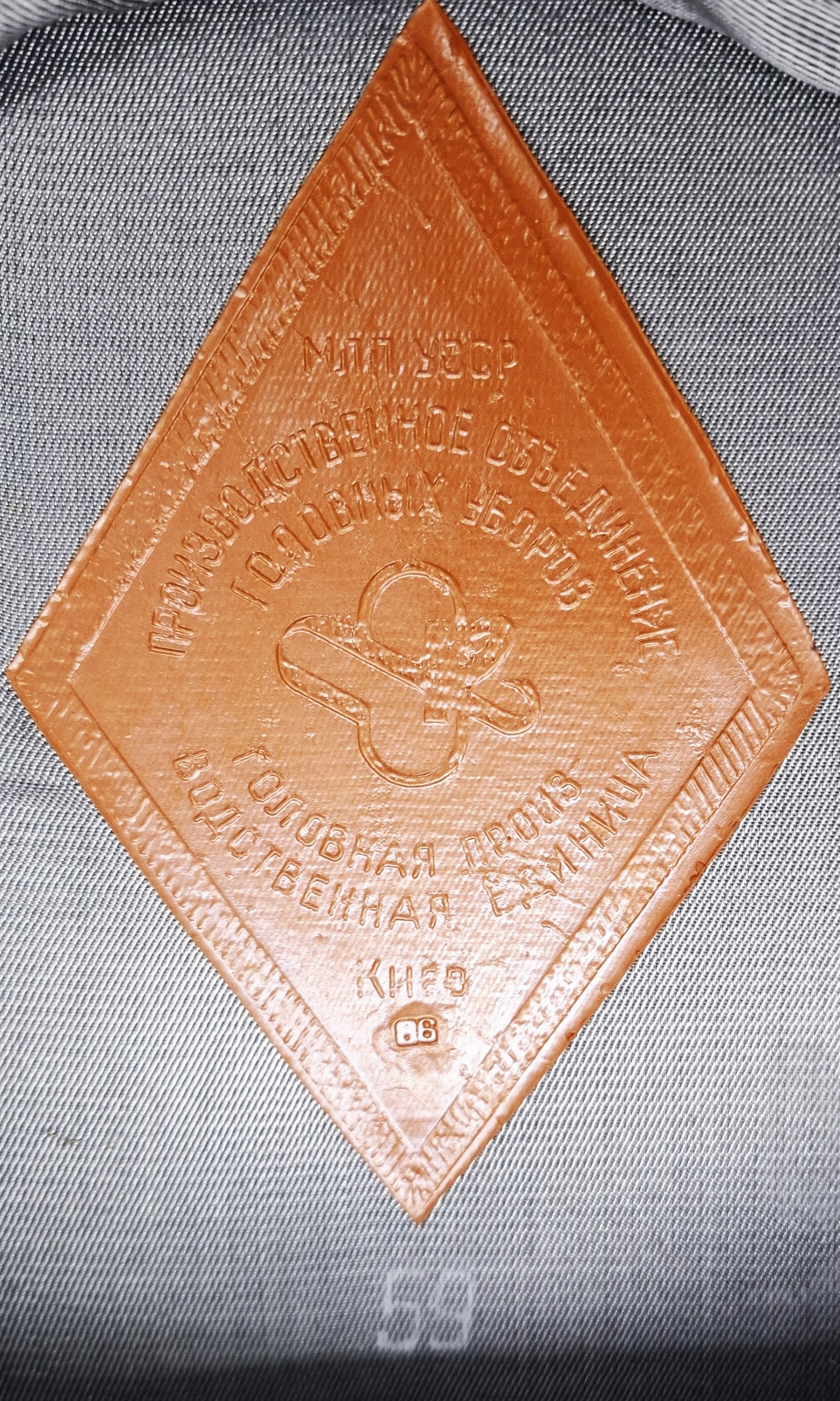 Materiał zasadniczy to gabardyna w kolorze ciemno-szarym. Kształt czapki przyjmuje formę okrągłą denka. Między dnem, a kwaterami zaszyta wypustka z czerwonego sukna. Podobnie między kwaterami i otokiem. W przednich kwaterach usztywnienie z gąbki i tworzywa?. Brak wietrzników. W całym wnętrzu znajduje się atłasowy materiał w jaśniejszym odcieniu materiału zasadniczego. Na środku wprasowana tworzywowa osłona denka. Denko usztywnione metalową taśmą. Potnik wykonany ze sztucznej skóry w kolorze szarym. Daszek czarny, wykonany z tworzywa sztucznego. Z góry gładki i błyszczący (lakierowany), od spodu nielakierowany - szorstki. Pasek podbródkowy w formie plecionego, złotego, dwuczęściowego sznurka. Przytwierdzony dwoma tworzywowymi złotymi guzikami z wizerunkiem pięcioramiennej gwiazdy, sierpem i młotem. Guziki wprawdzie mają uszko ale mocowane za pomocą metalowych wąsów. Usztywnienie otoku wykonane prawdopodobnie z grubego tworzywa sztucznego. Otok wykonany z czerwonego sukna, takiego jak na wypustkach. Na przodzie otoku aluminiowa odznaka - kokarda z godłem ZSRR w wieńcu z 10 liści wzoru M77 (lata 1977-1991), mocowana na metalowe wąsy.
