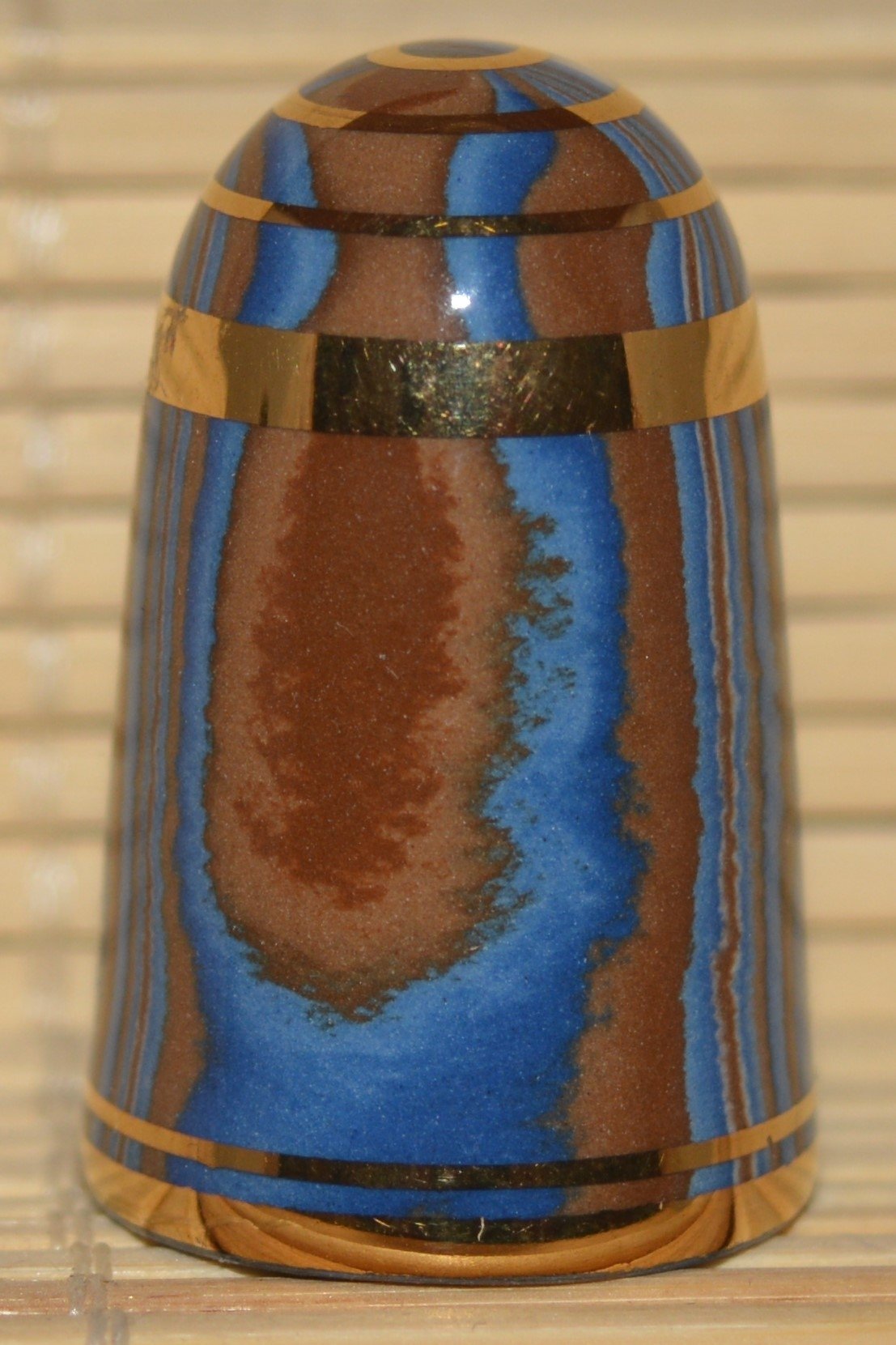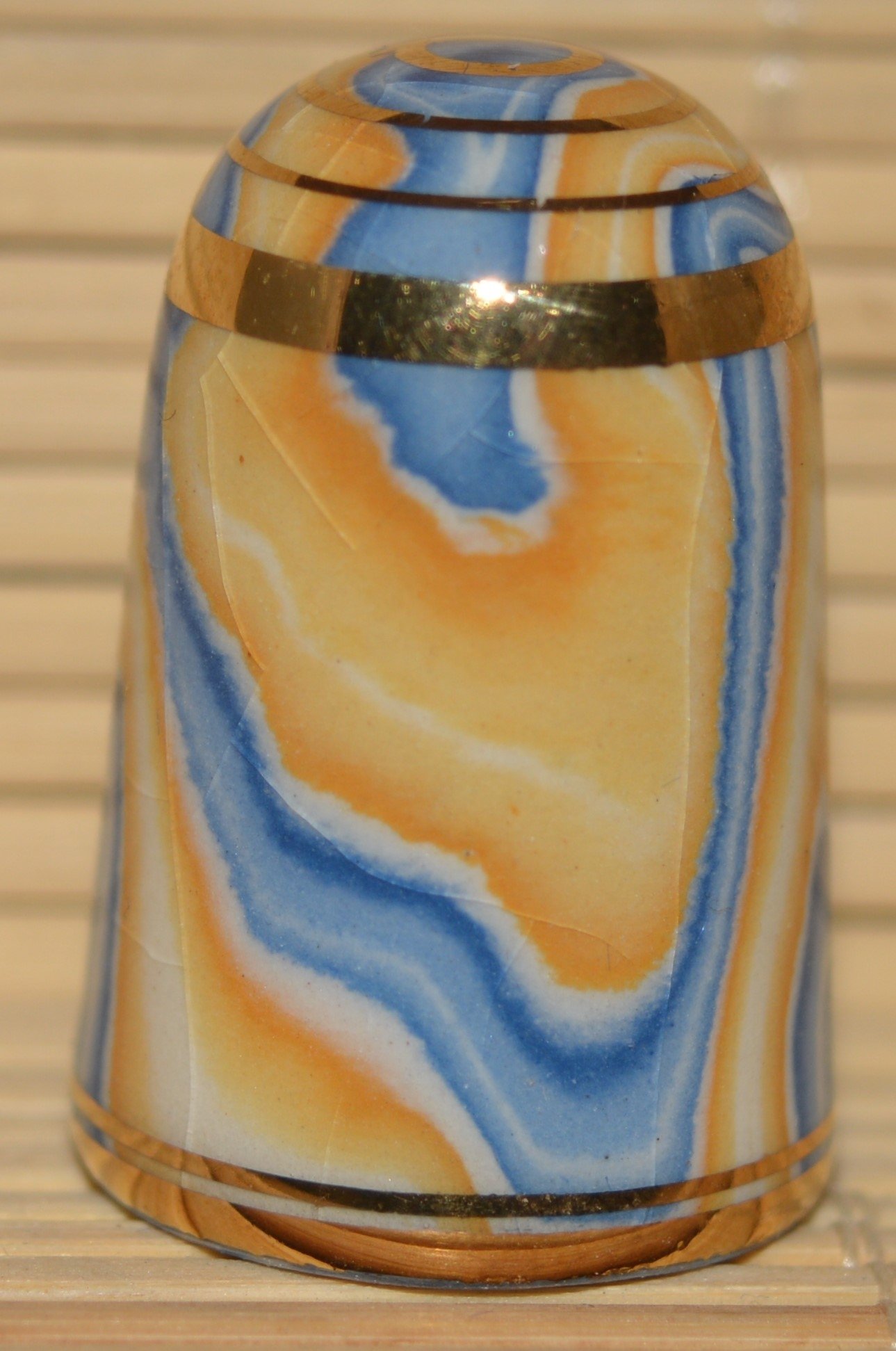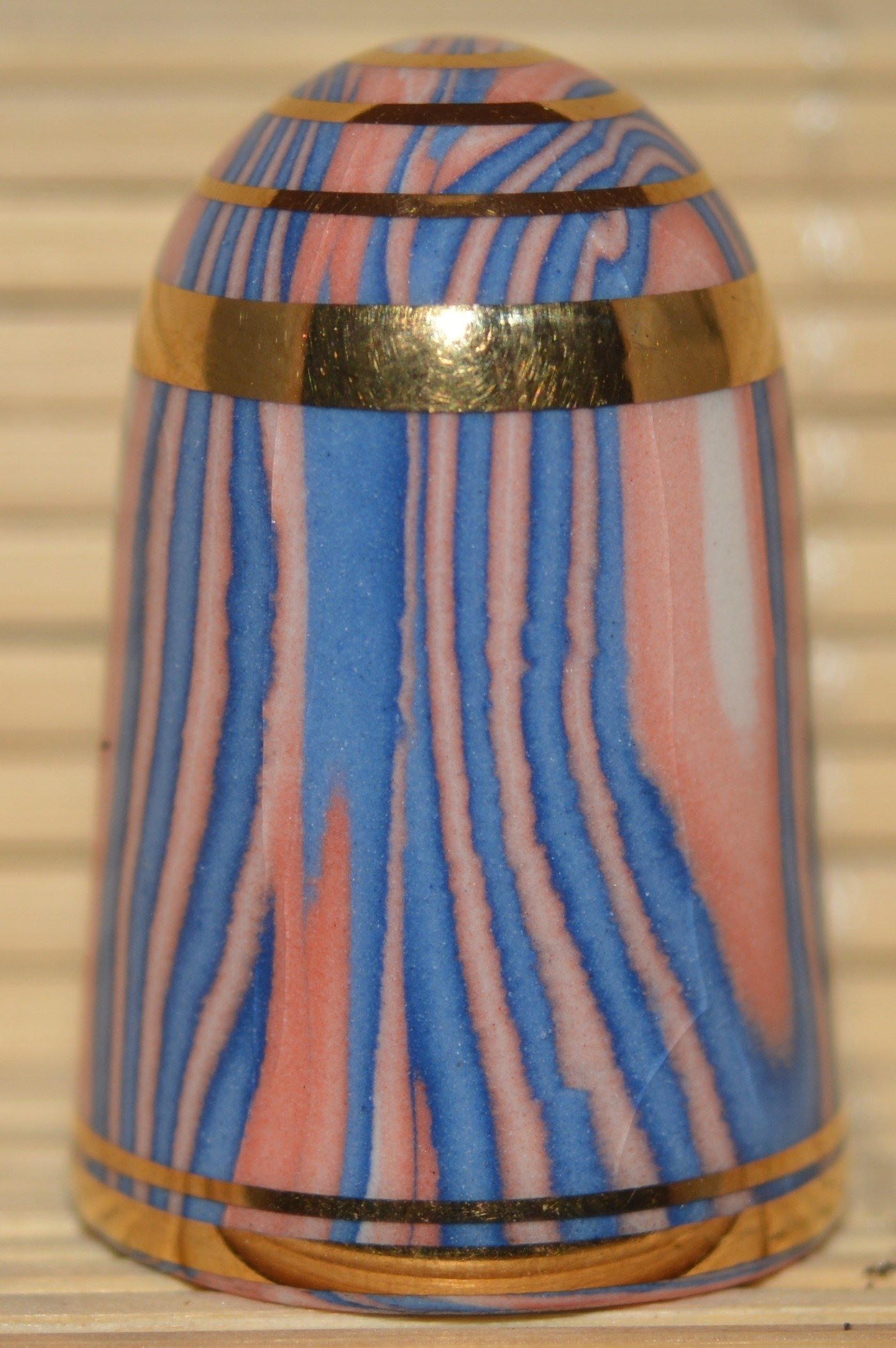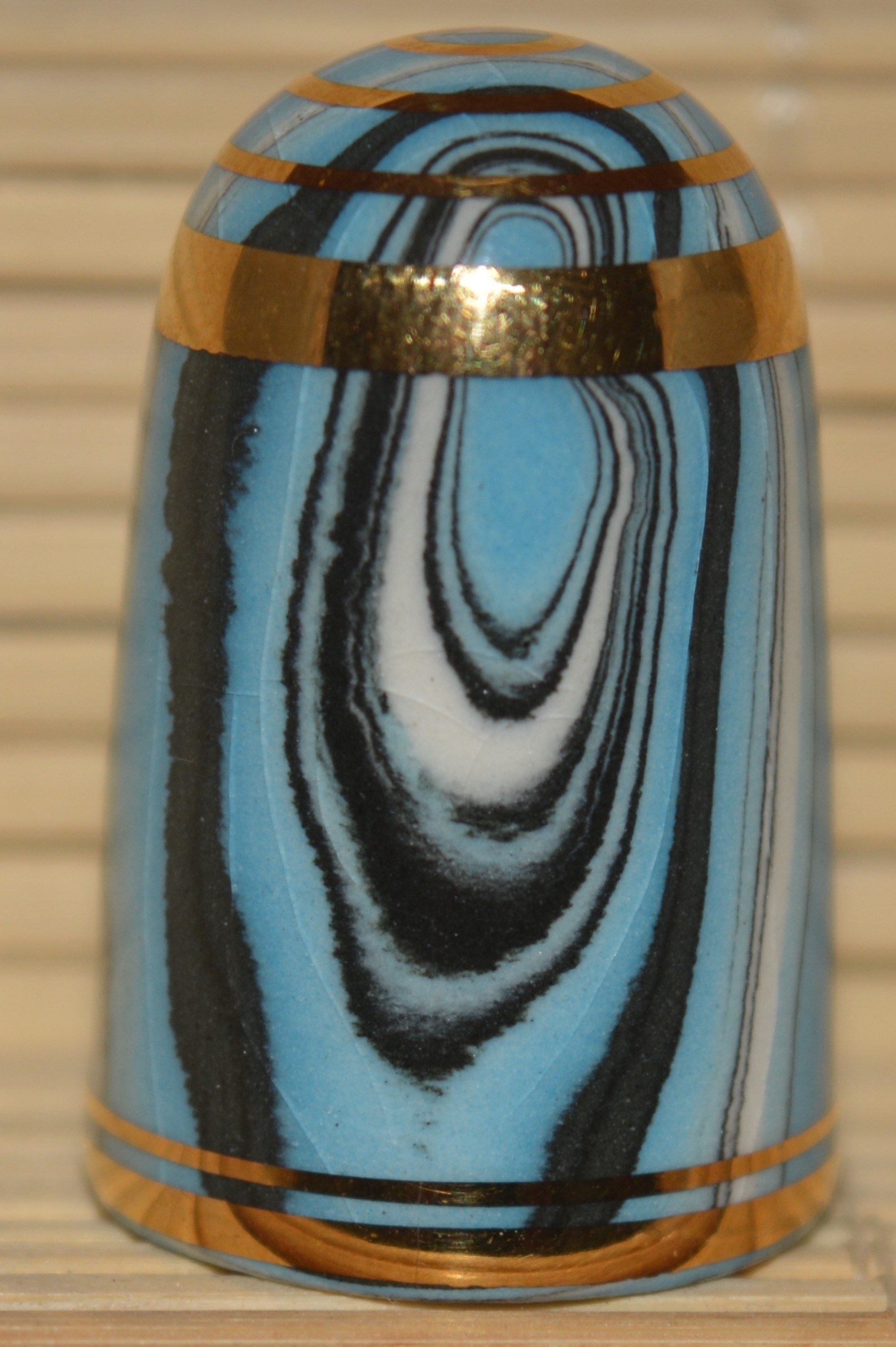 Agateware Tony Bouchet.Kolekcja naparstków wytworzona przez Tony Boucheta. Tony Bouchet stworzył materiał ceramiczny wyglądem przypominający naturalny agat a w rzeczywistosci jest to glina mieszana z tlenkami metali.Pierwsze wyroby z agateware powstały w 1984 r. Po wycofaniu się z biznesu w 2011 roku Bouchet zniszczył wszystkie materiały , receptury i sprzęt. Naparstki Tony Boucheta są unikatowe.