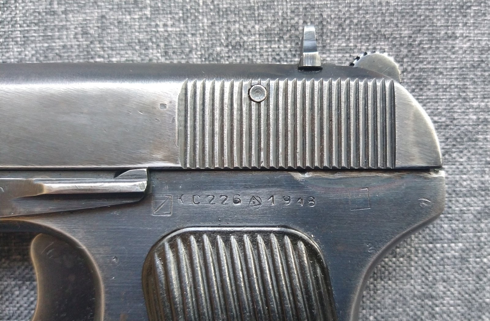 Opis eksponatu: Pistolet TT-33 numer seryjny KS225 (cyrylicą: KC225), wyprodukowany w Iżewsku w drugiej połowie maja 1948 (pierwsza litera w numerze seryjnym - "K" oznacza produkcję z maja, druga oznacza kolejność bloku serii produkcyjnej). Pistolet musiał być intensywnie eksploatowany, gdyż w latach późniejszych przeszedł remont w I Arsenale GRAU w mieście Bałaklija (położonym na Ukrainie, na południowy wschód od Charkowa), co zostało potwierdzone biciami Arsenału i specyficznych prób odbiorczych po remoncie. Broń o zaskakująco wysokiej jakości wykonania, zwłaszcza w porównaniu np. z pistoletem wojennej produkcji z roku 1944.
