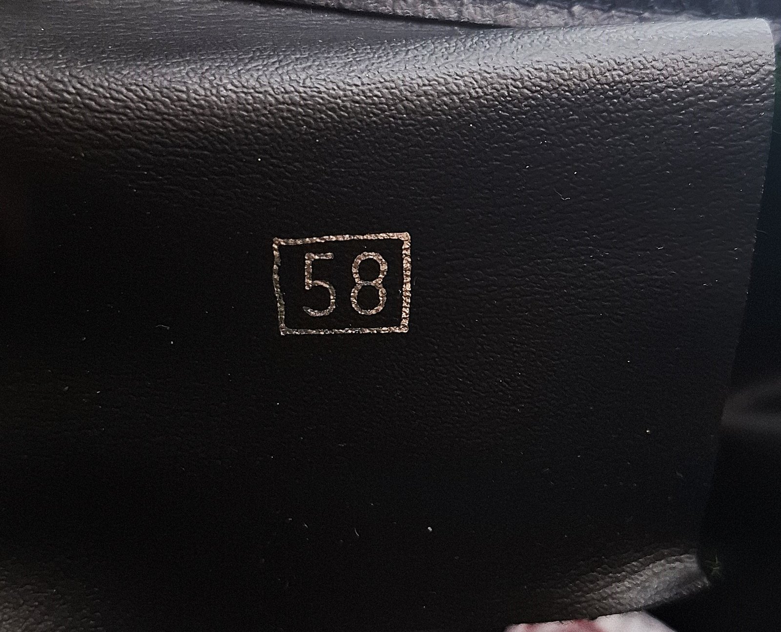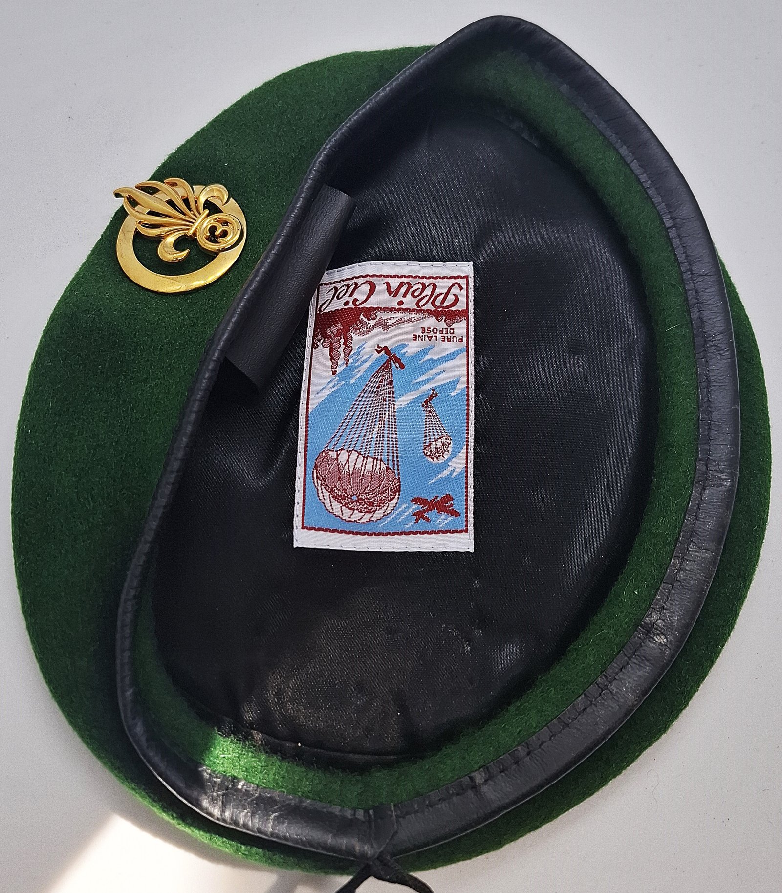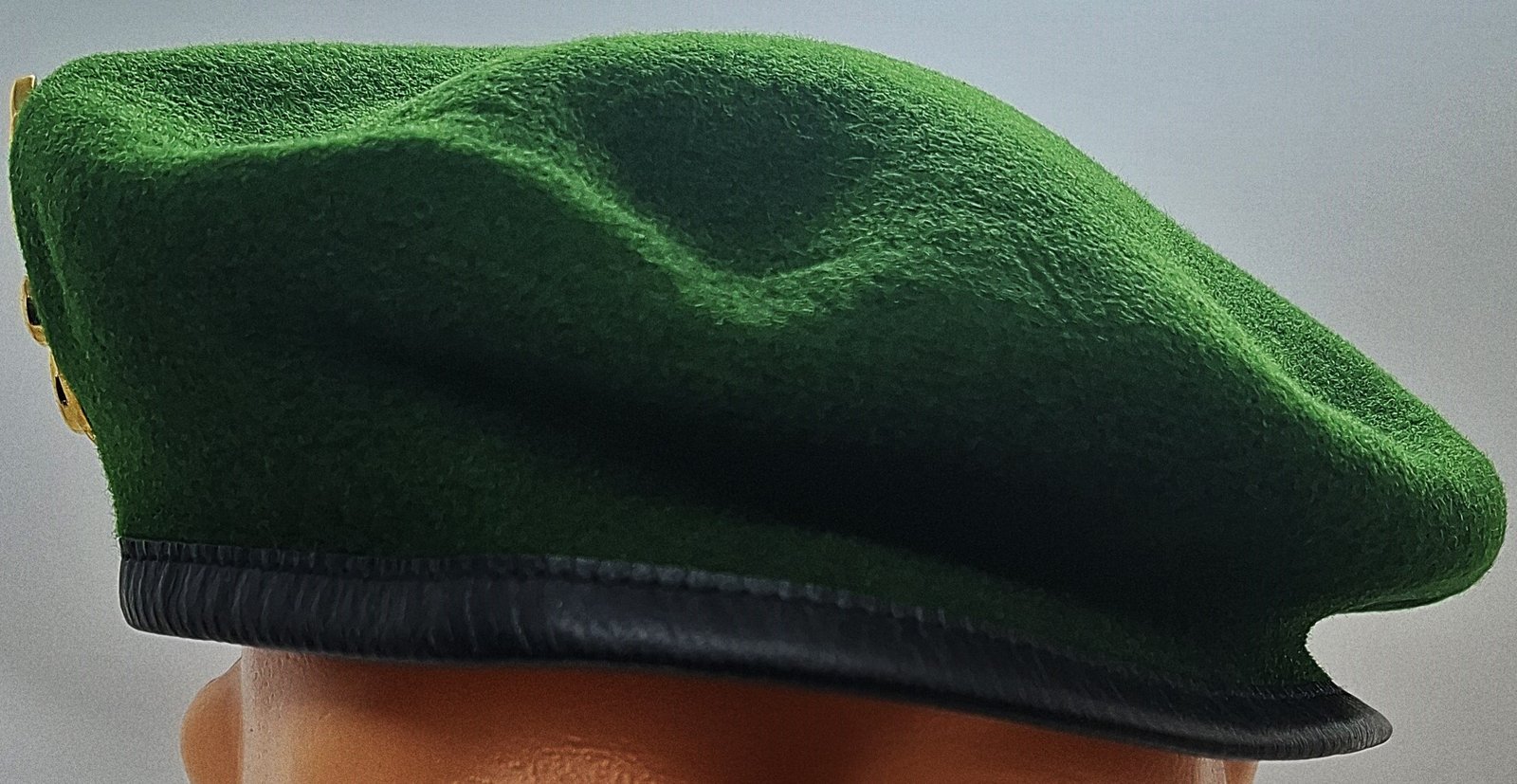 Beret tłoczony. Denko wyłożone podszewką. Na środku wszyta metka. W miejscu odznaki brak usztywnienia. Osłona zaczepu odznaki ze skóry. Lamówka skórzana z materiałową taśmą do regulacji rozmiaru.