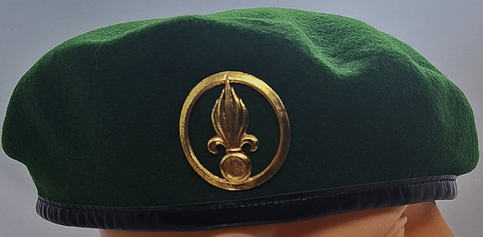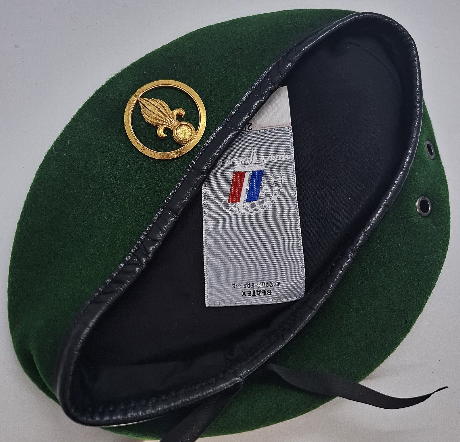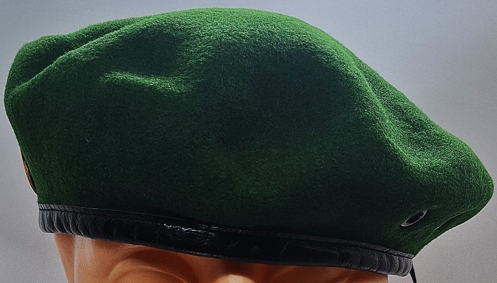 Beret tłoczony. Wnętrze wyłożone podszewką. Na środku wszyta metka. W miejscu odznaki usztywnienie ze skóry. Lamówka skórzana z materiałową taśmą do regulacji rozmiaru.