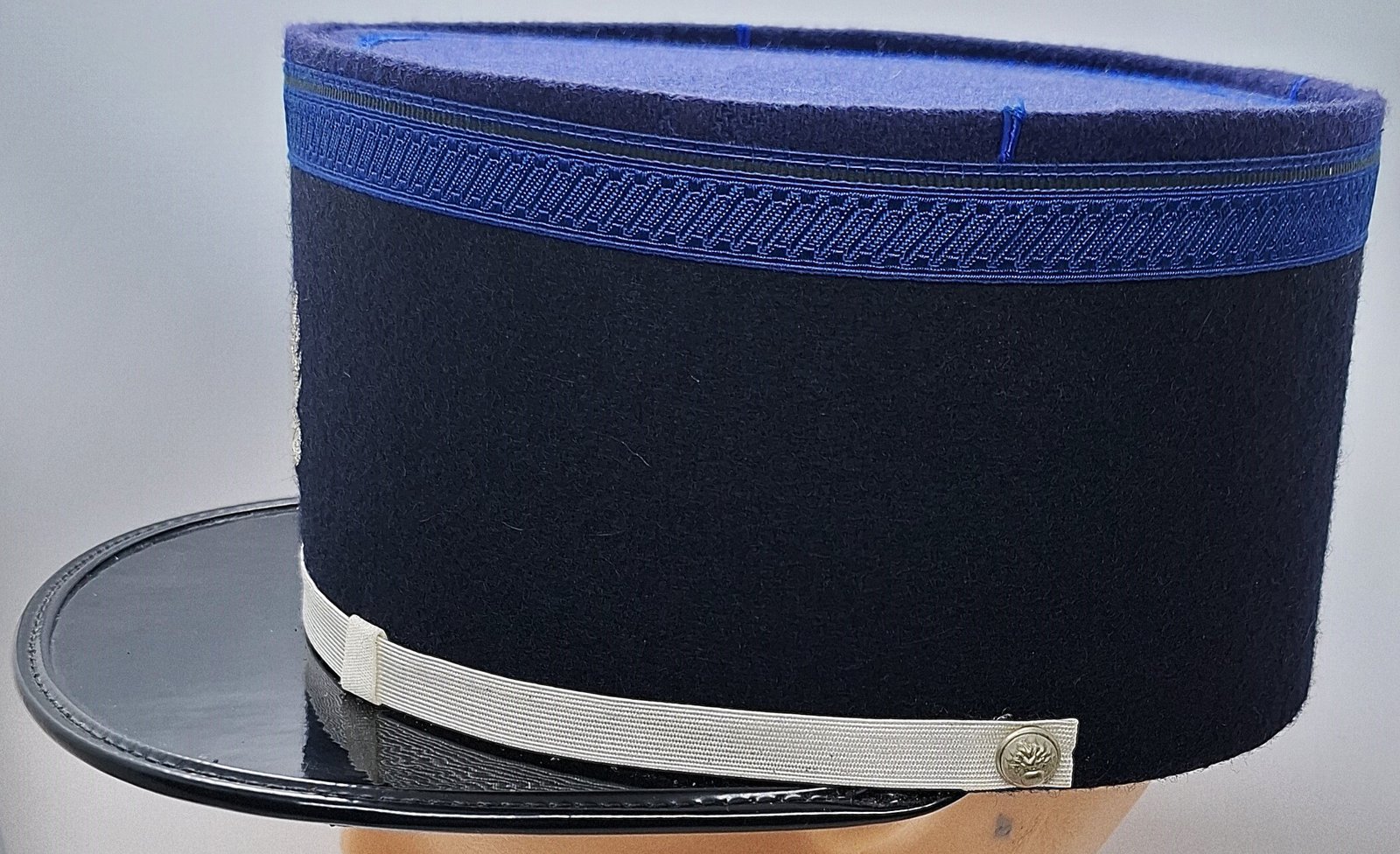 Kepi żandarmerii. Srebrny pasek pod brodę, gorejący granat i niebieski elitarny galon wskazują na Gendarmes Adjoints Volontaires - GAV.