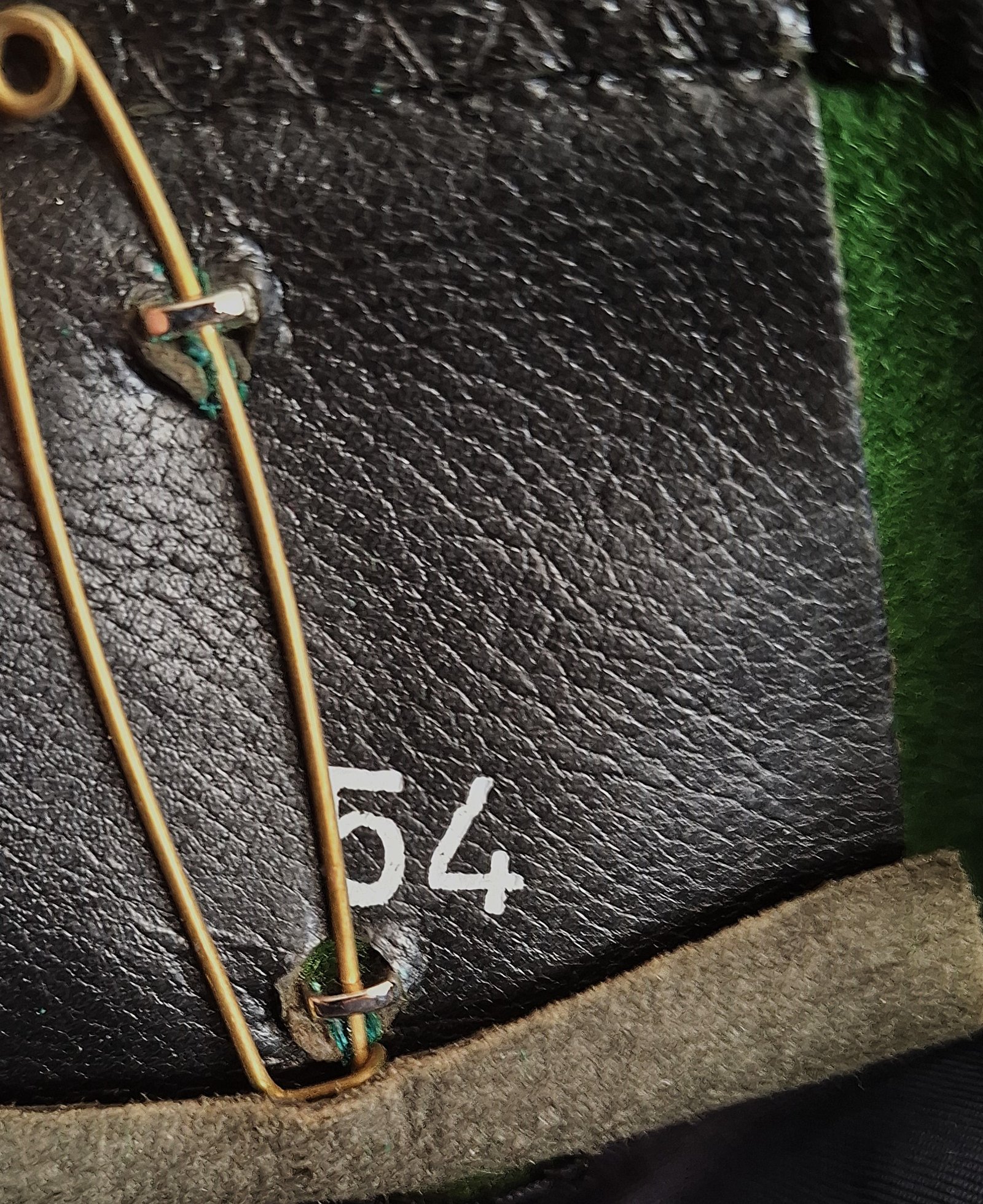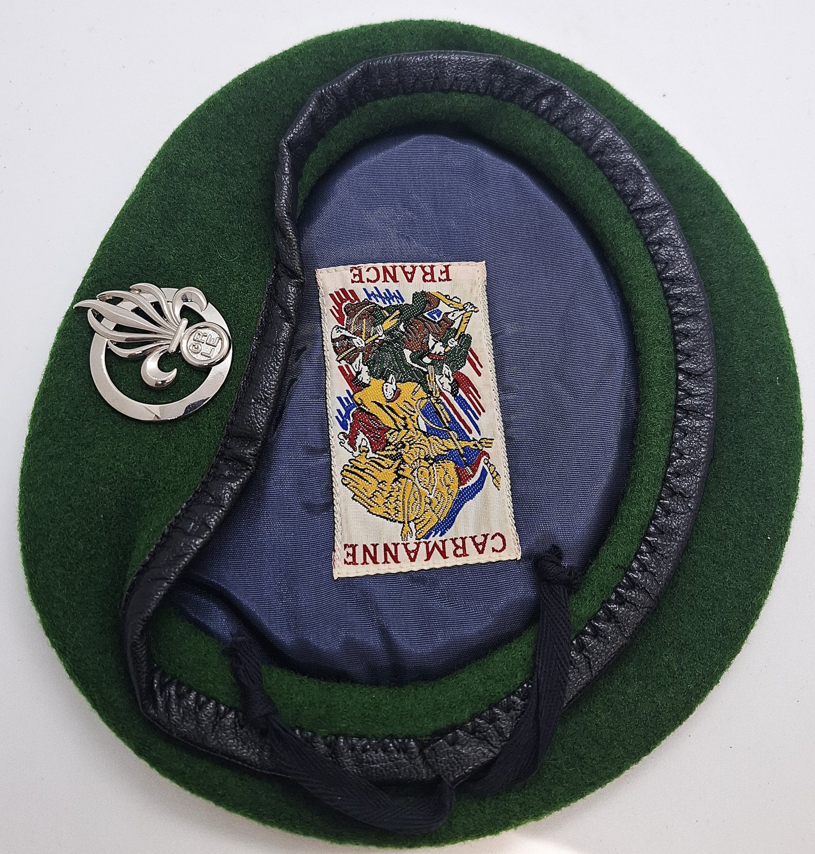 Beret tłoczony. Denko wyłożone podszewką. Na środku wszyta metka. W miejscu odznaki brak usztywnienia. Osłona zaczepu odznaki ze skóry. Lamówka skórzana z materiałową taśmą do regulacji rozmiaru.