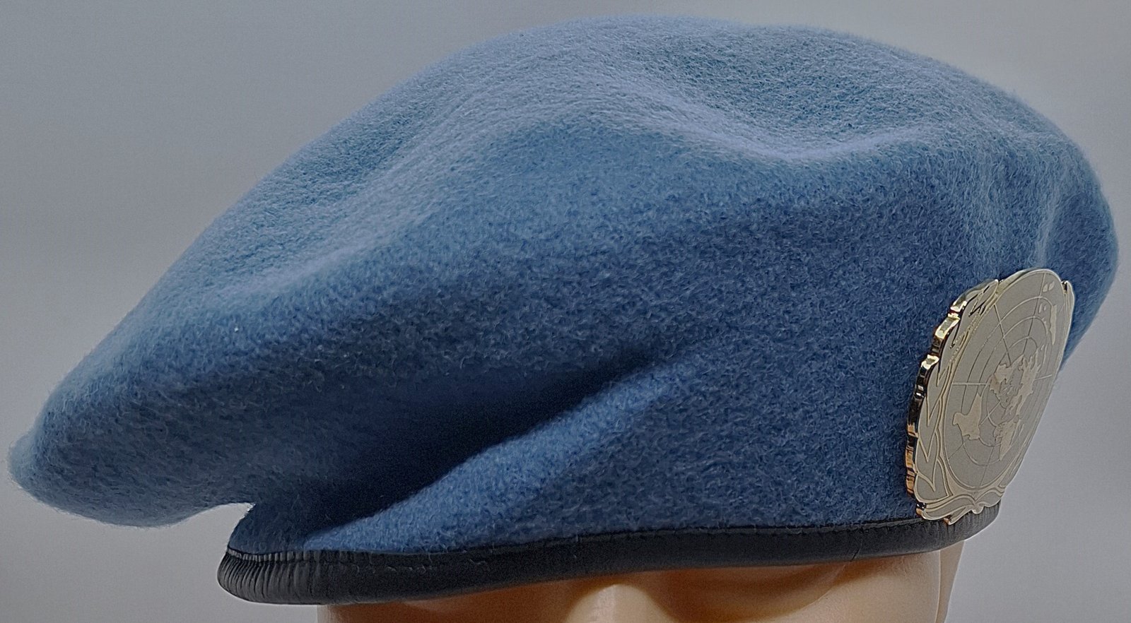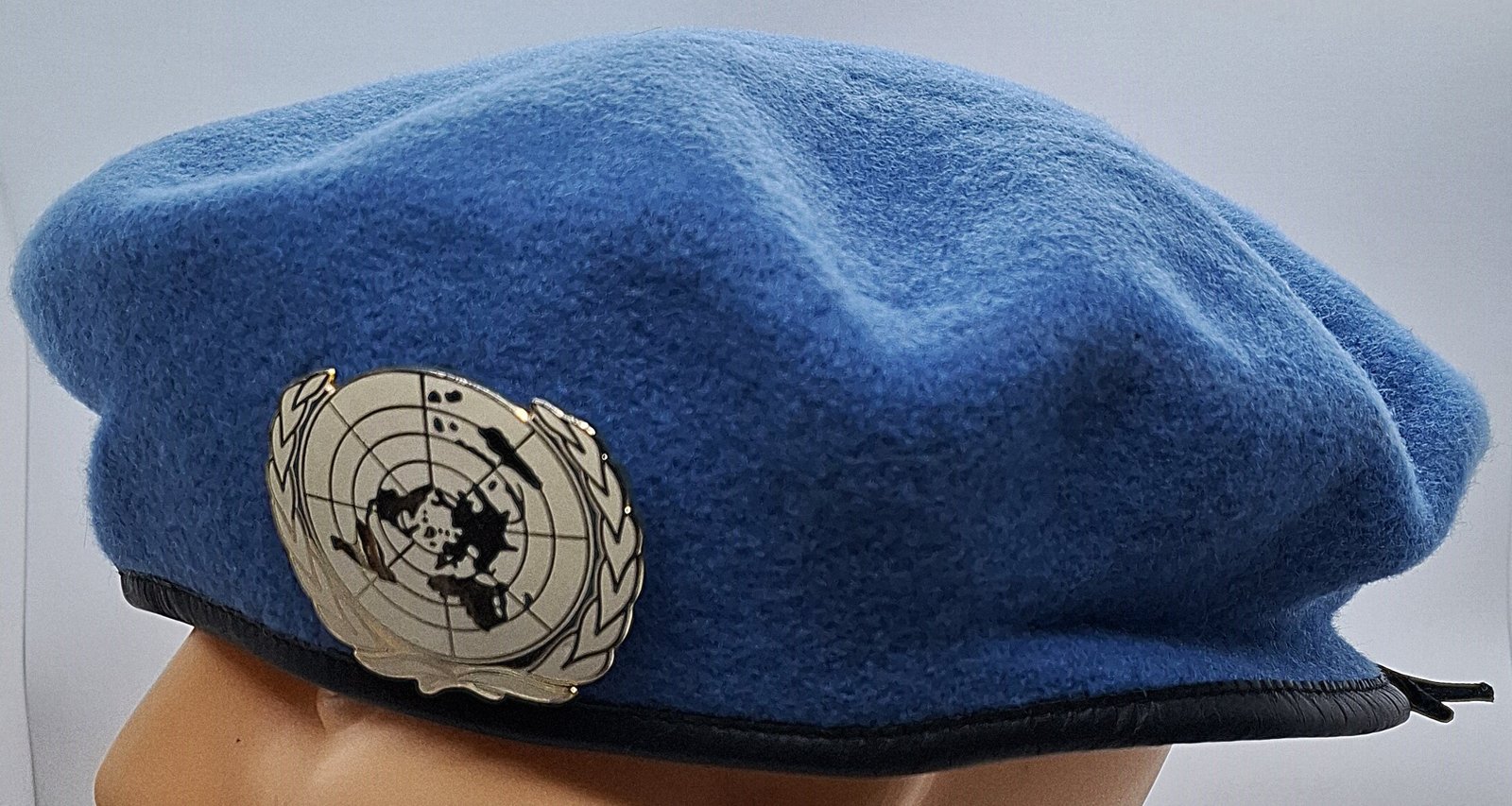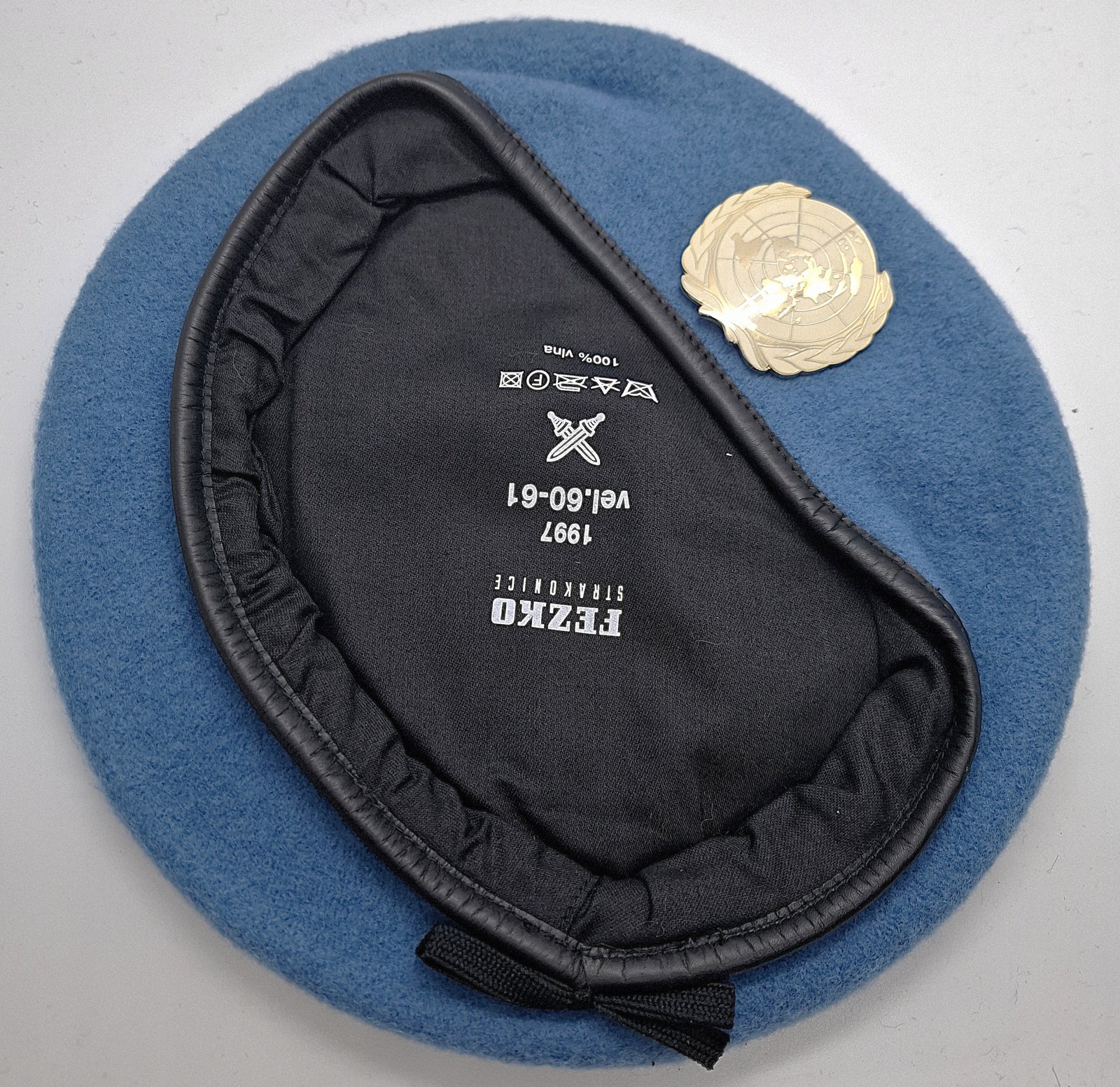 Beret tłoczony, wełniany, jasnoniebieski. Wnętrze wyszyte podszewką materiałową w kolorze czarnym. Lamówka wykonana ze skóry. Wewnątrz materiałowa taśma do regulacji rozmiaru. Dwa wywietrzniki z oczek szewskich lakierowanych na czarno. Odznaka przypinana na igłę z obrotowym zamknięciem. Pod odznaką pólokrągłe usztywnienie. Na podszewce stempel producenta, daty i rozmiaru.